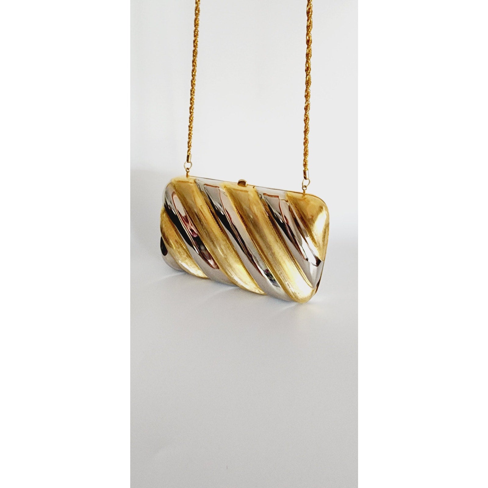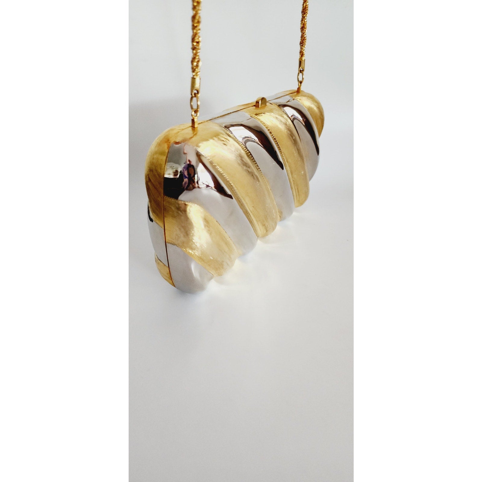 High statement shoulder bag with a gold-toned strap in twisted metal, the body is a hard metal case in a rectangle It is shaped out of curved, diagonal panels in alternating gold and silver with the silver being highly reflective. Opens on a hinge, interior is lined in brown felt. No labels. *Note that you can easily hide the chain strap inside the purse and it converts into a clutch!