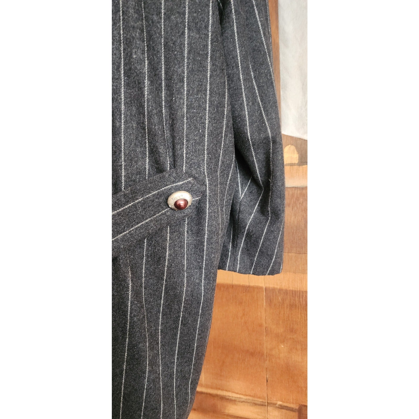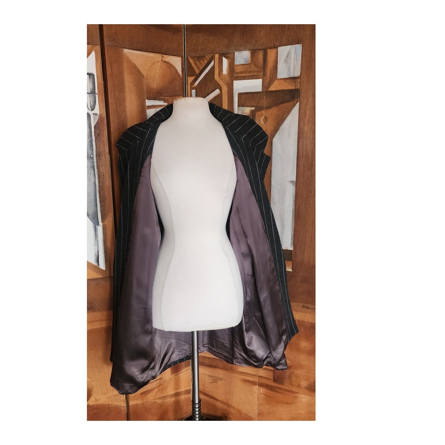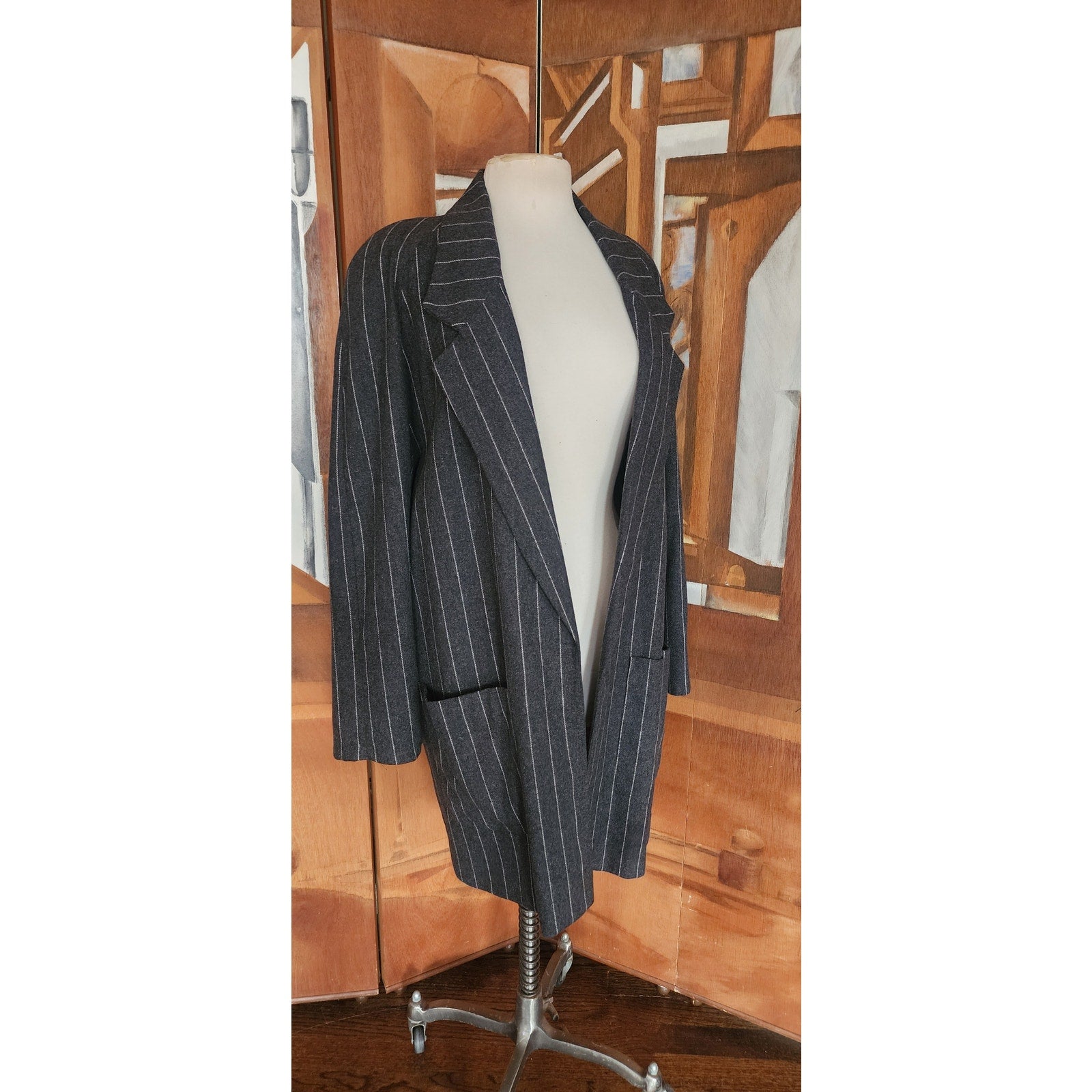 Features an oversized silhouette typical of 80s tailoring, padded shoulders, a notched lapel, fold-down collar, and a pinstripe pattern on gray wool. Pockets at the hips. Fully lined.