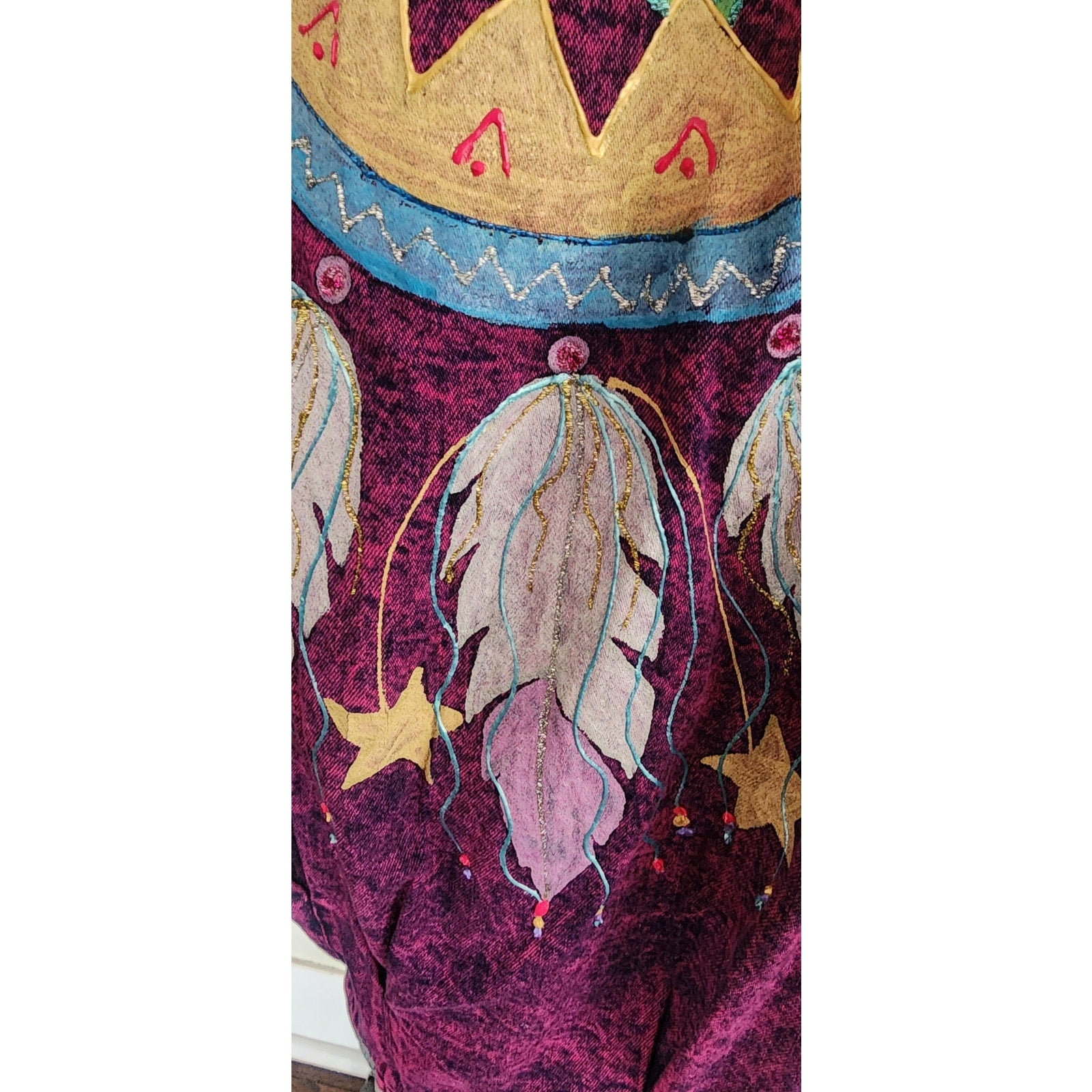 This jacket is part of the late 80s/early 90s trend of "Art to Wear" often in the southwestern styles and traditions. Note the unique acid wash finish and the embroidered meets hand-painted Native American-inspired design of dreamcatcher and feathers across the back. Features shoulder pads and an open front. Raglan cut shoulders create that slouchy look!