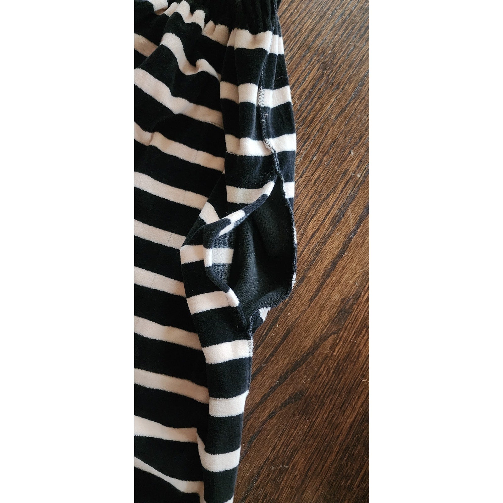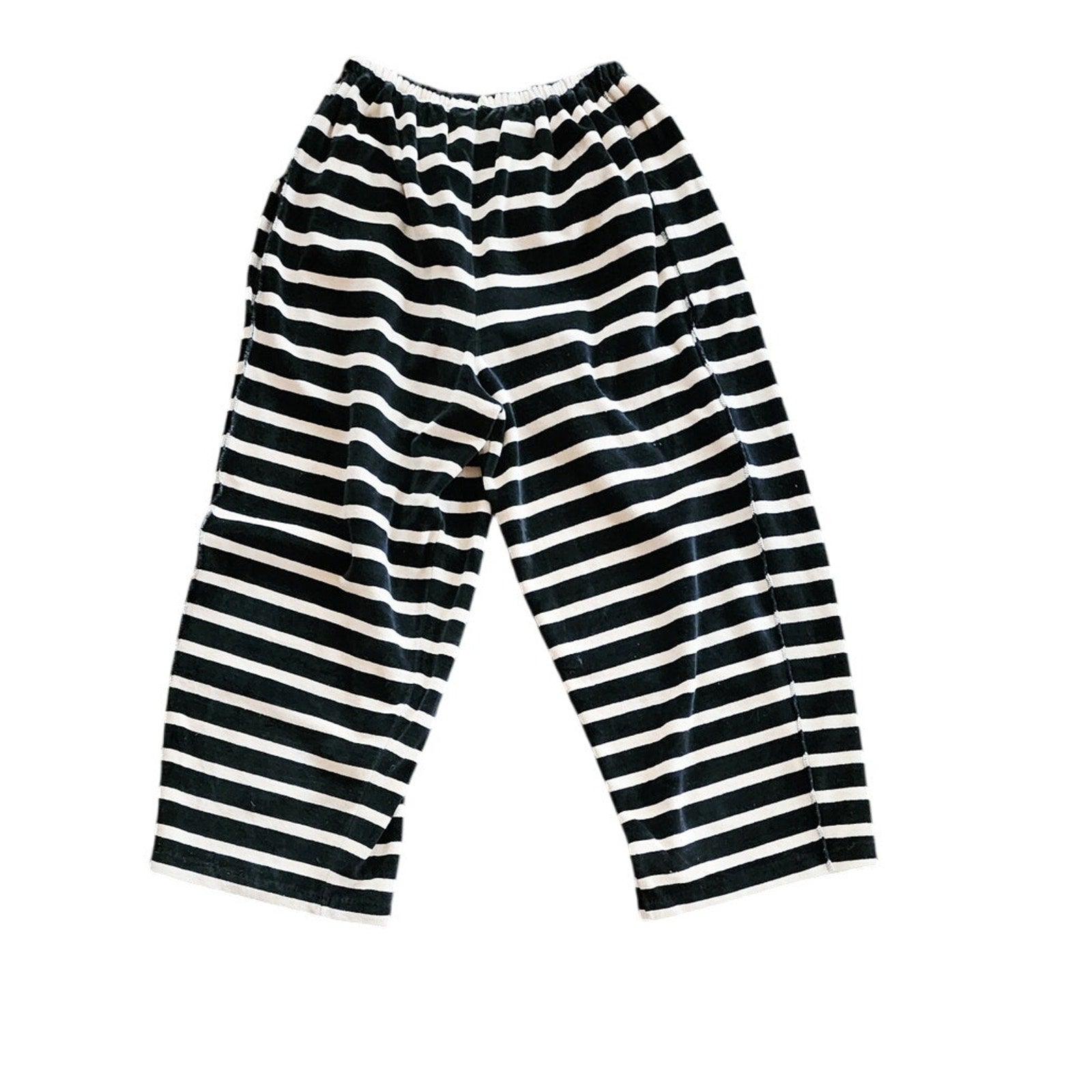 Black and cream striped velour pants with an elastic waist. The material has a soft, plush, velvet-like texture. There are slit pockets at the hip fronts. Legs are wide and cropped. Side seams are thick and appear as chunky trim along the exterior length of the pant. Unlined.