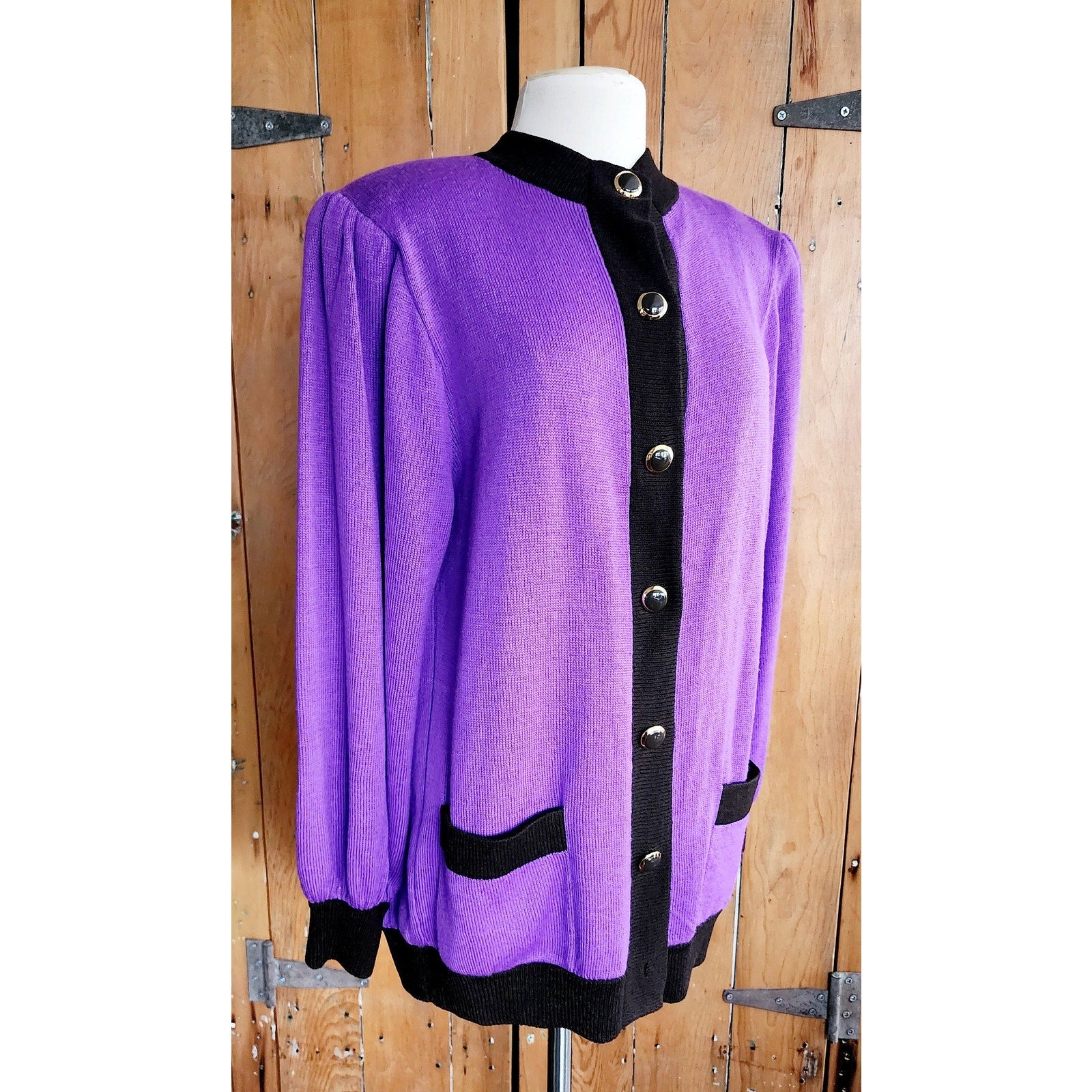 Hip length knit jacket in a bright purple with dark brown (looks black in certain light) tri around the collarless neckline, the button down front, the sleeve cuffs, the slit pockets and hem. Long sleeves are slightly puffed at the shoulders, sit on top of shoulder pads. Loose silhouette with some gentle pleating across the back. Unlined.
