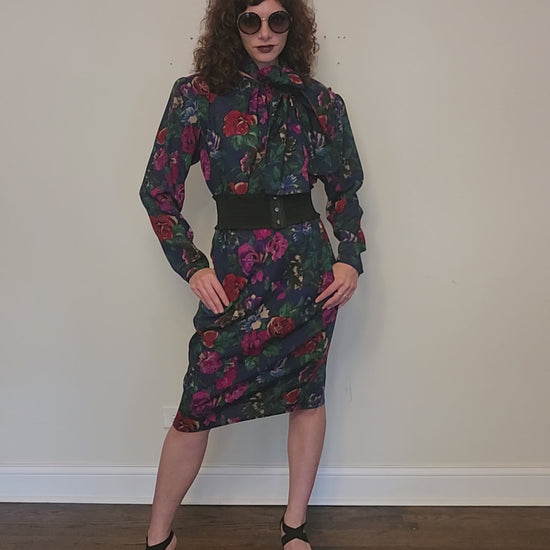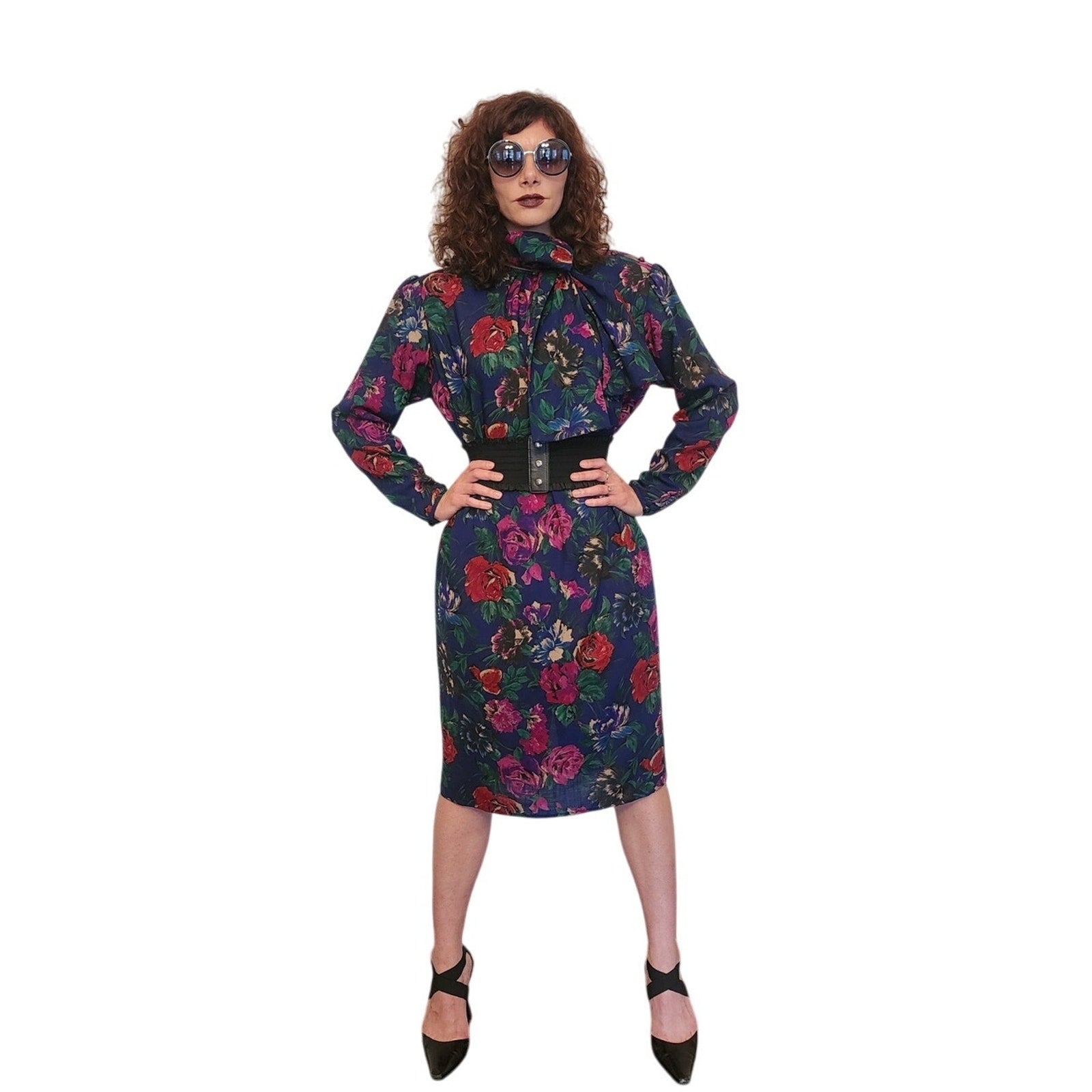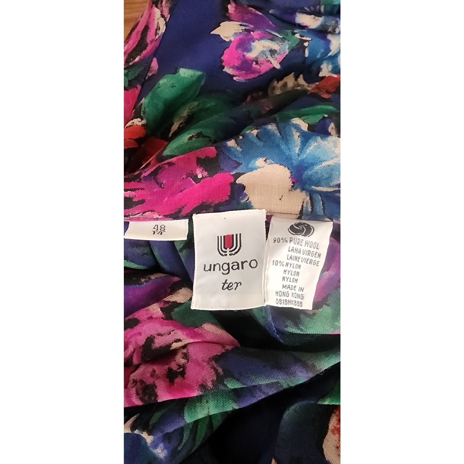 Vintage 80s UNGARO Sac Dress Dark Floral Print Wool w/Sash Necktie / M