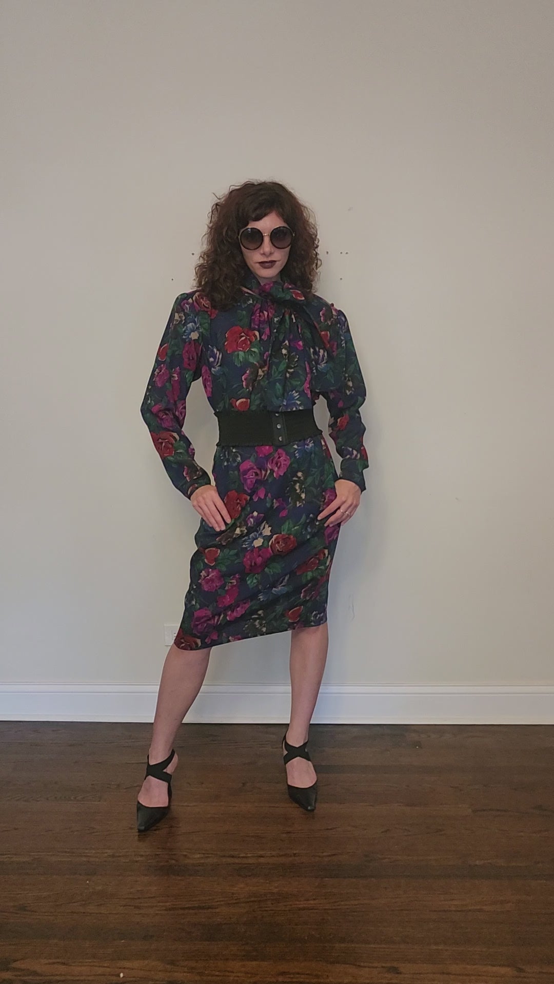 Vintage 1980s UNGARO Sac Dress Dark Floral Print Wool w/Sash Necktie / M
