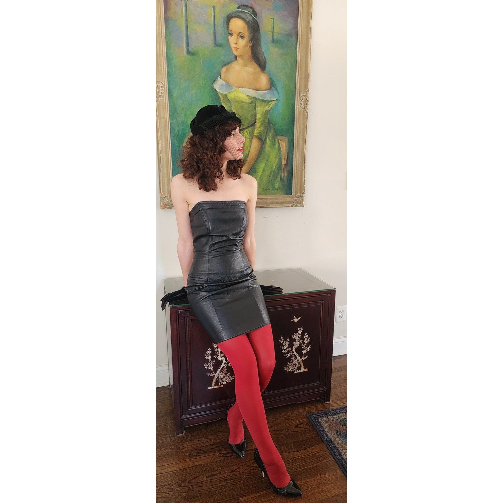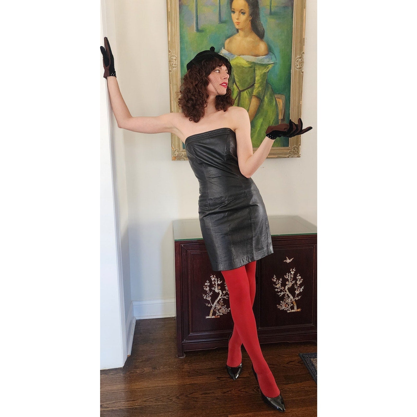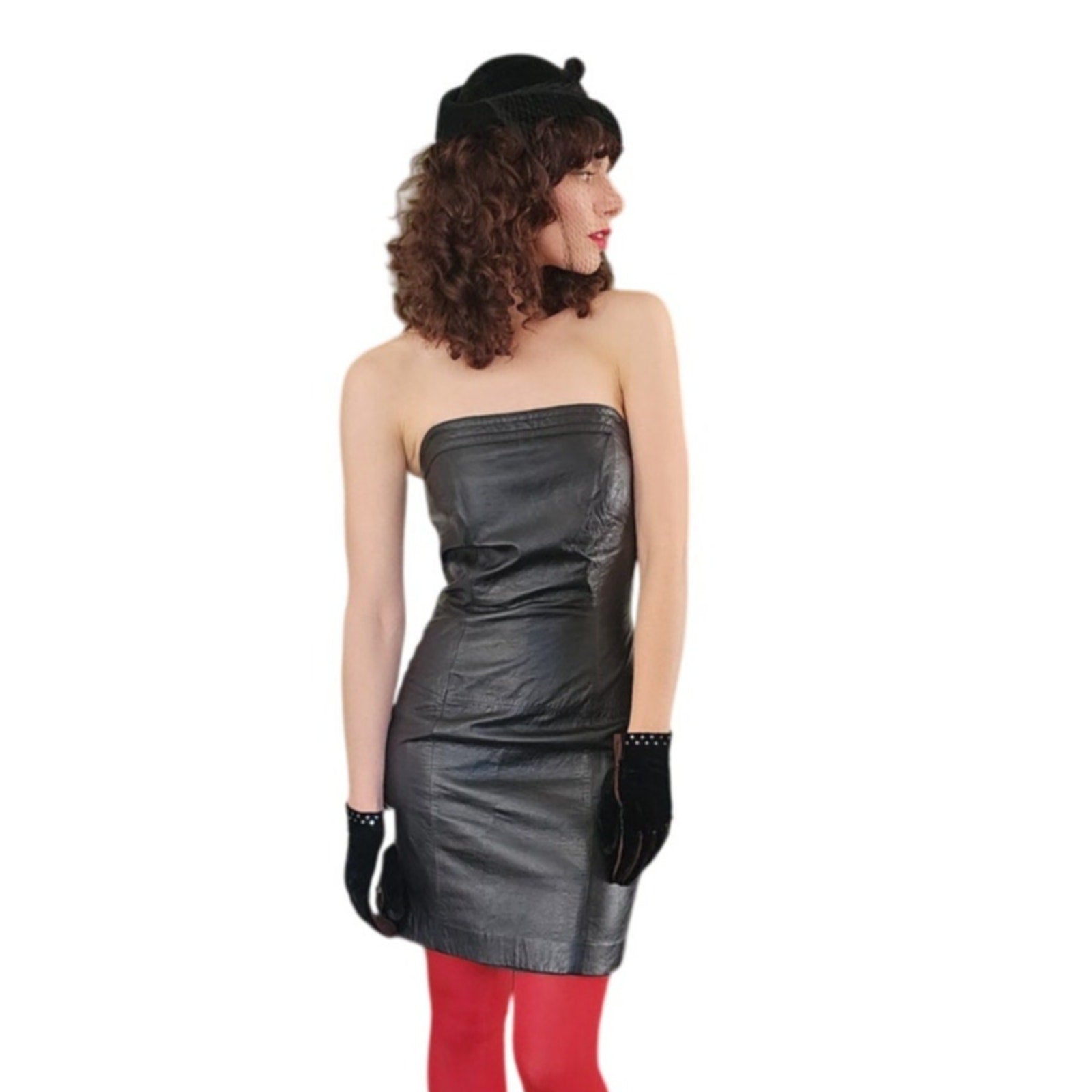 Vintage 90s Black Leather Strapless Dress Bodycon August Silk / S