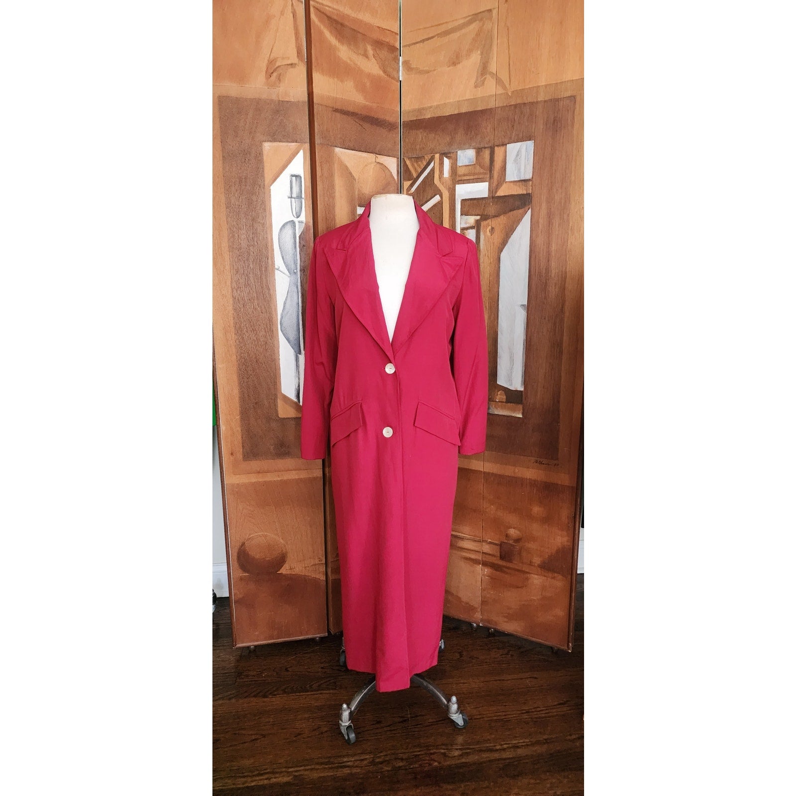 Lightweight coat perfect for Spring. Features padded shoulders and a large, notched, fold-down collar. Front closure has two, large white buttons to contrast with the solid burgundy red. Slit pockets at the hip fronts complete the look. Lined interior.
