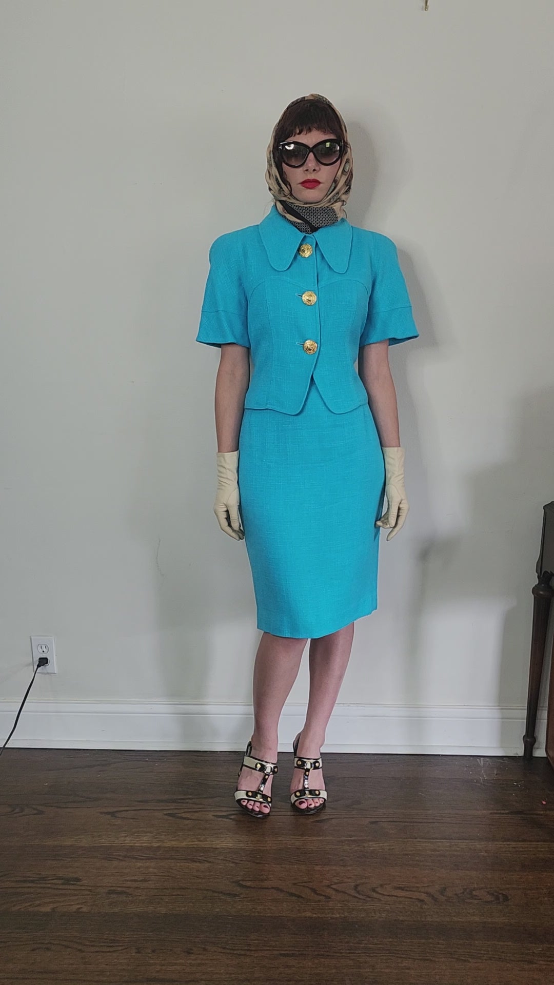 Exquisitely tailored summer skirt suit in matching turquoise blue. The short sleeved blazer is fitted with a fold down collar, padded shoulders and large, gold embossed buttons down the center for closure. Matching skirt is high waisted, knee length and closes with a button-fly. Both pieces fully lined.