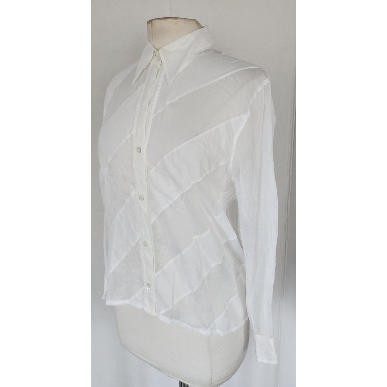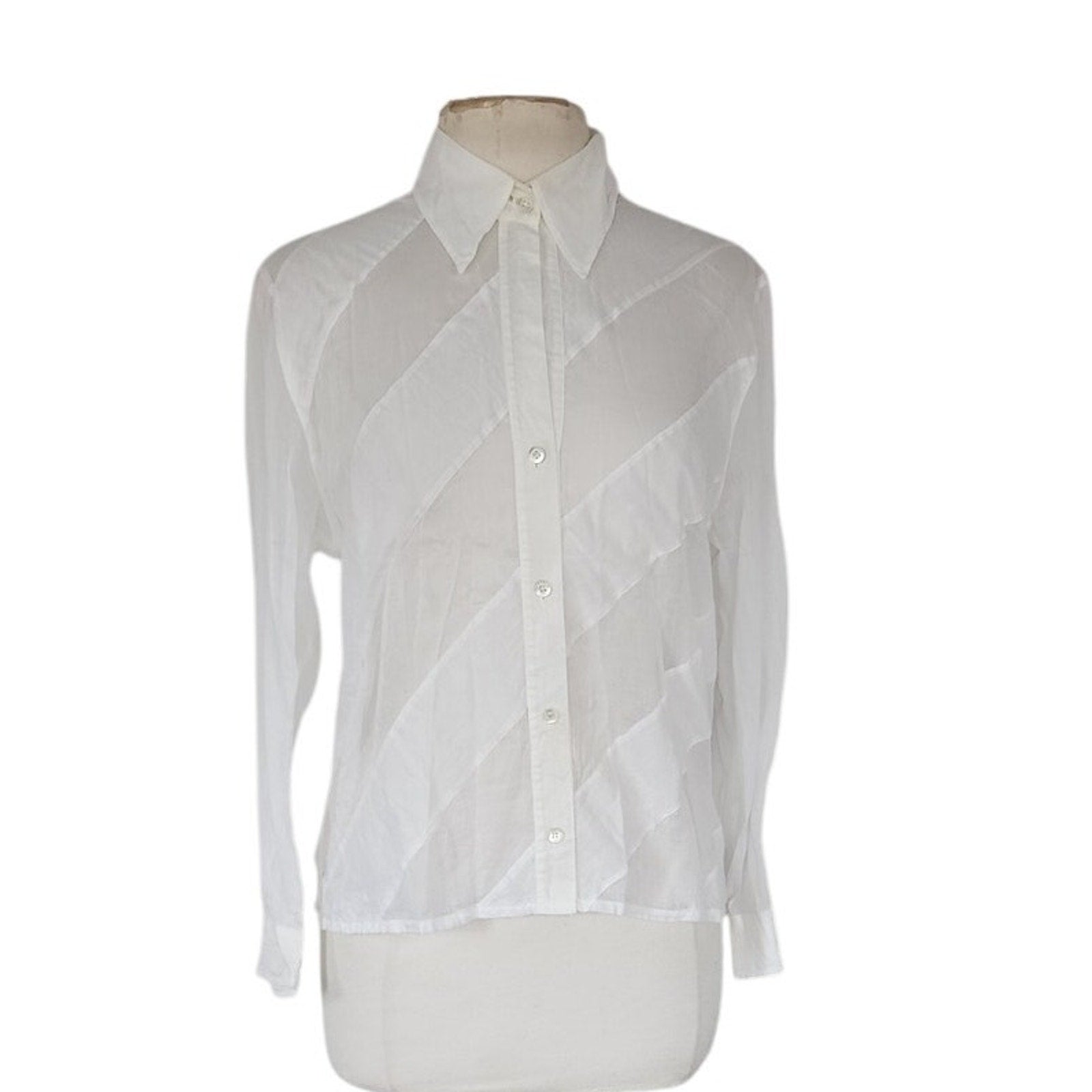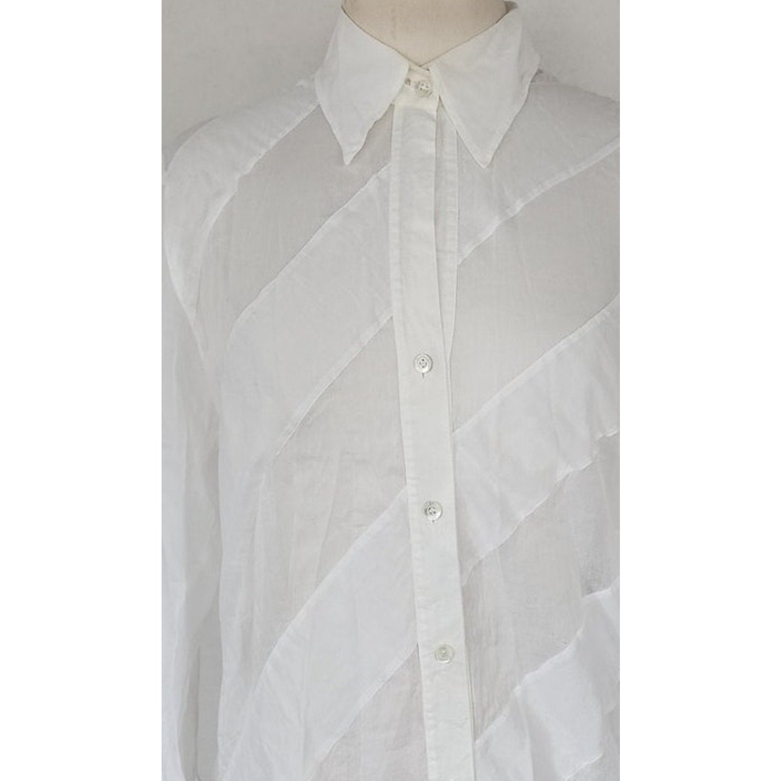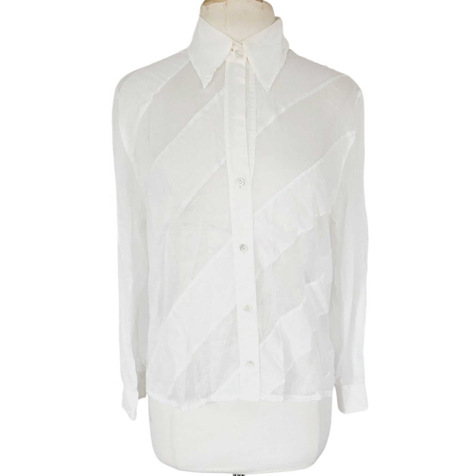Extra soft and lightweight button down in white with diagonal stripe panels alternating between a semi sheer and a solid matte cotton panel. The small pointy collar folds down and the long sleeves have buttoned cuffs.