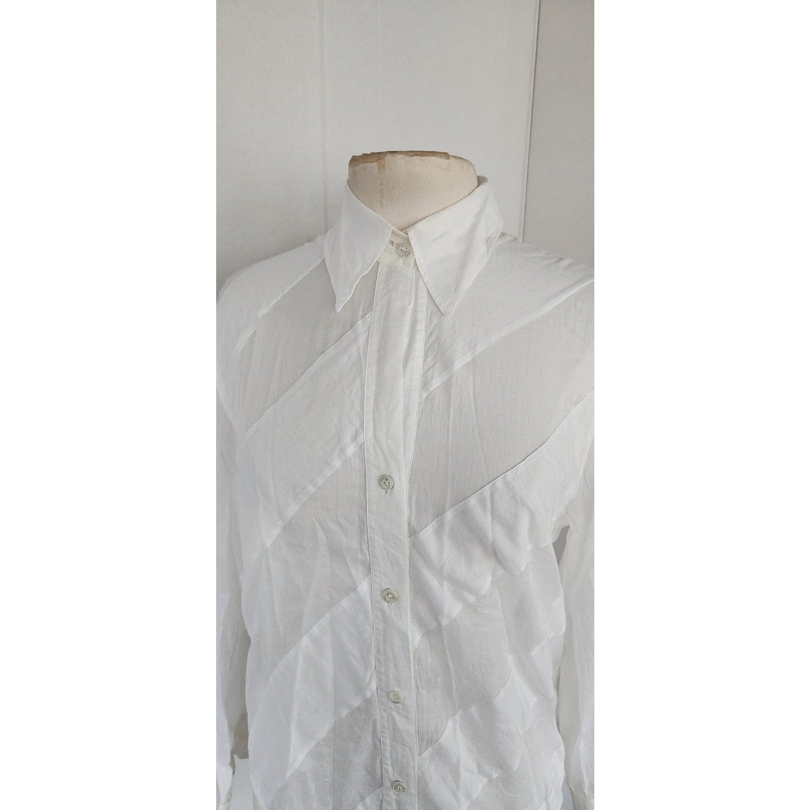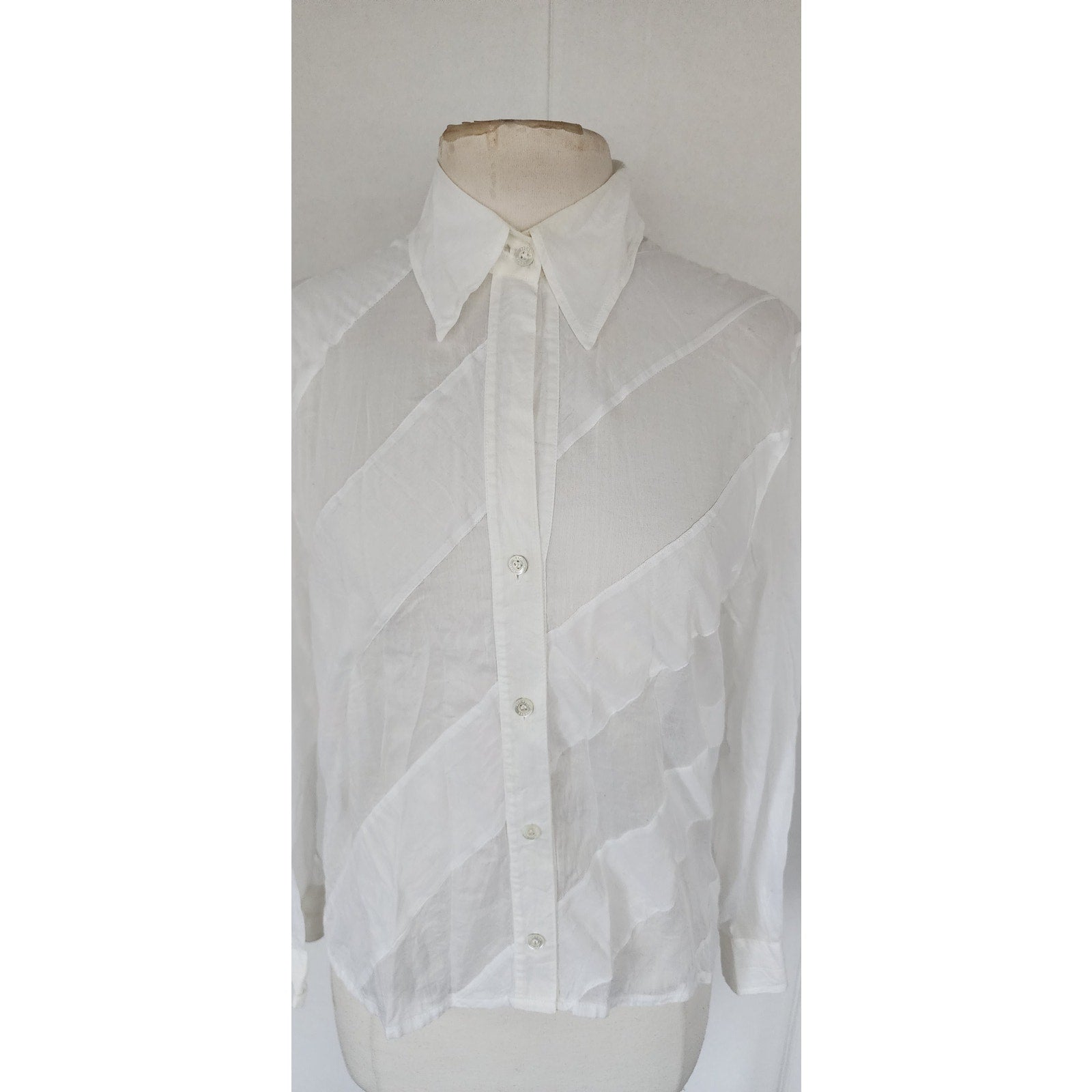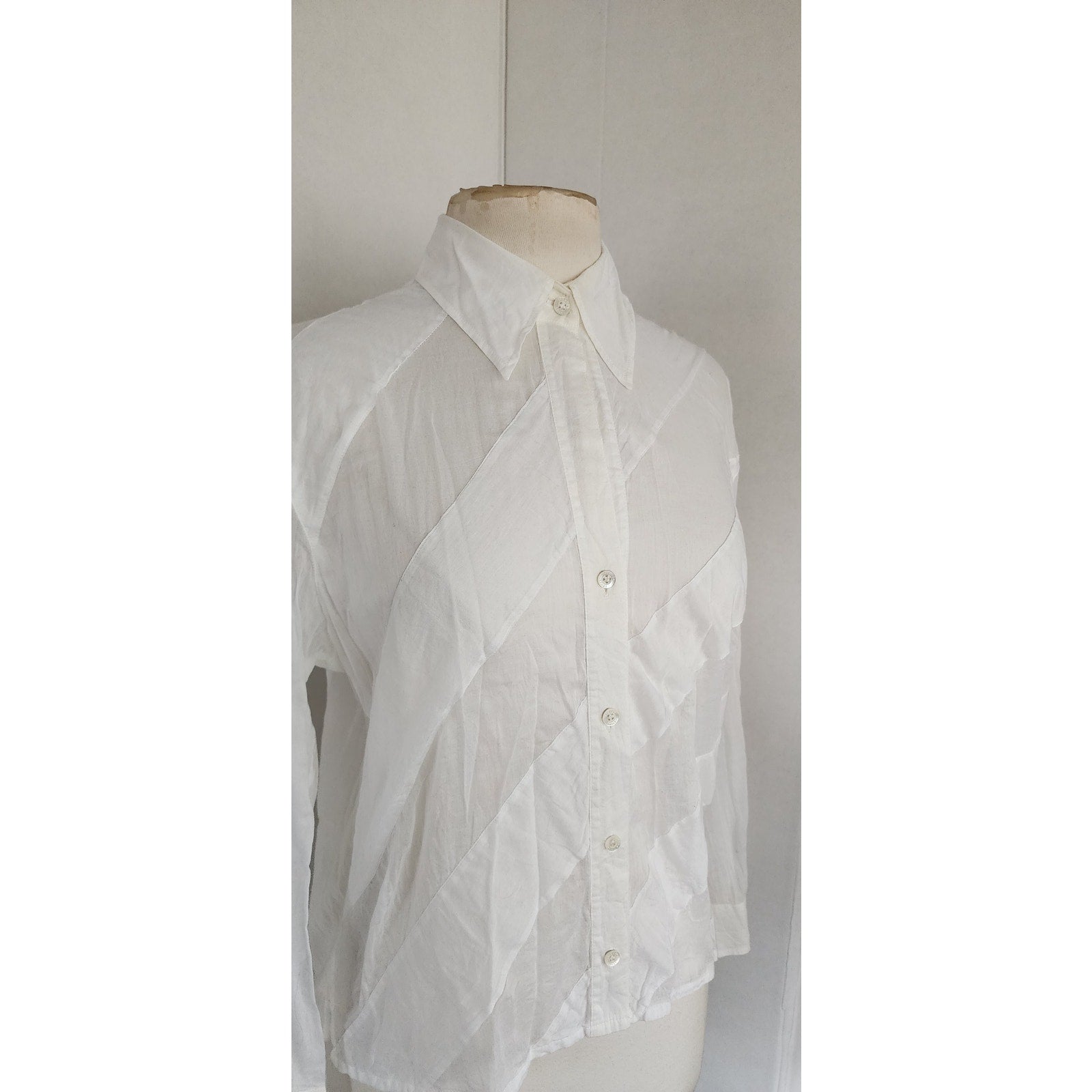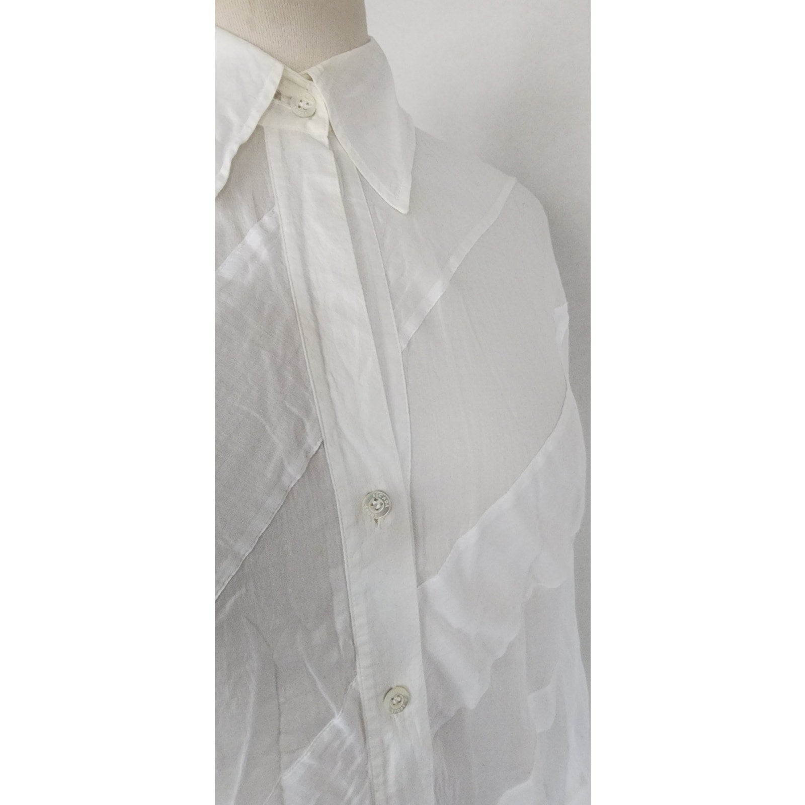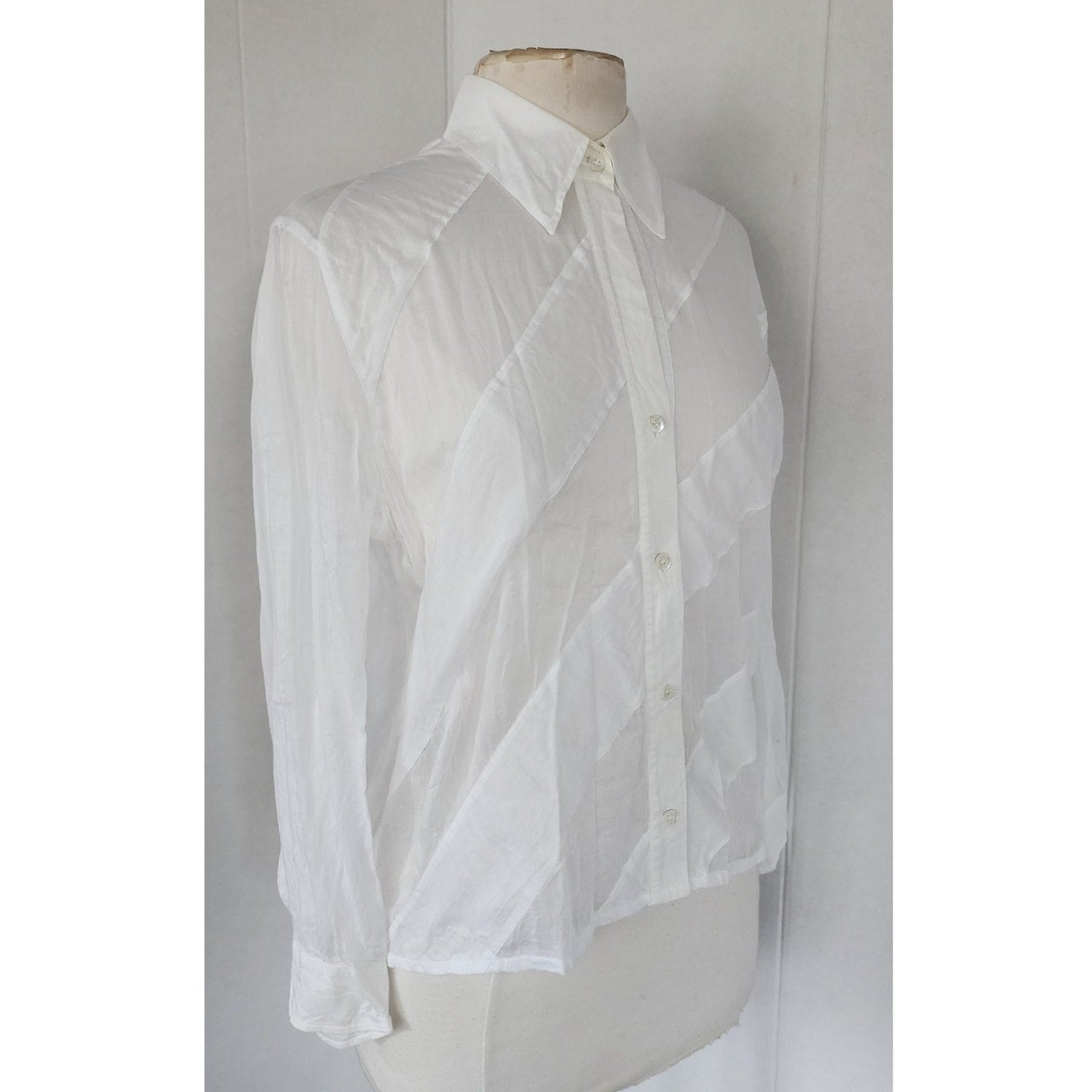 Extra soft and lightweight button down in white with diagonal stripe panels alternating between a semi sheer and a solid matte cotton panel. The small pointy collar folds down and the long sleeves have buttoned cuffs.