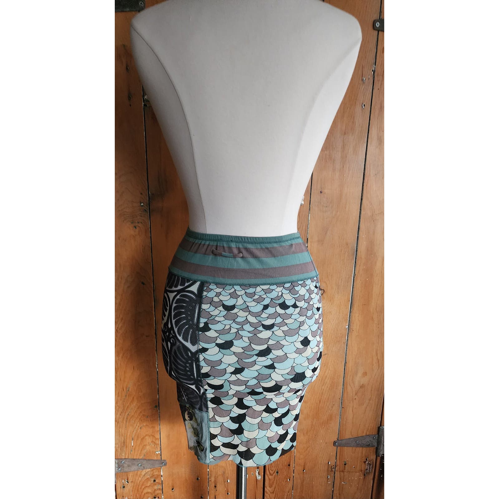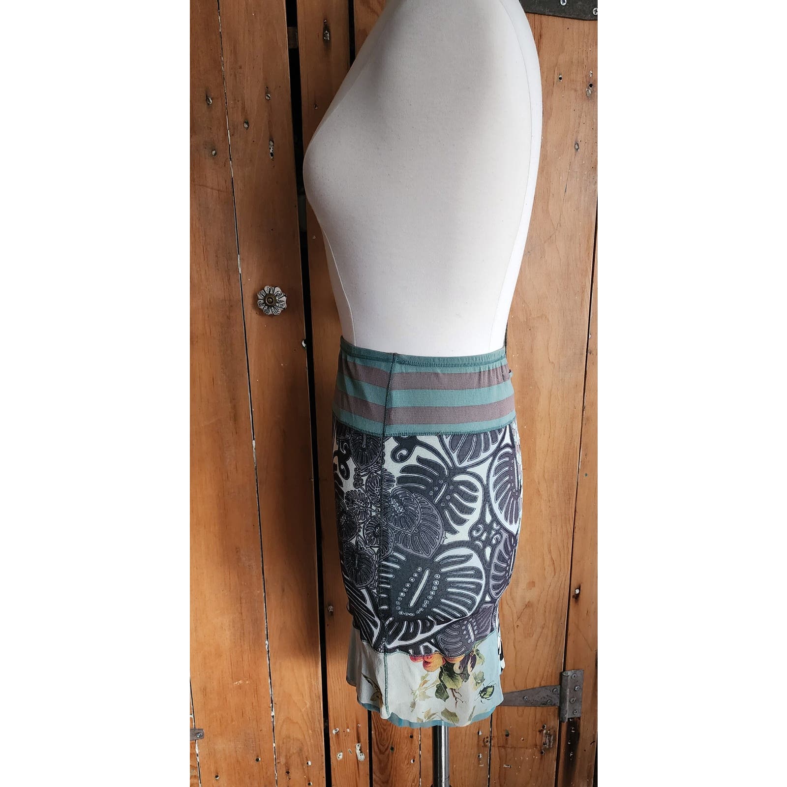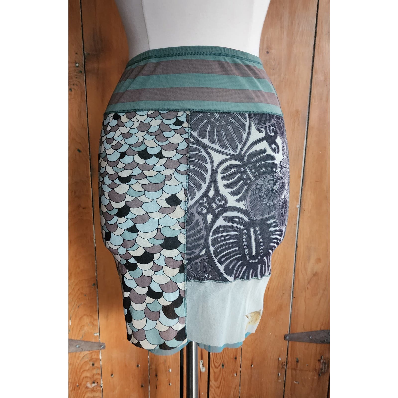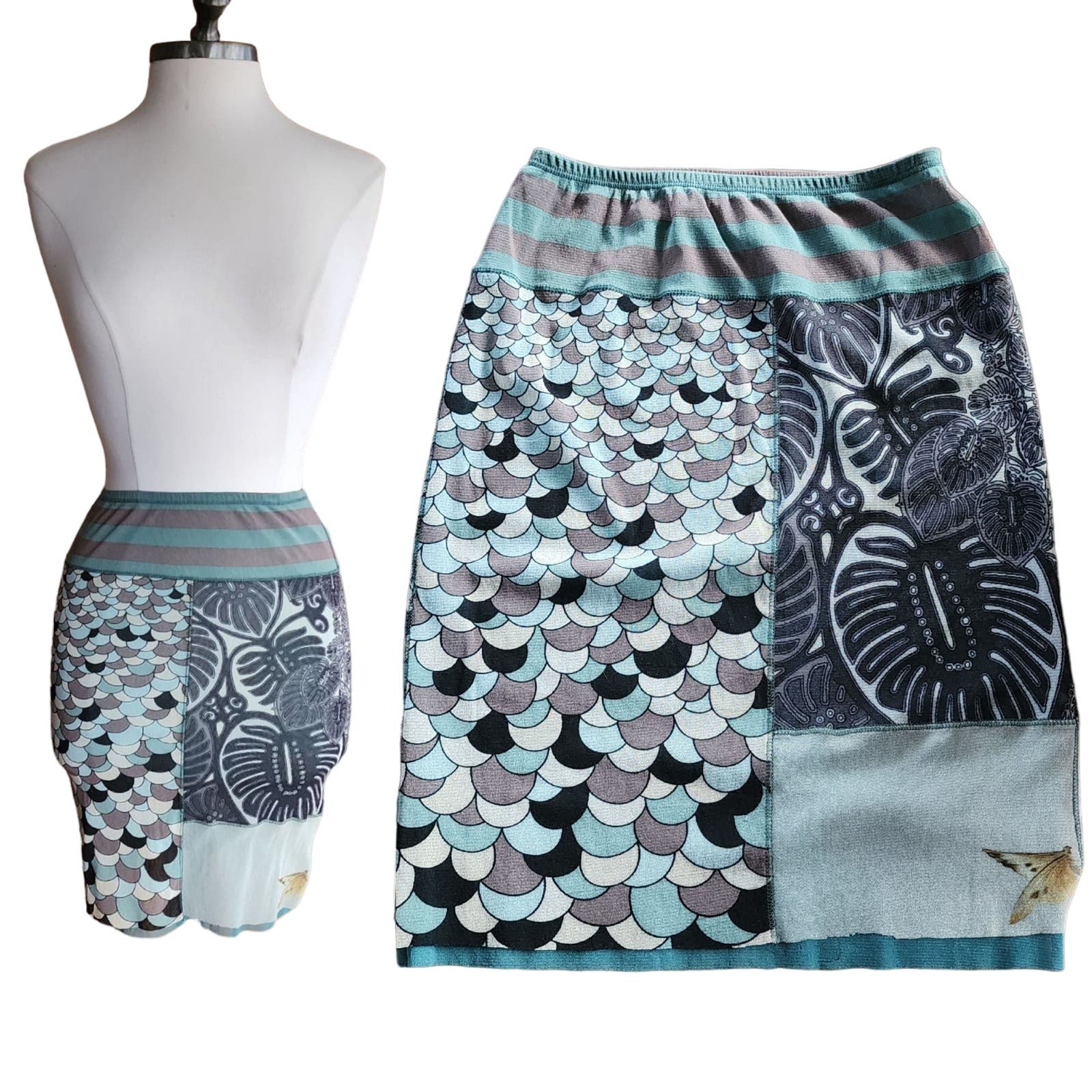 Cool, lightweight, and stretchy skirt by the great French designer, it has an elastic waist line and double layered texture. Accent seams separate the different patterns in a patchwork design as tones of blue, gray, black, beige, and gold share the space.