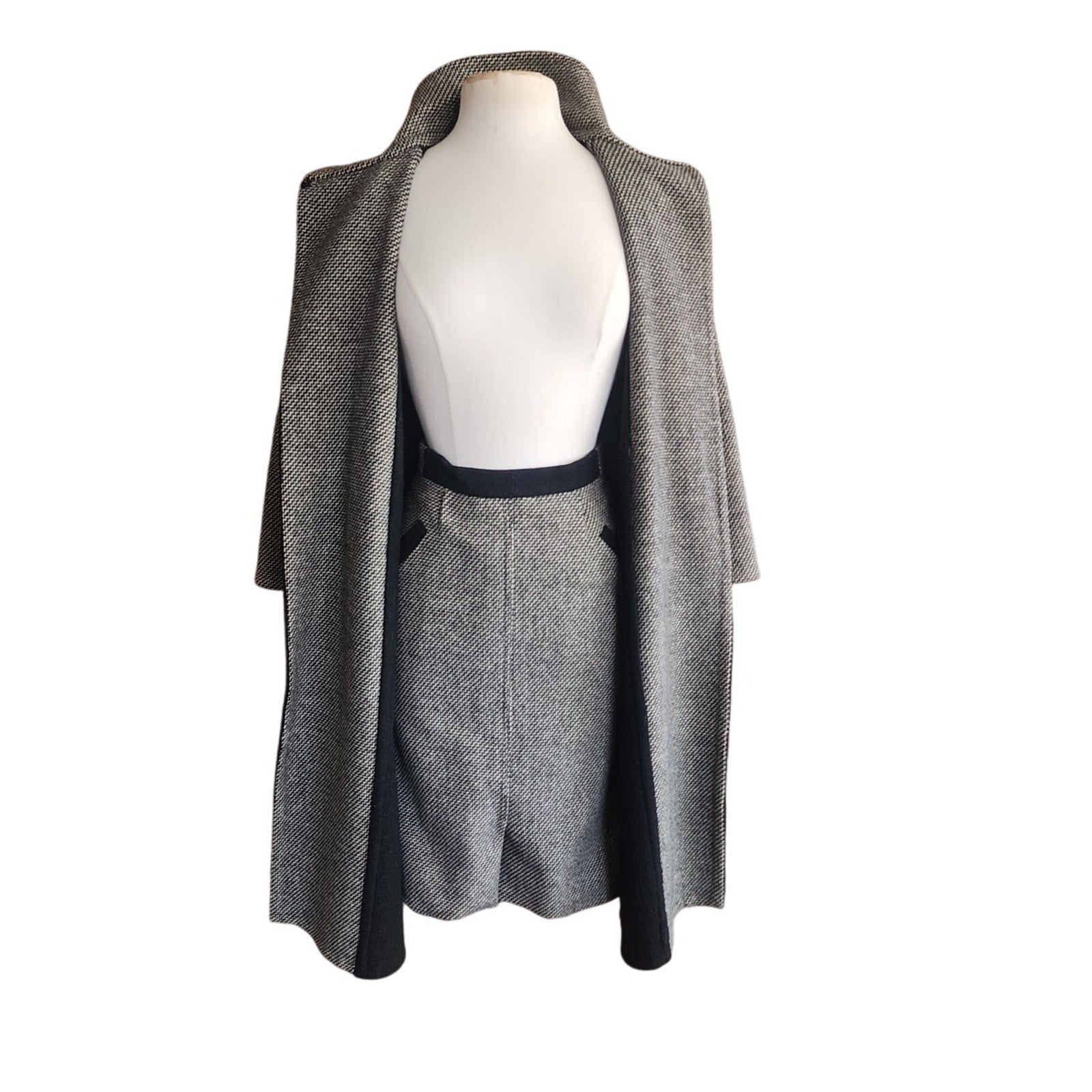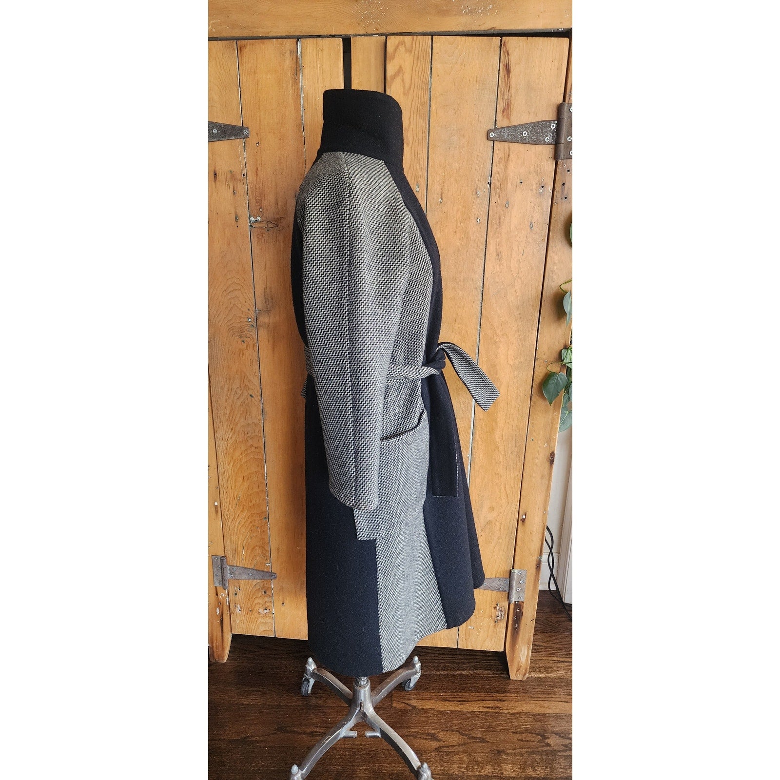 Looks handmade and features expert tailoring this coat is very smart, and surprisingly lightweight while also being warm. Front and rear center are solid black while the rest is narrow diagonal bands of zigzag stripe - they look like a tight herringbone pattern from afar. Features dolman cut shoulders and a large, fold down collar than can be fastened to create a turtleneck effect, thanks to the hidden snap at the throat. Wrap style, it stays closed with a matching sash tie belt. Large apron pockets appear at each hip front. Unlined.