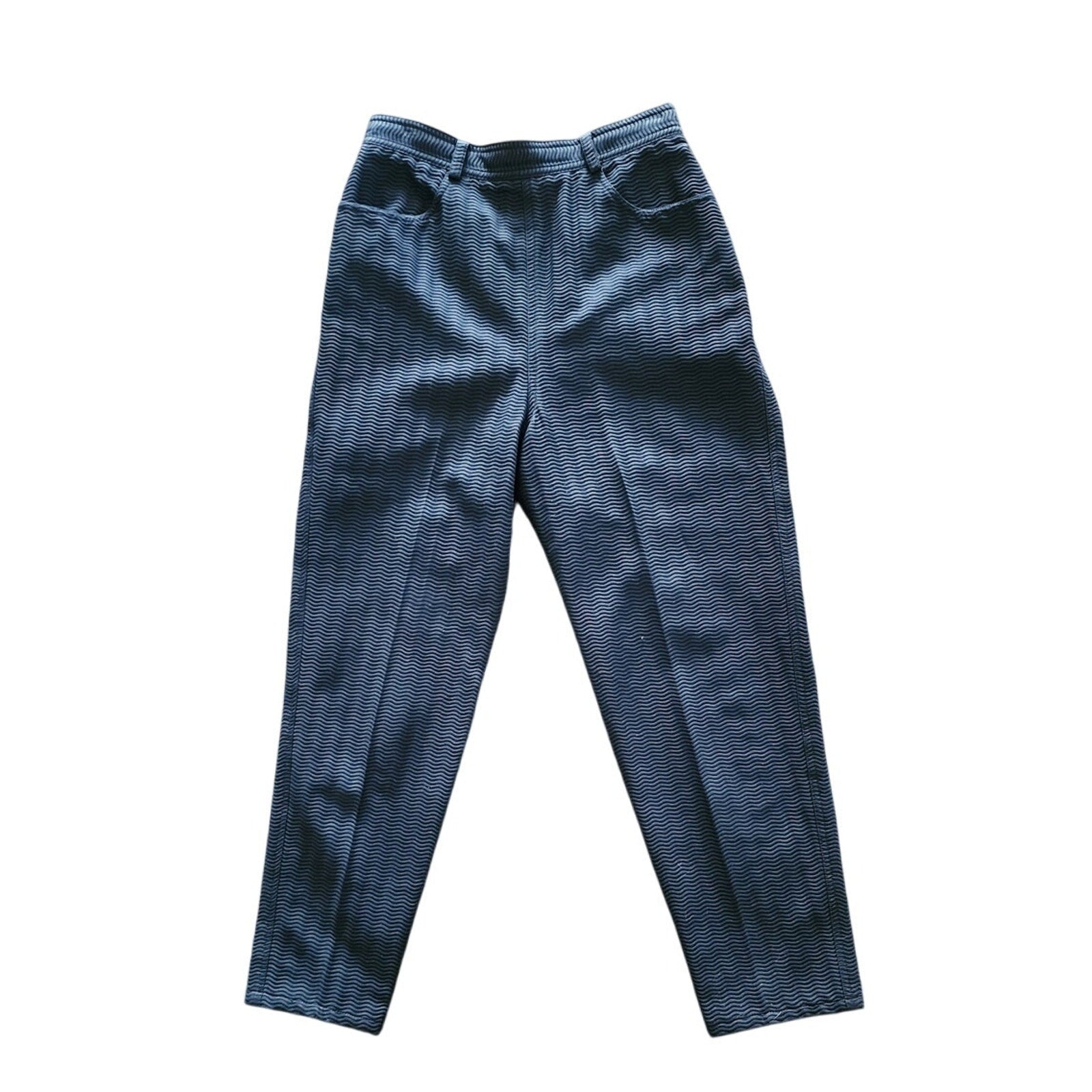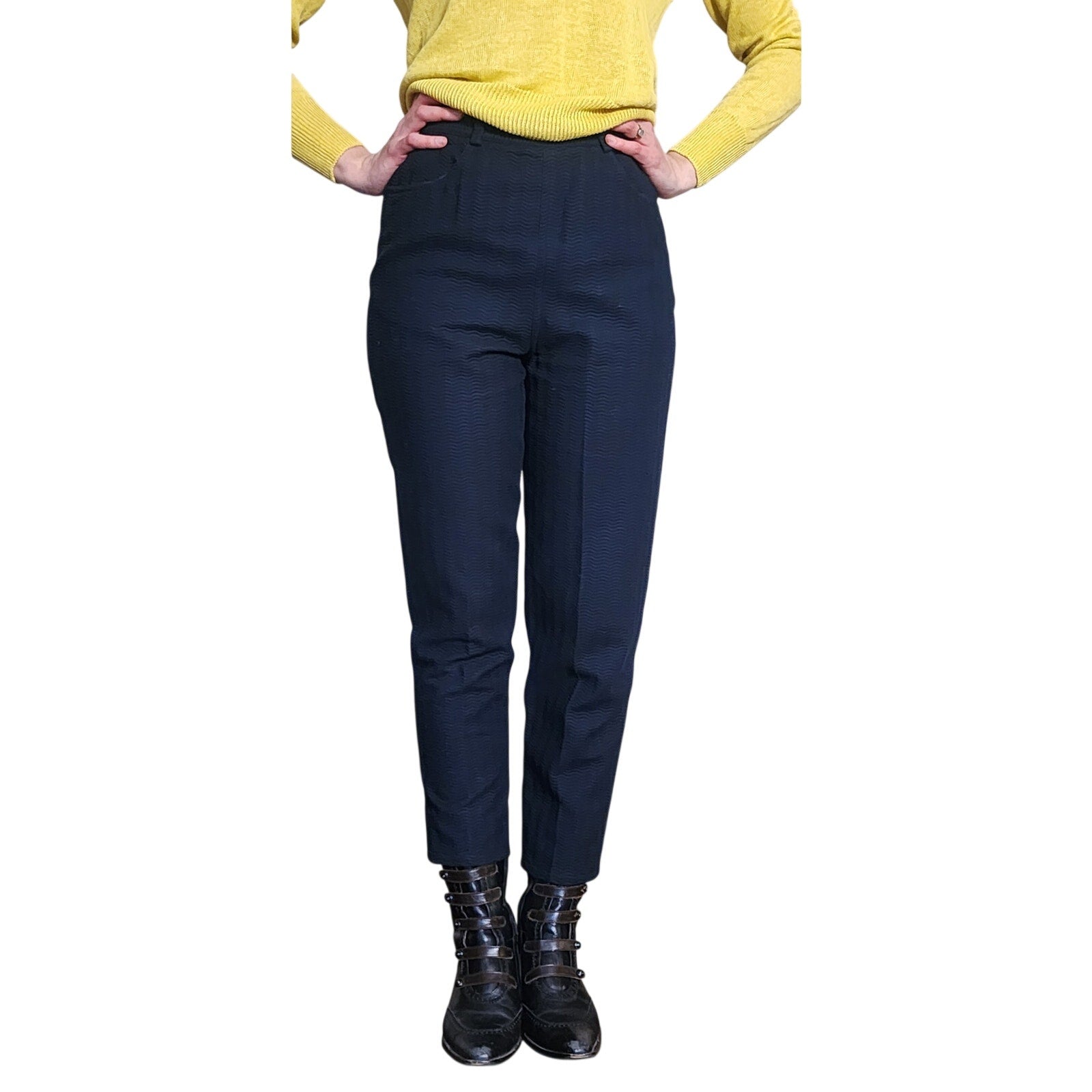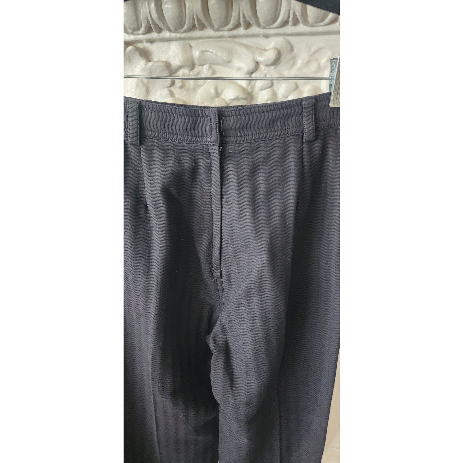 Classic, high waisted pants in a textured black cotton. The pants have a wavy pattern and a tapered leg. Features belt loops and zipper-fly closure at center rear. Flat front, there are curved hip pockets at front. Unlined.