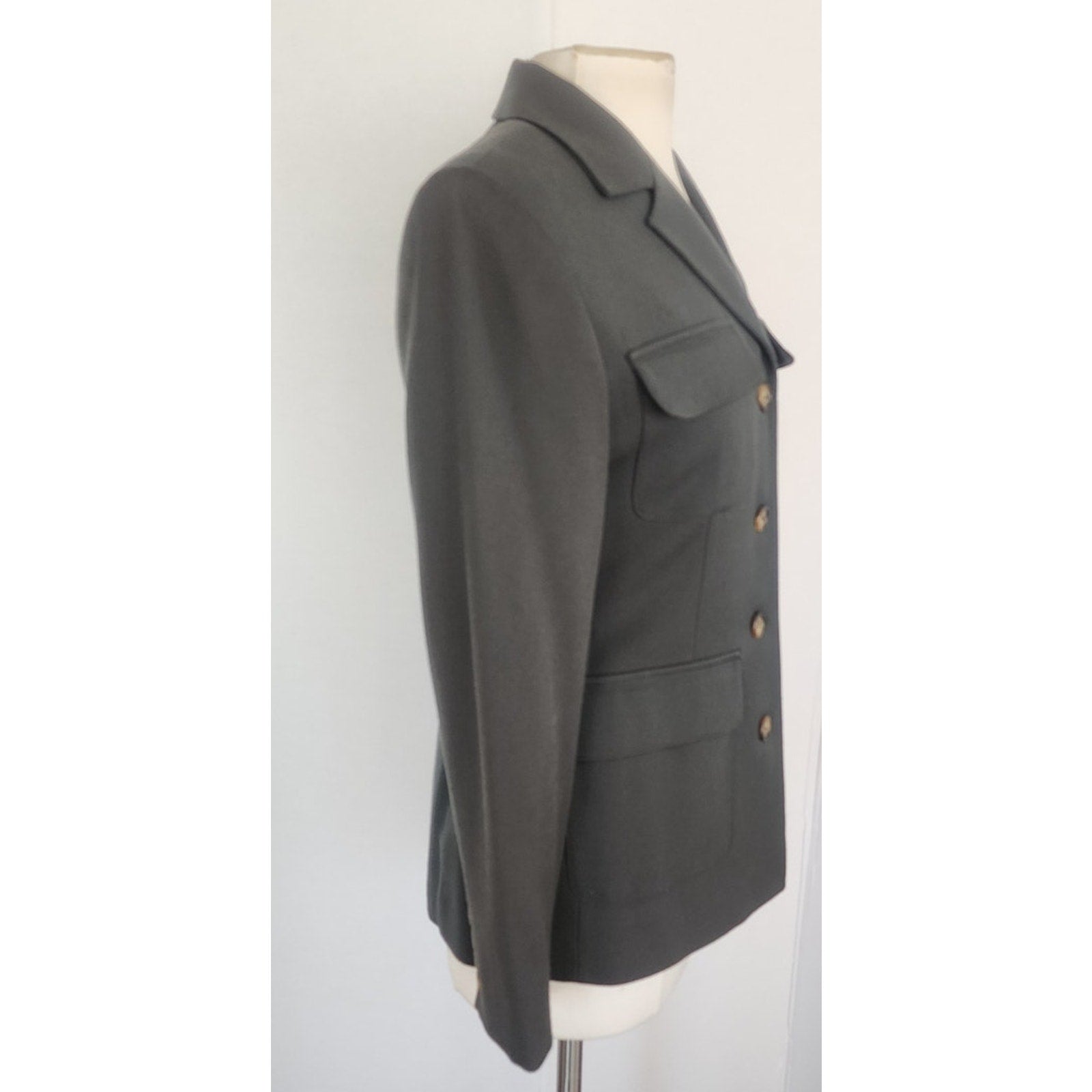 Classically tailored jacket with button down closure at front, it features a fold down collar, and flap pockets at both the chest and the hip fronts. Fully lined.