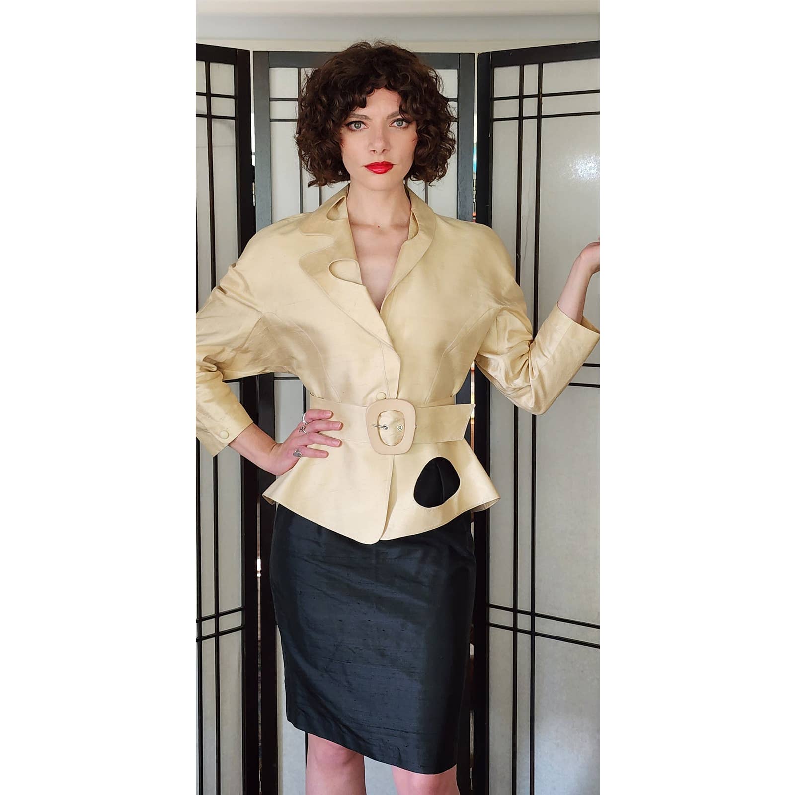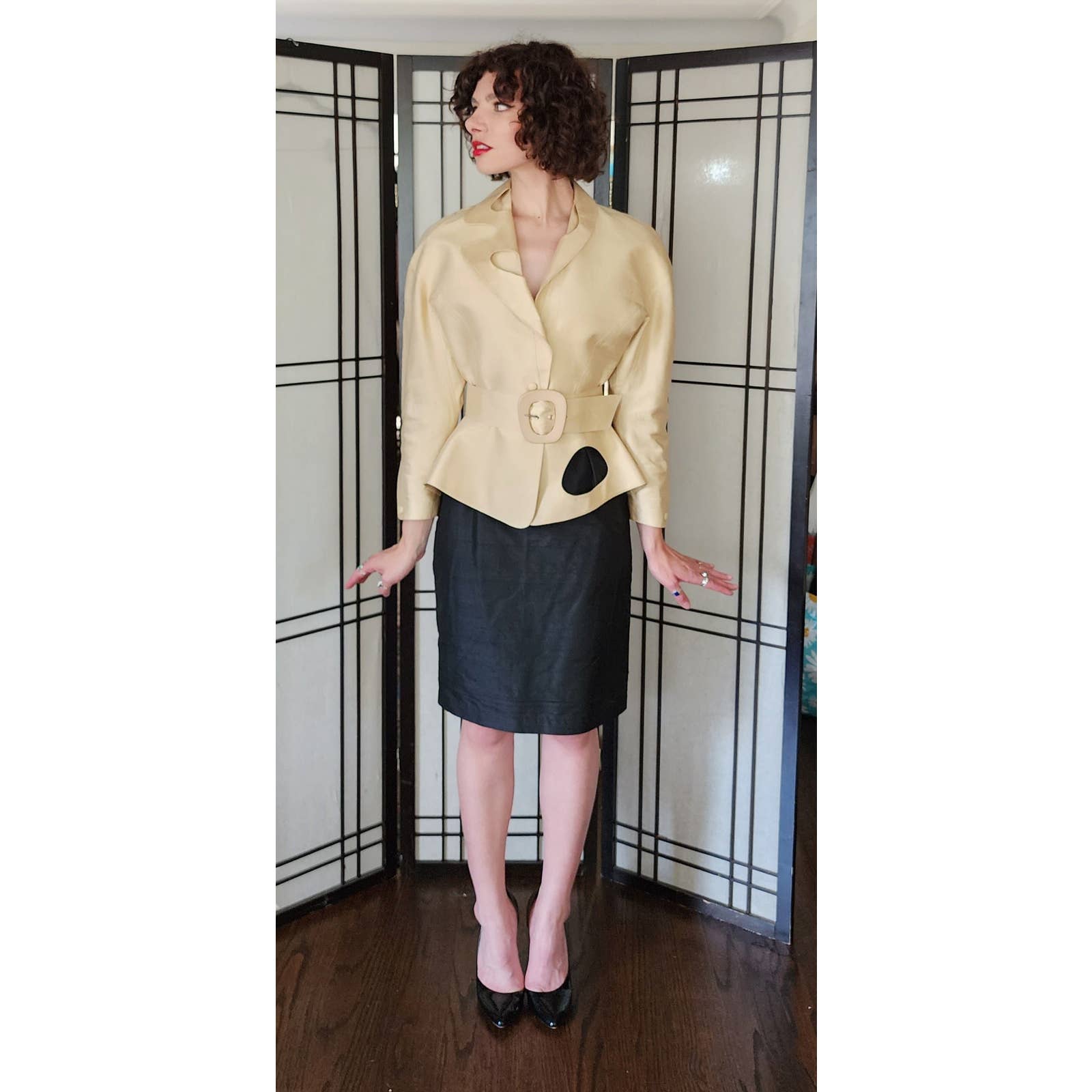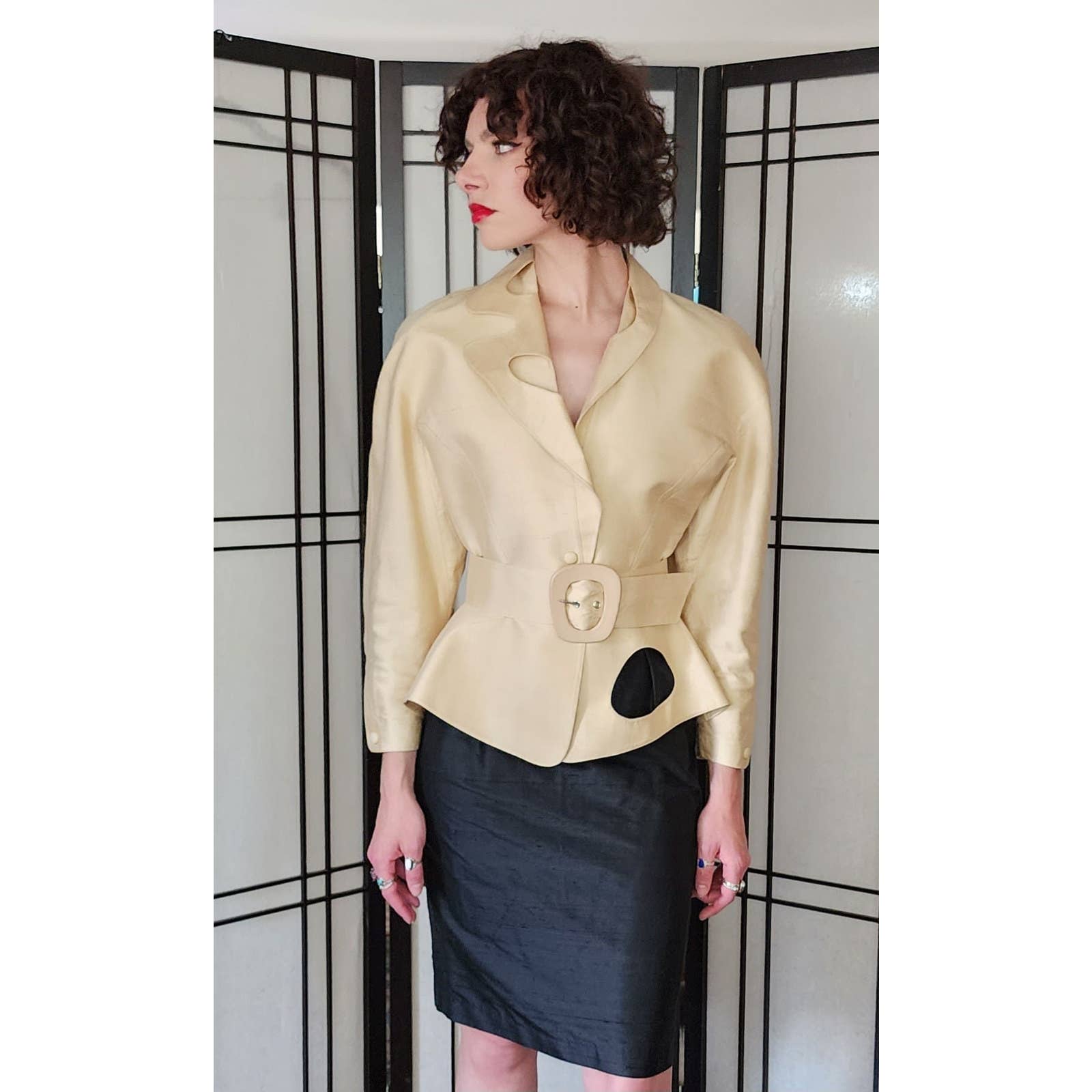 The raw silk blazer has raglan cut shoulders and a nipped waist, defined further by a matching, adjustable waist. There are hidden snap closures at the interior. The large, fold down collar has asymmetrical cutouts, echoing the large cutout at left hip front. Blazer with belt creates a peplum covering the top of the black skirt which is high waisted and classically proportioned, ending below the knee and closing with a zipper and hook at the rear. Both pieces are fully lined.
