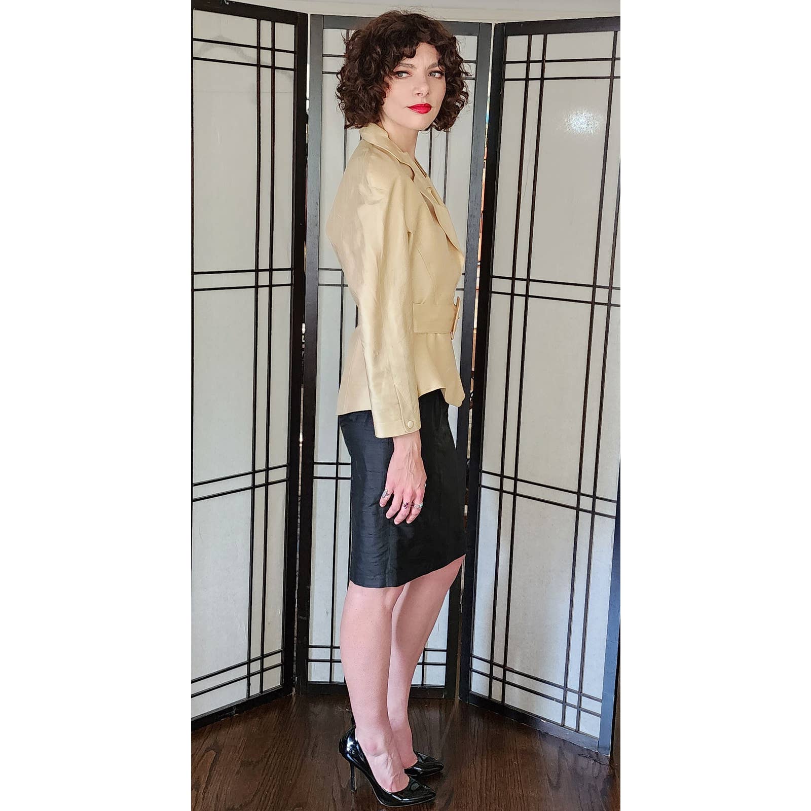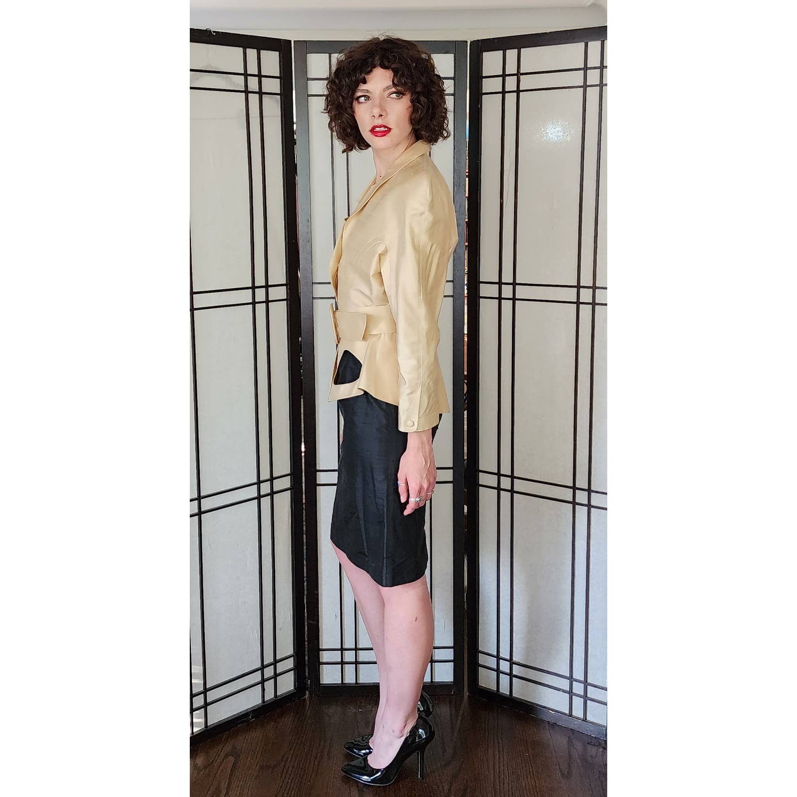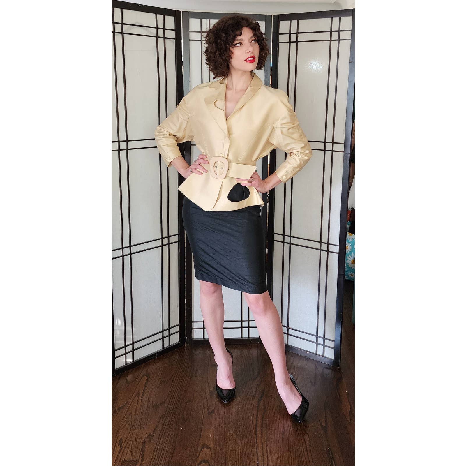 The raw silk blazer has raglan cut shoulders and a nipped waist, defined further by a matching, adjustable waist. There are hidden snap closures at the interior. The large, fold down collar has asymmetrical cutouts, echoing the large cutout at left hip front. Blazer with belt creates a peplum covering the top of the black skirt which is high waisted and classically proportioned, ending below the knee and closing with a zipper and hook at the rear. Both pieces are fully lined.