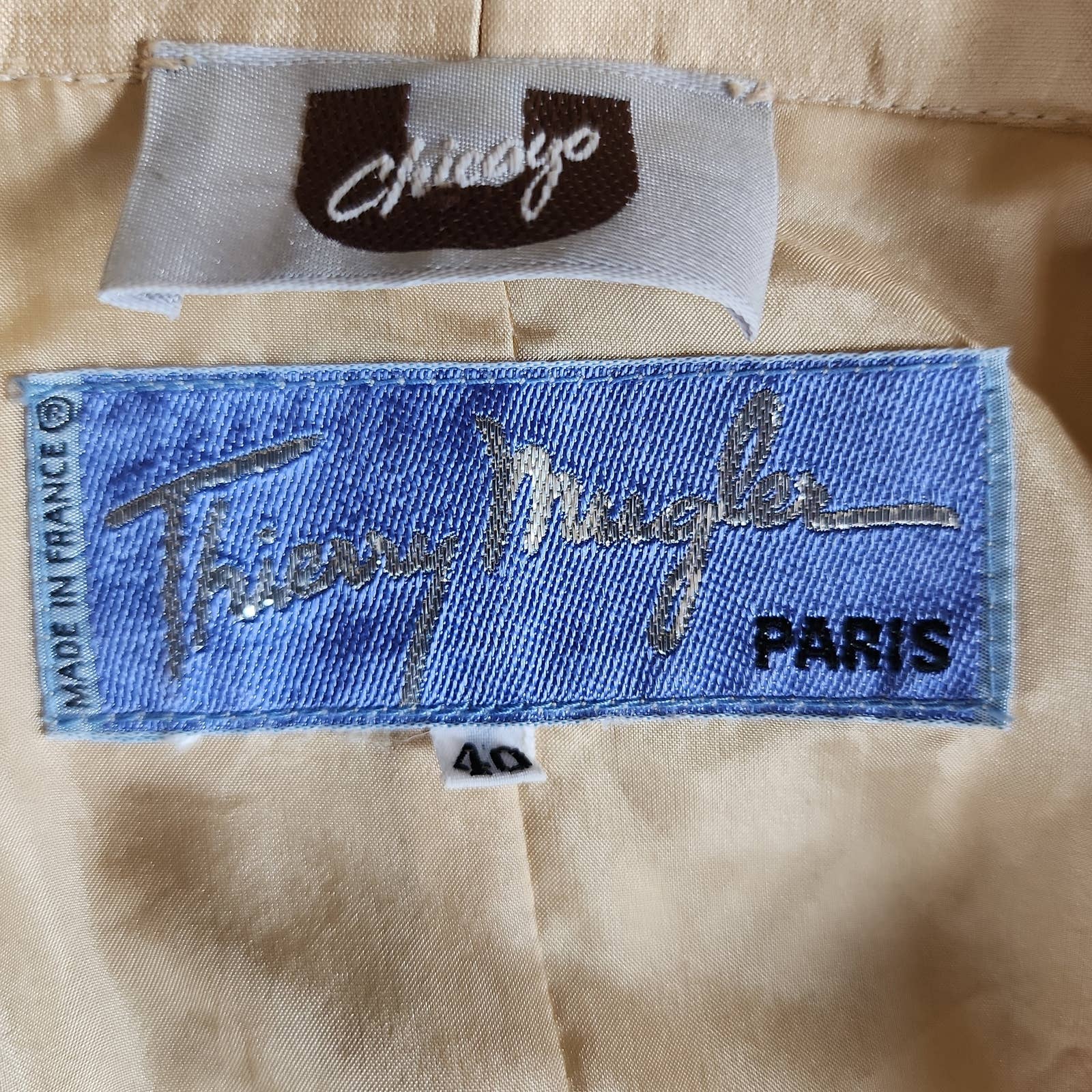 Label: Thierry Mugler Paris. Made in France. U Chicago (store label)