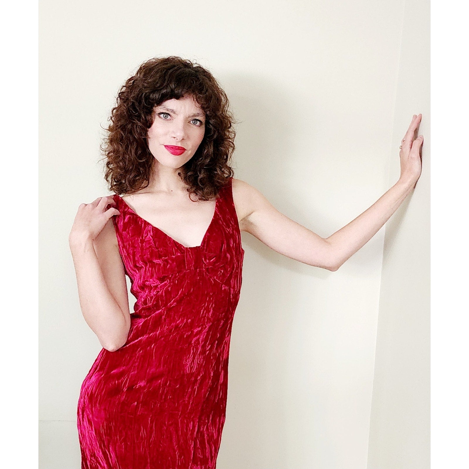 Simply and sexy, sleeveless dress in a "crushed" burgundy red velvet that catches the light easily to create texture. It has an empire waist seam and a skirt cut straight down the torso. Center chest has a subtle little "bow" like panel in matching fabric to offset the ruched bust section. Closes with a zipper down the center rear. Unlined.