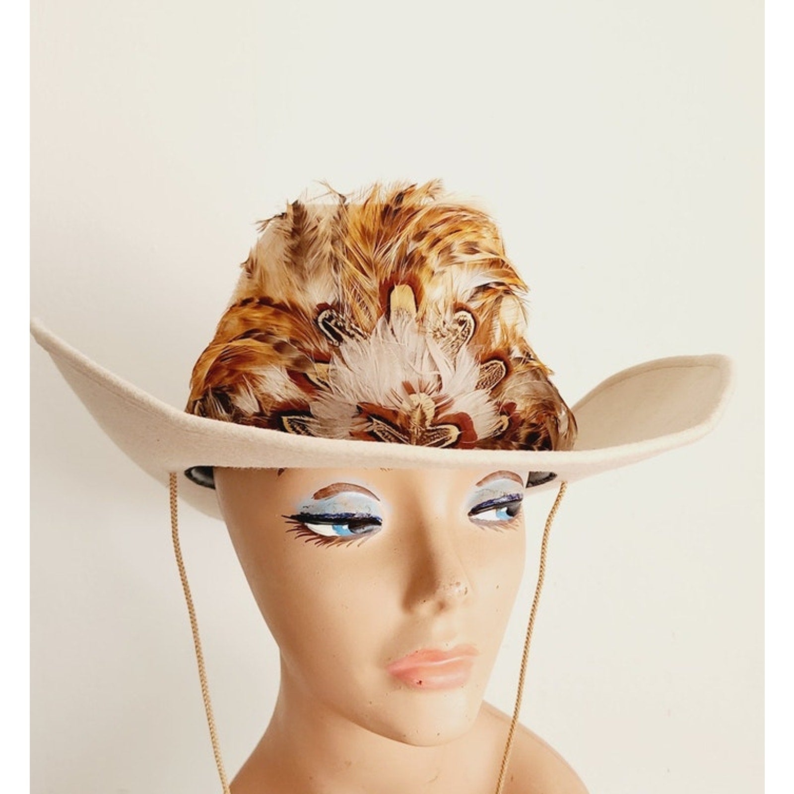 Vintage Beige Cowboy Hat w/Feather by Rockmount Wind River 1850 Size 7 1/4 Mens Unisex