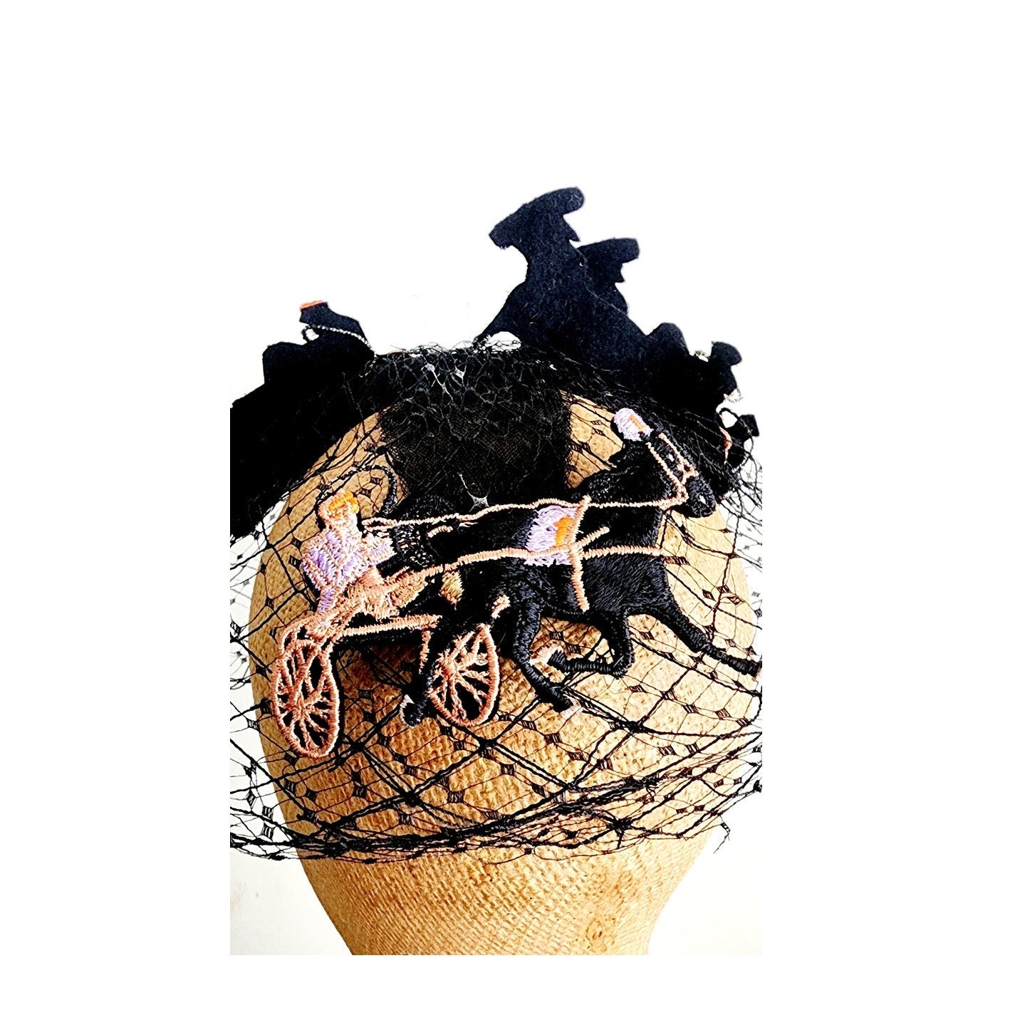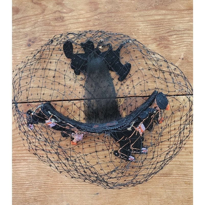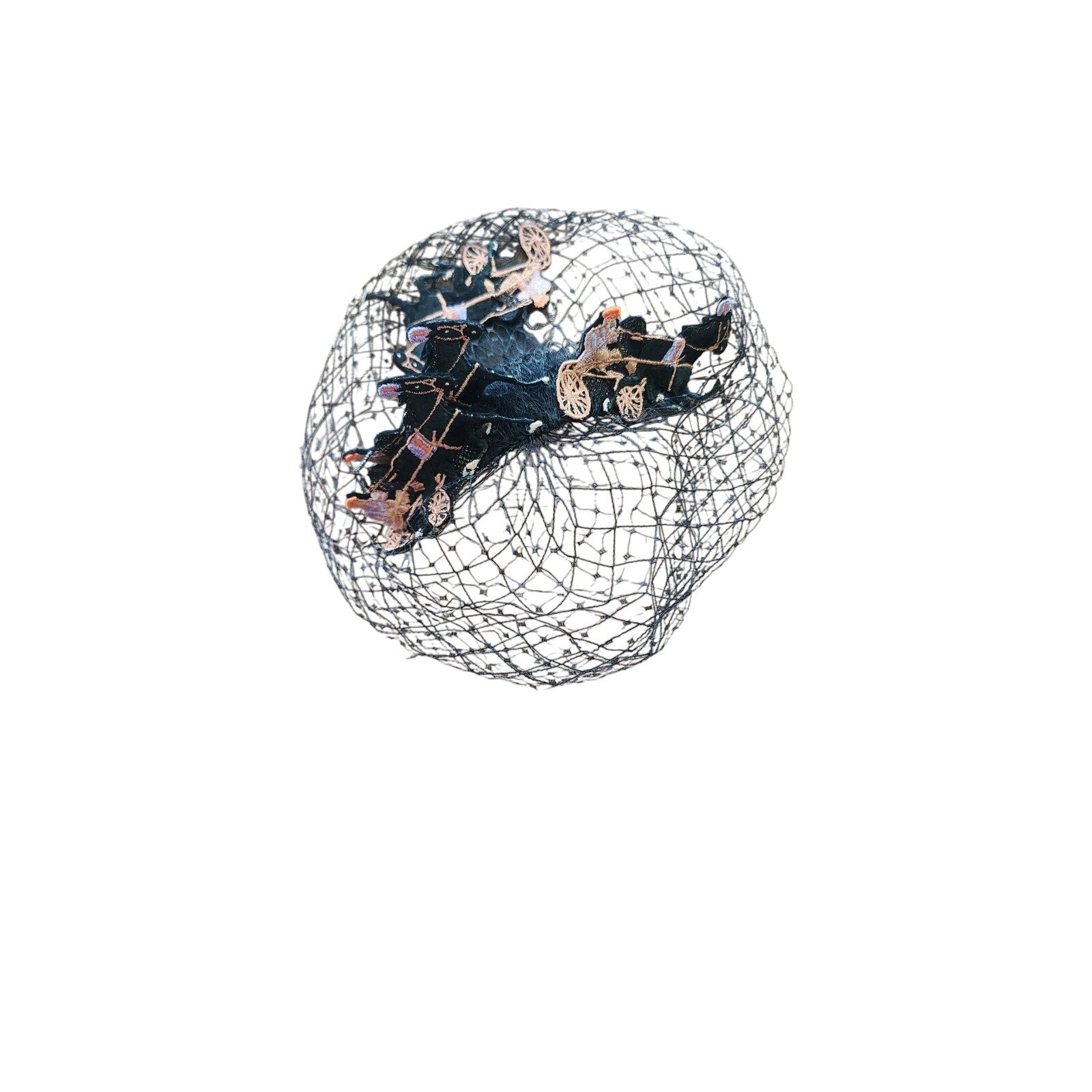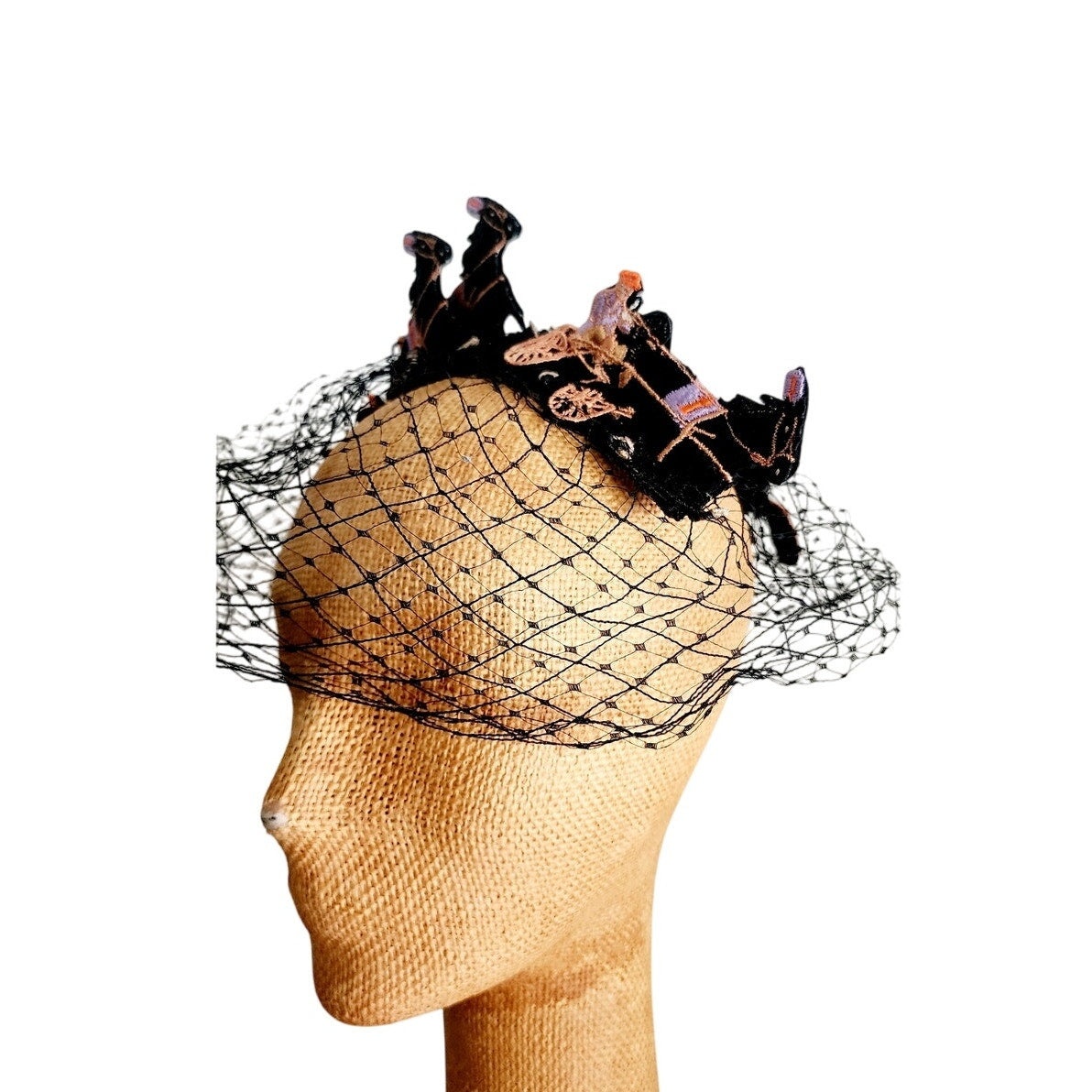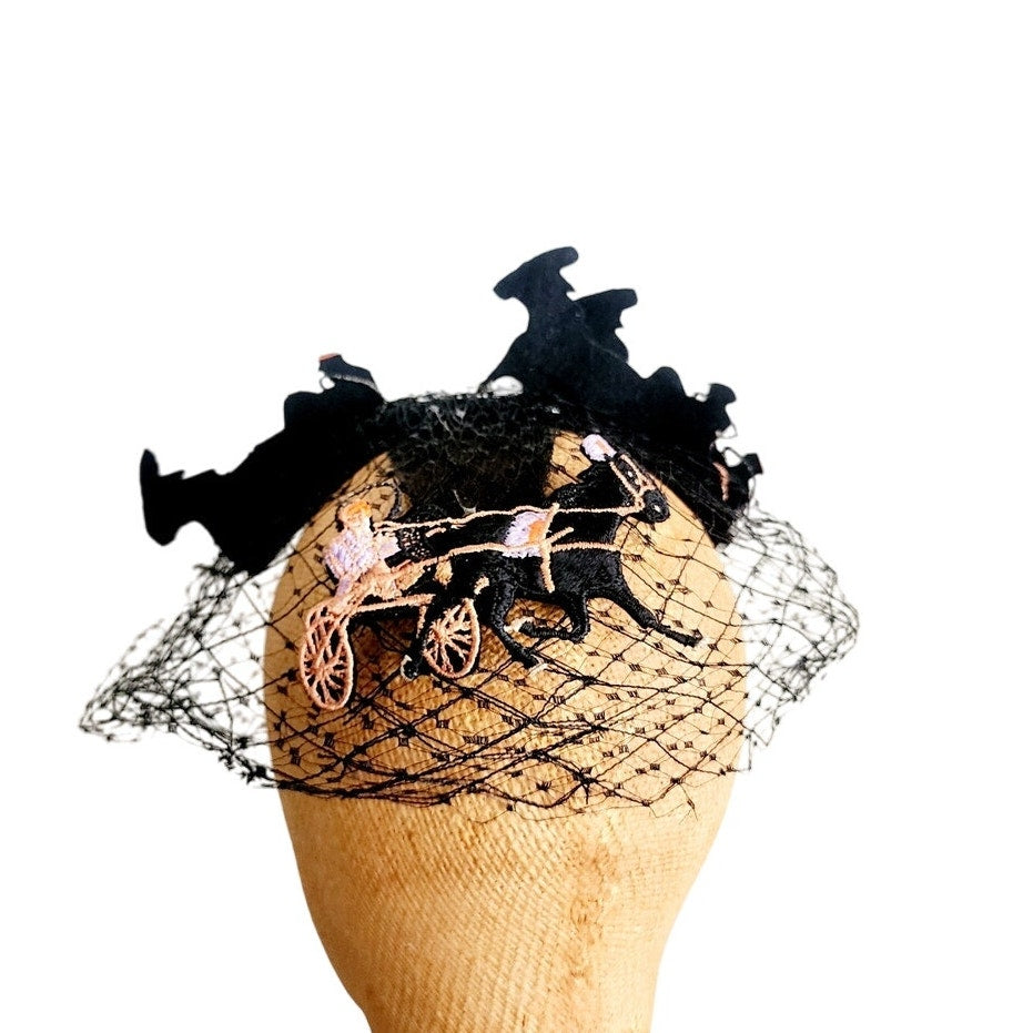 This midcentury stunner from the Mad Milliner of Chicago Bes-Ben is truly a one of a kind piece. The "body" is all in a thick black mesh that conforms to the head and comes down the face if you place it so. The top is a series of black, embroidered trotters - a form of horse racing. They seem to be made out of black felt and feature detailed embroidery in peach, orange, cream, and lavender.
