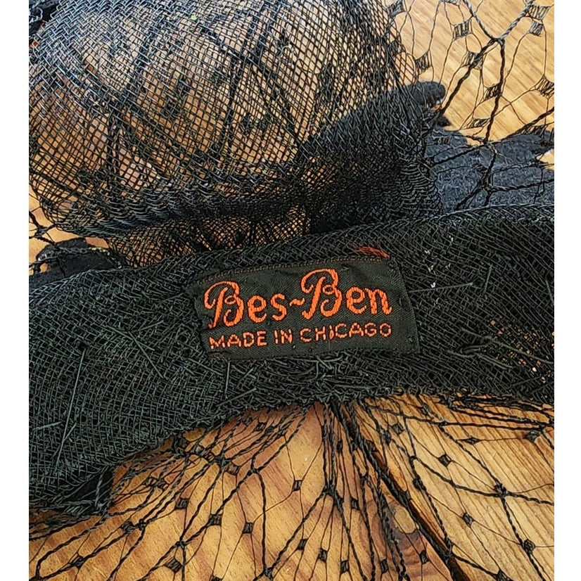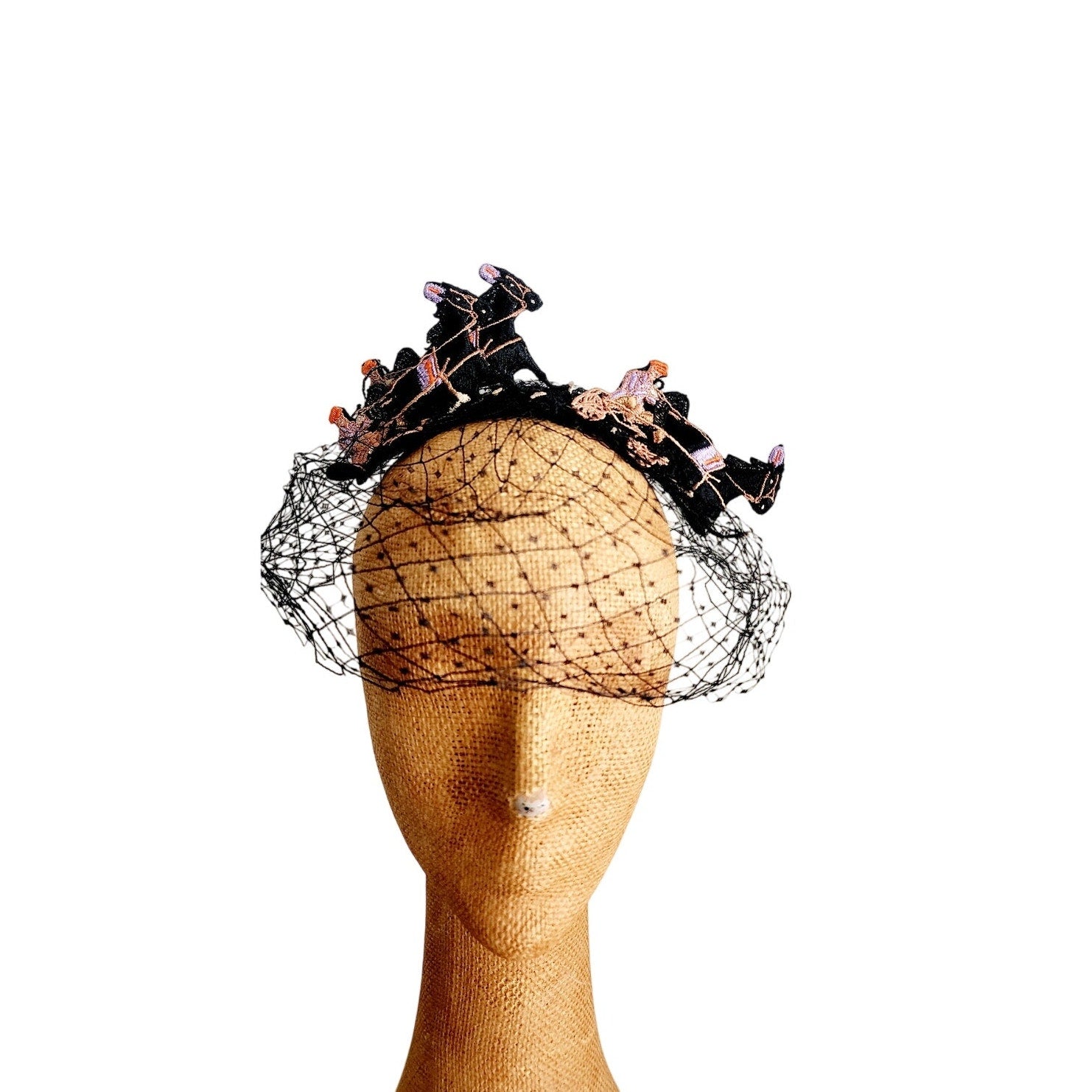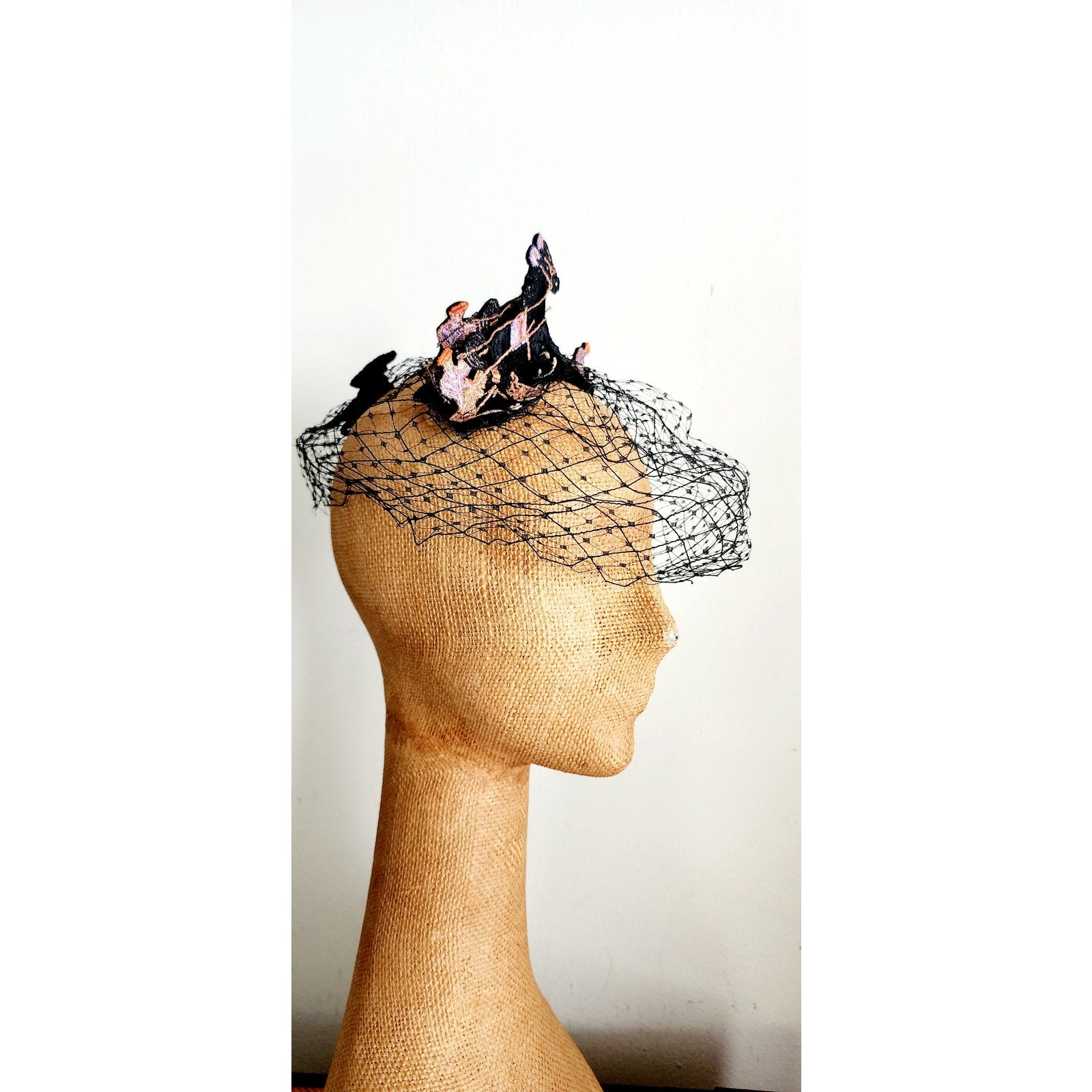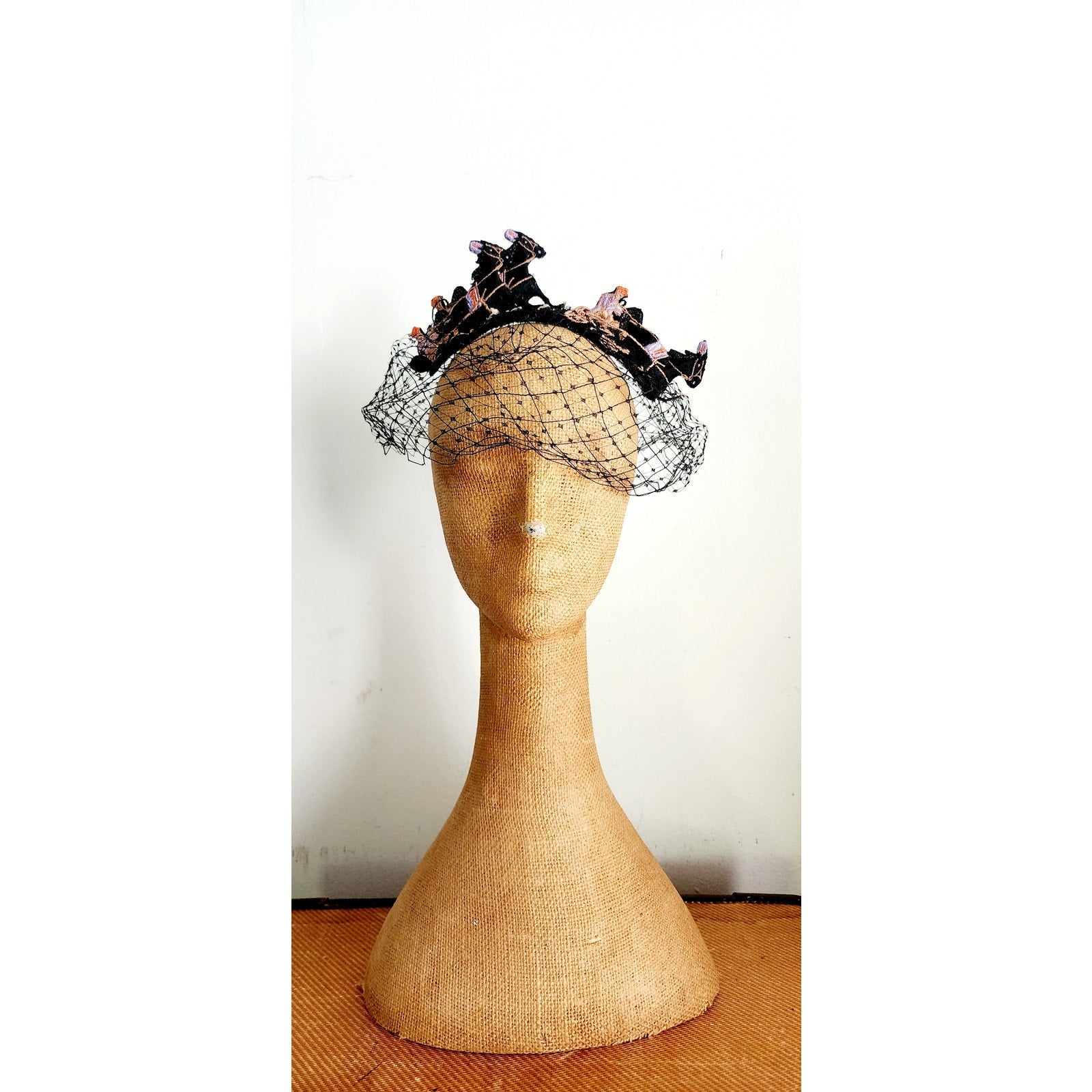 This midcentury stunner from the Mad Milliner of Chicago Bes-Ben is truly a one of a kind piece. The "body" is all in a thick black mesh that conforms to the head and comes down the face if you place it so. The top is a series of black, embroidered trotters - a form of horse racing. They seem to be made out of black felt and feature detailed embroidery in peach, orange, cream, and lavender.