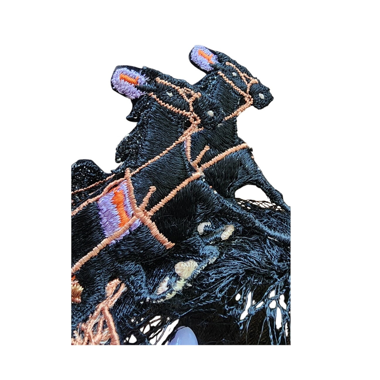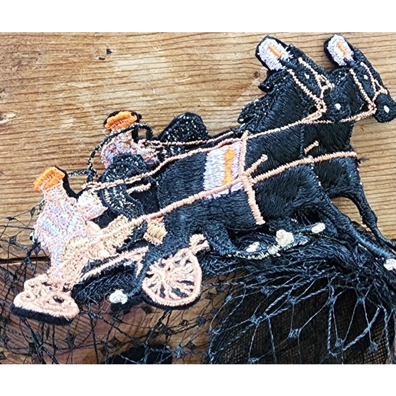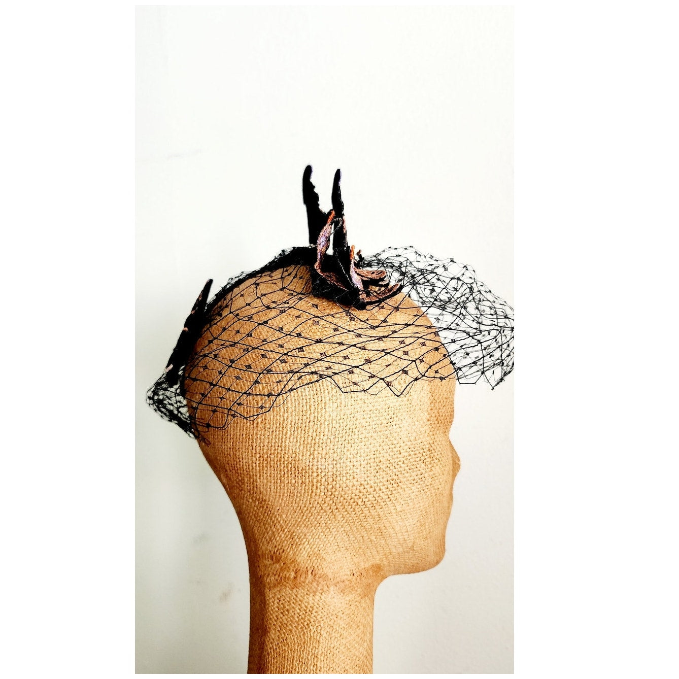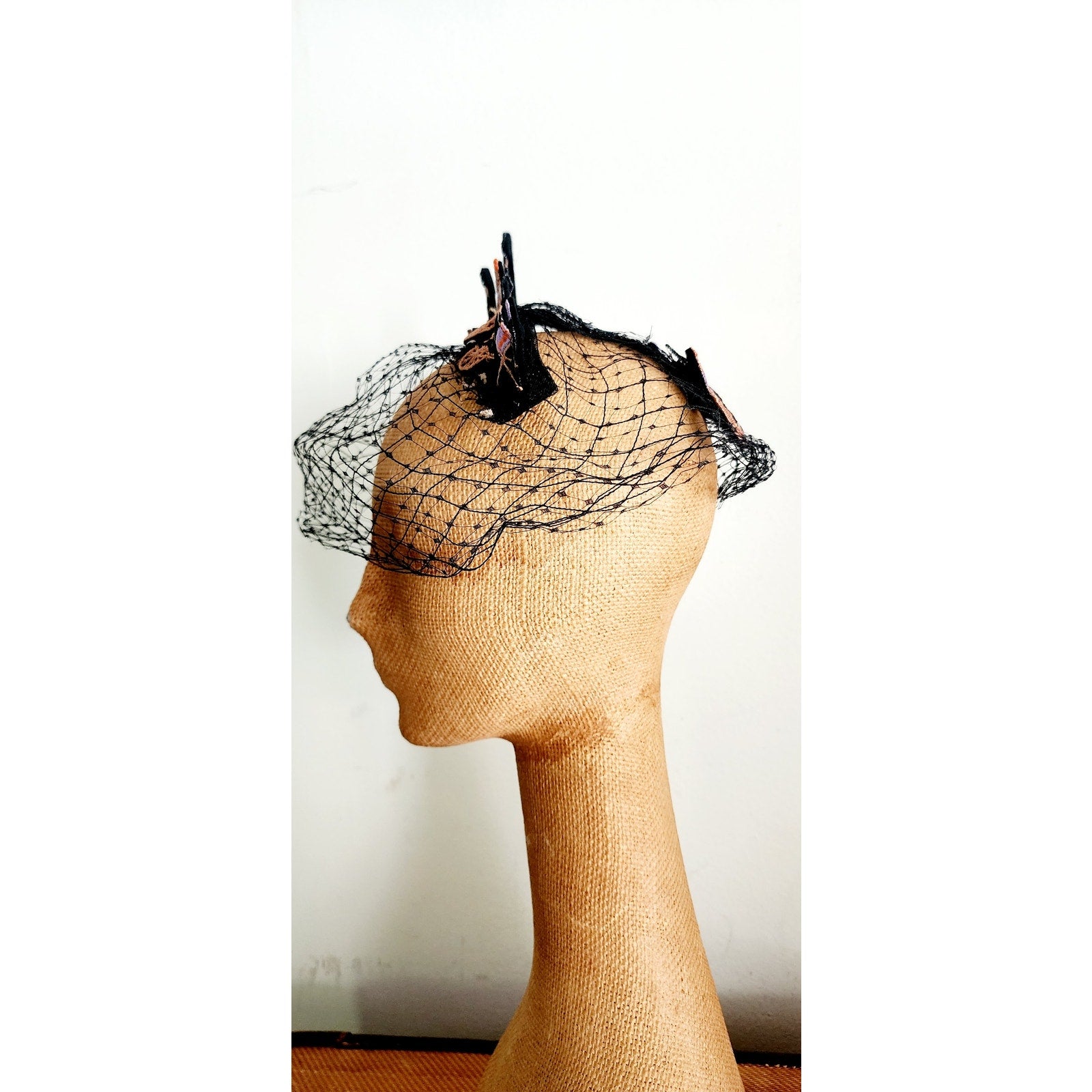 This midcentury stunner from the Mad Milliner of Chicago Bes-Ben is truly a one of a kind piece. The "body" is all in a thick black mesh that conforms to the head and comes down the face if you place it so. The top is a series of black, embroidered trotters - a form of horse racing. They seem to be made out of black felt and feature detailed embroidery in peach, orange, cream, and lavender.