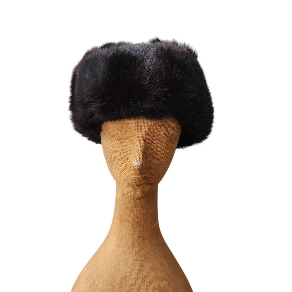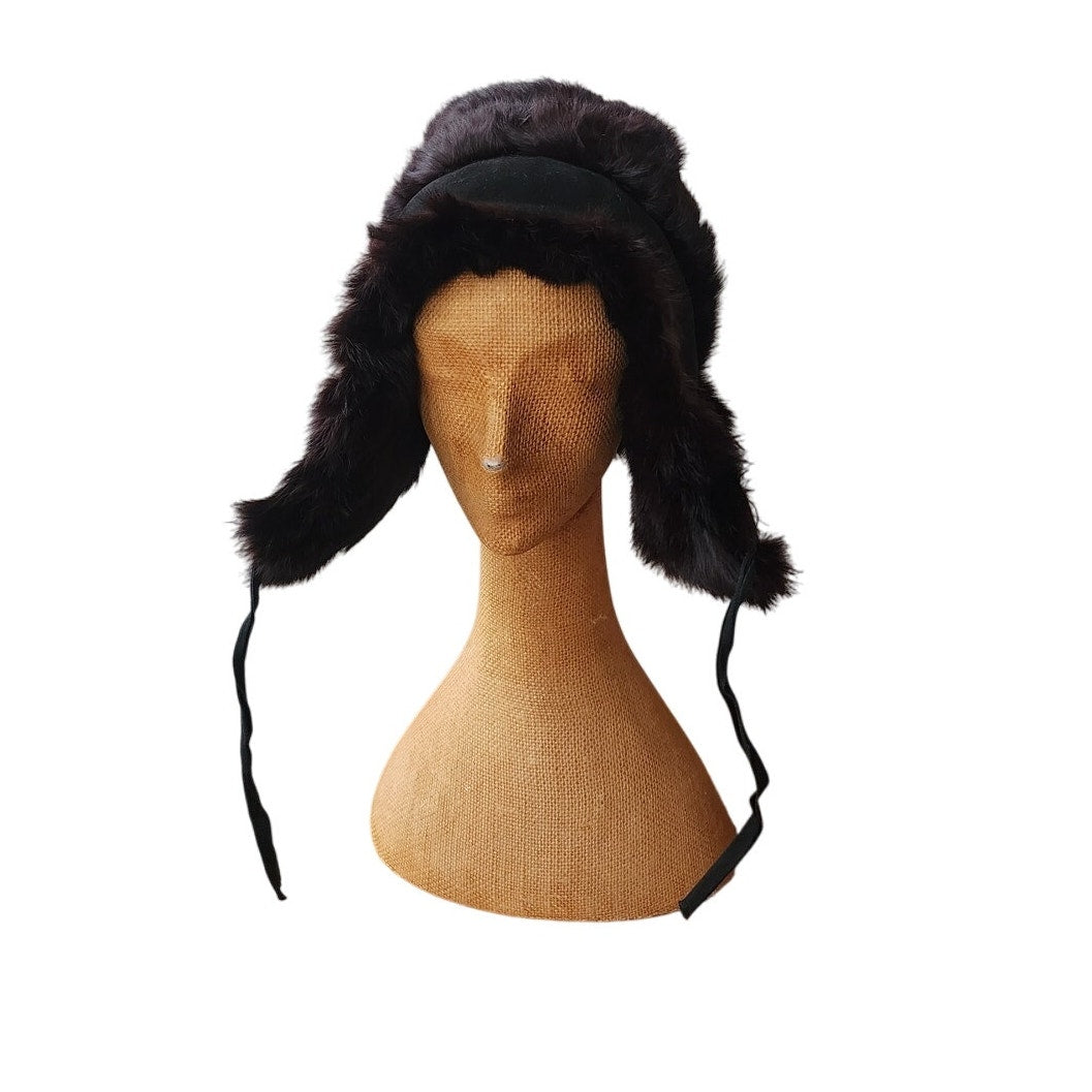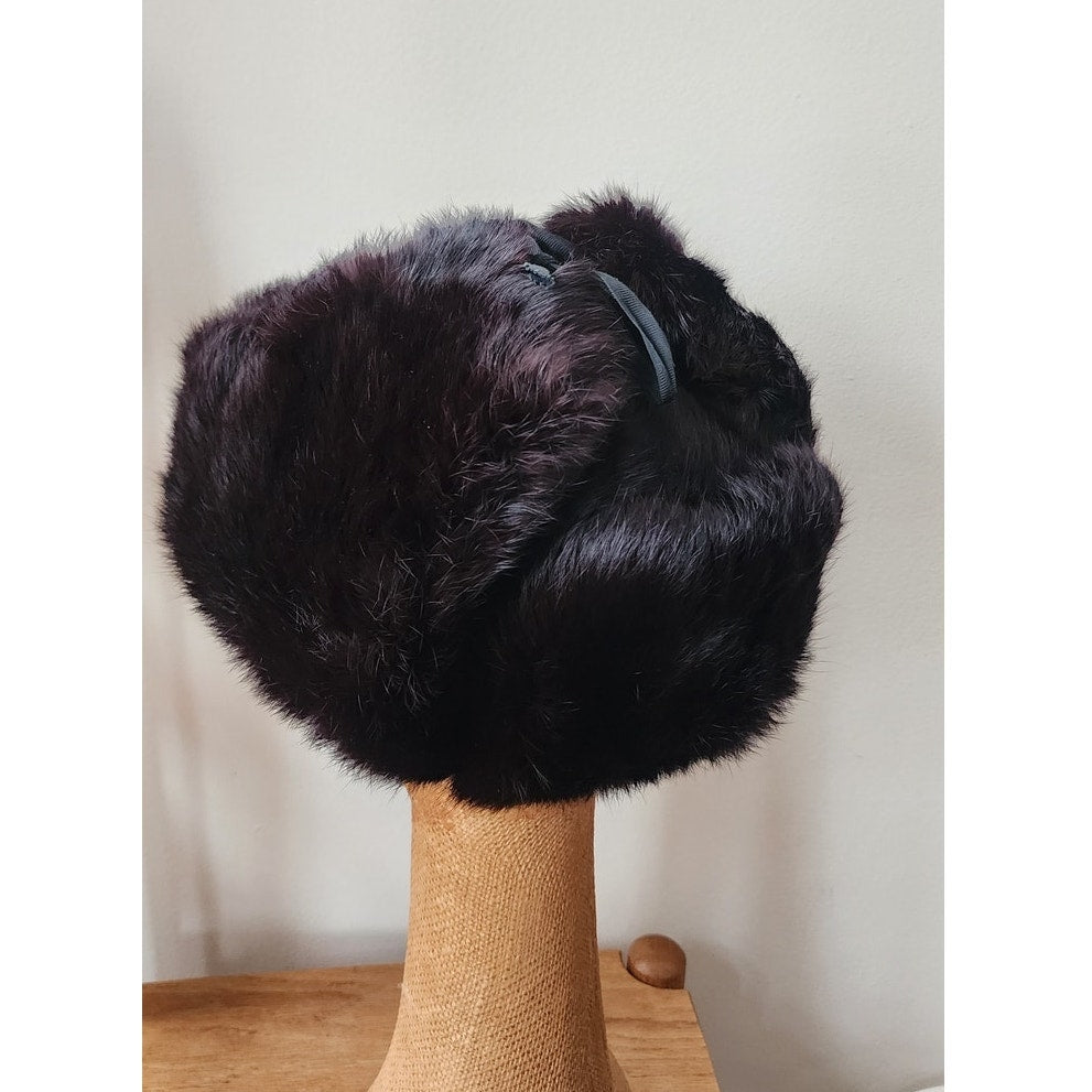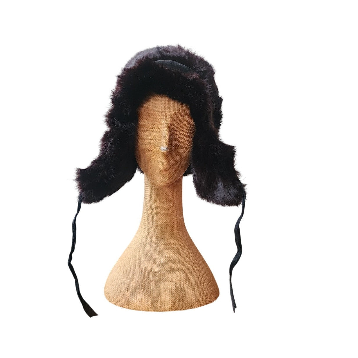 Vintage Black Fur Trapper Hat North King Ushanka Rabbit + Suede Ear Flaps Unisex