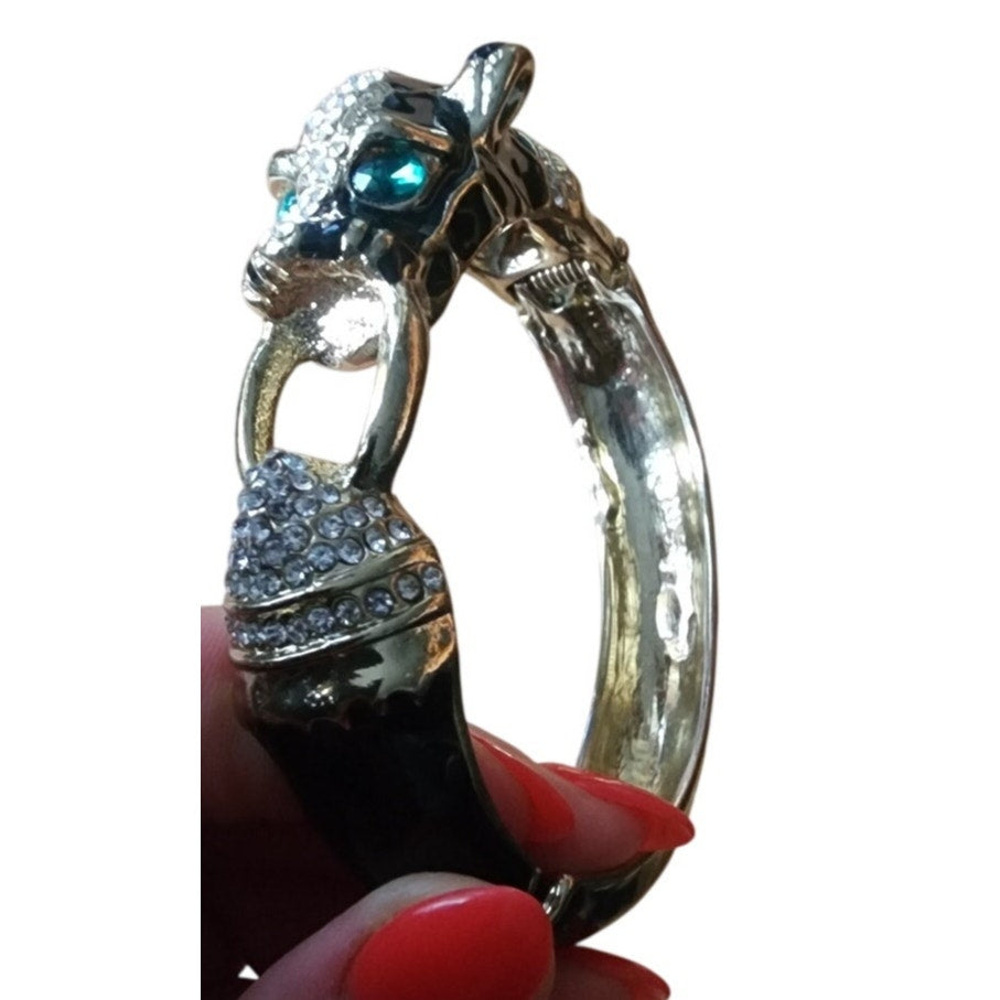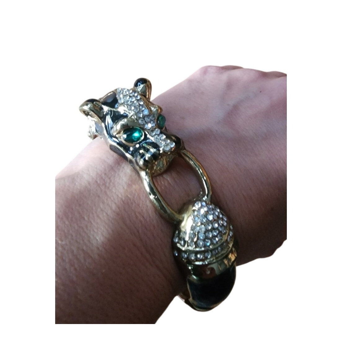 This bracelet is a gold-tone, hinged bangle style featuring a panther or leopard head design. The body and head are covered in black enamel, with clear pavé-set crystals detailing the face, tail, and body accents. The panther head has bright, emerald-colored rhinestone eyes and the bracelet closes with a hinged clasp. Unmarked. Very art deco/Erte style though likely late 80s - 90s