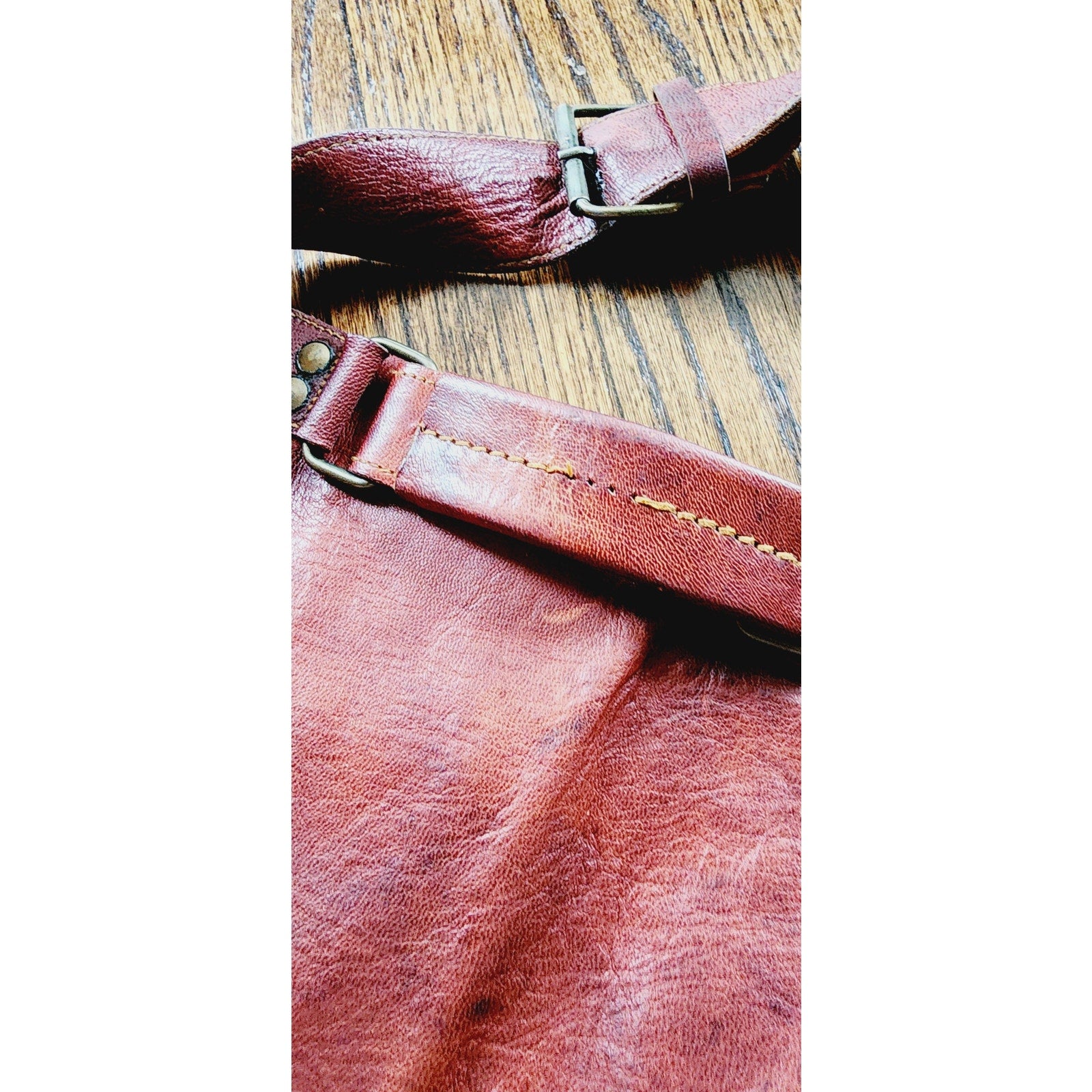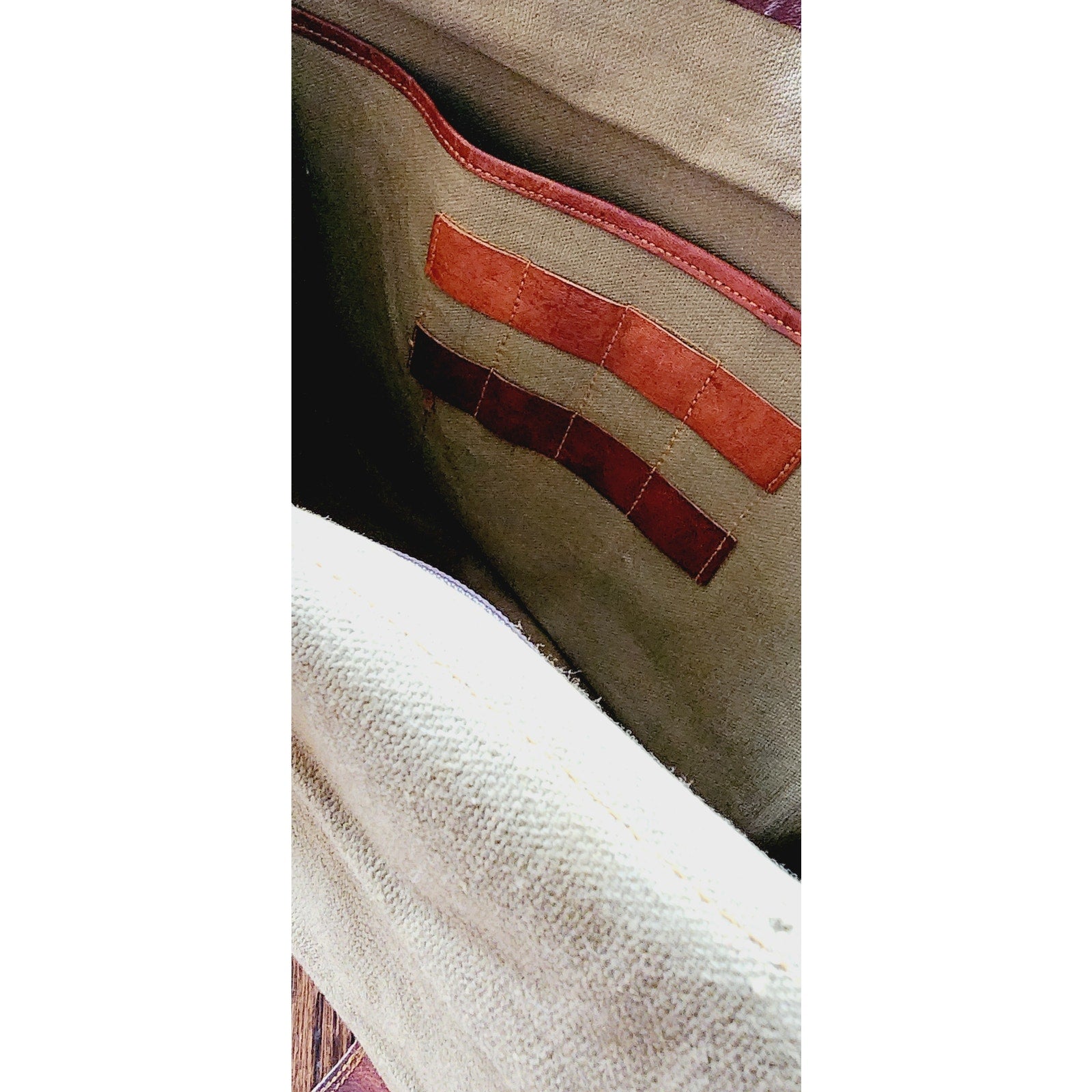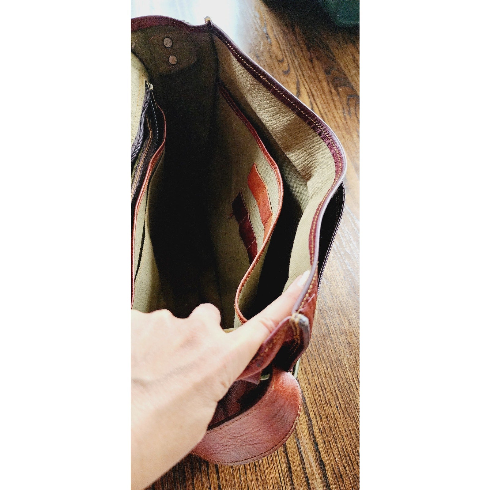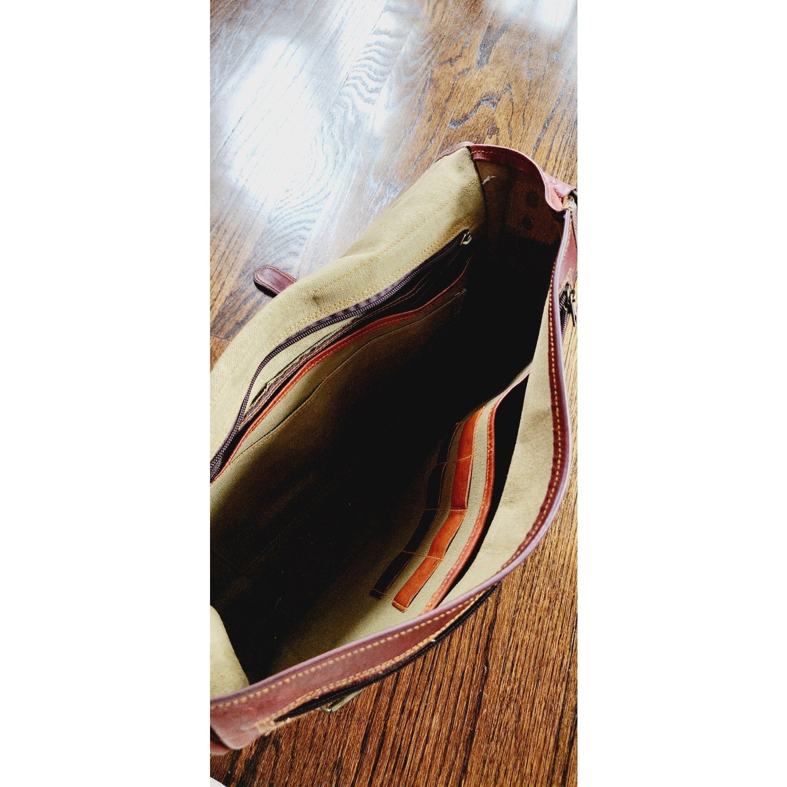 Excellent piece for vintage loving academic / Oxbridge scholar. The bag has an adjustable, wide, shoulder strap in marching brownish-rust leather. Note the yellow accent stitching throughout. Closes with a front flap featuring buckle straps. When you open it, front panel reveals a large, zippered pocket that is echoed in the rear of the satchel as well. Interior is canvas and has numerous, large sections for books and folders, as well as pen holder panels in suede, plus another zippered pocket. It can hold and organize an impressive amount of your scholarship and accoutrements! There is a top handle to complete the look.