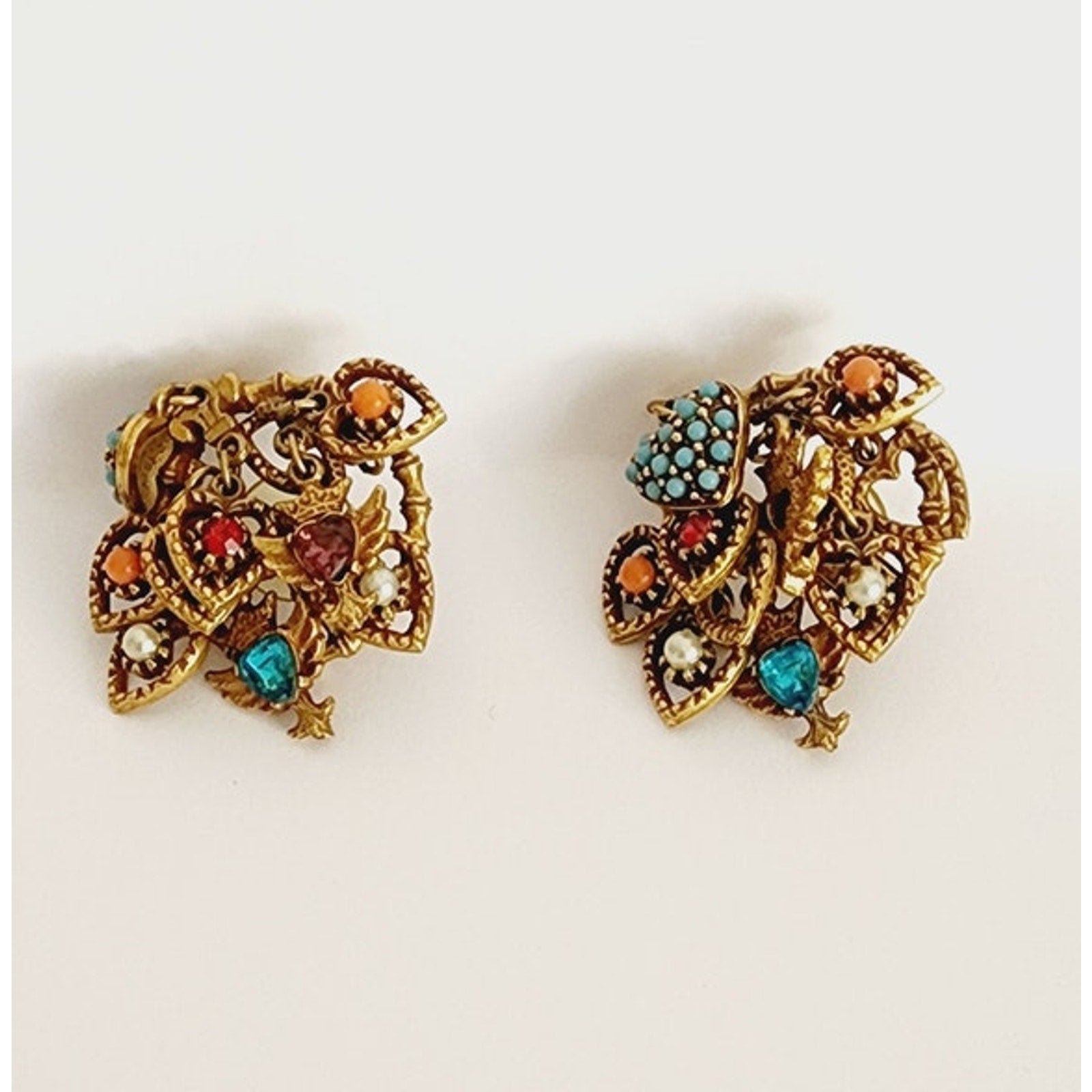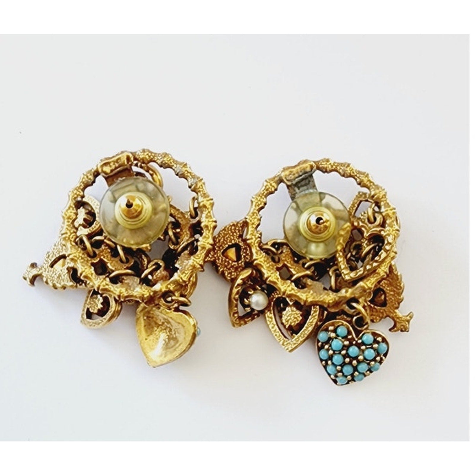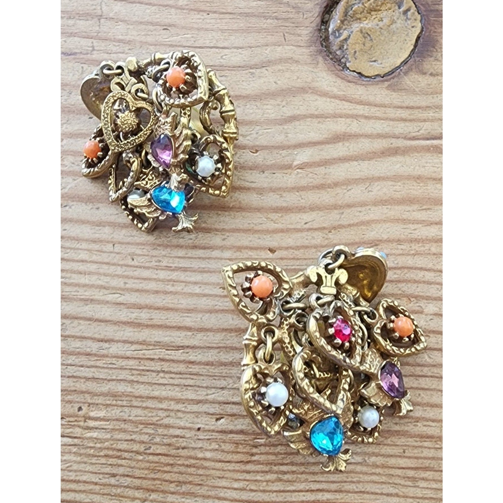 Unique cluster earrings that are circles from charms are suspended. Some are heart shaped some are wings with heart shaped stones inside them. Unique.