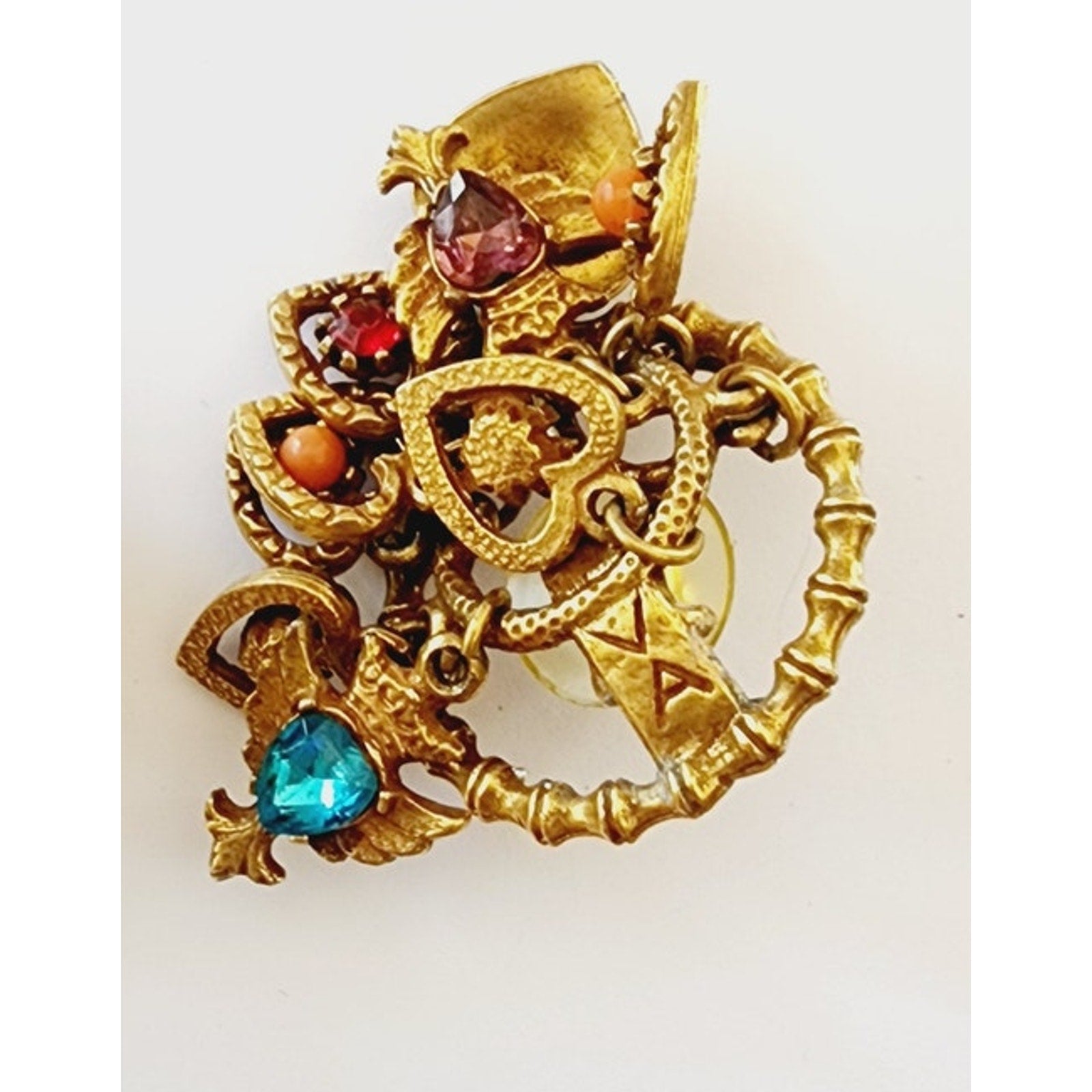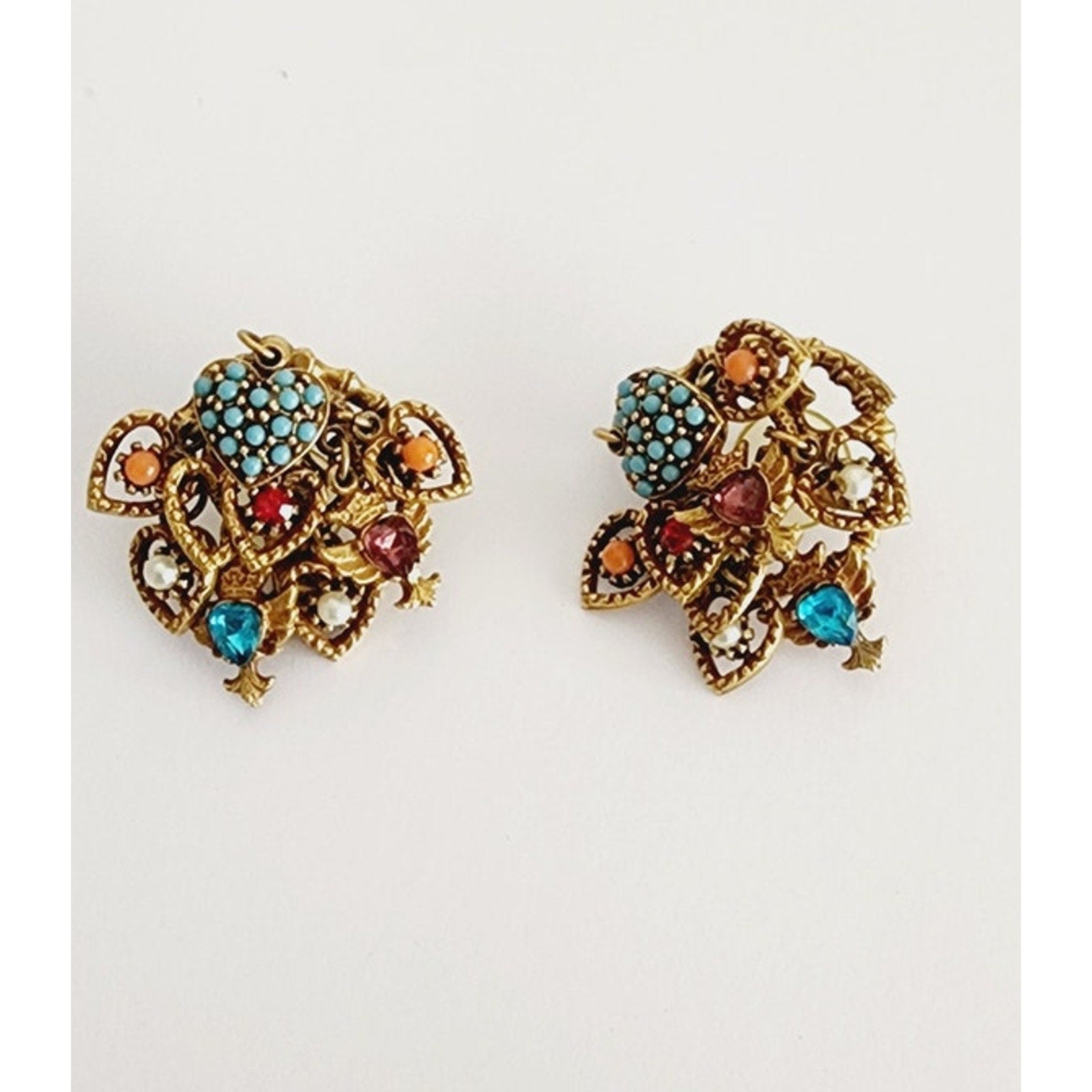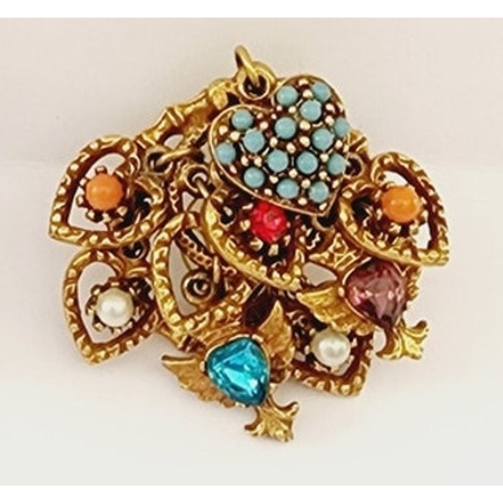 Unique cluster earrings that are circles from charms are suspended. Some are heart shaped some are wings with heart shaped stones inside them. Unique.
