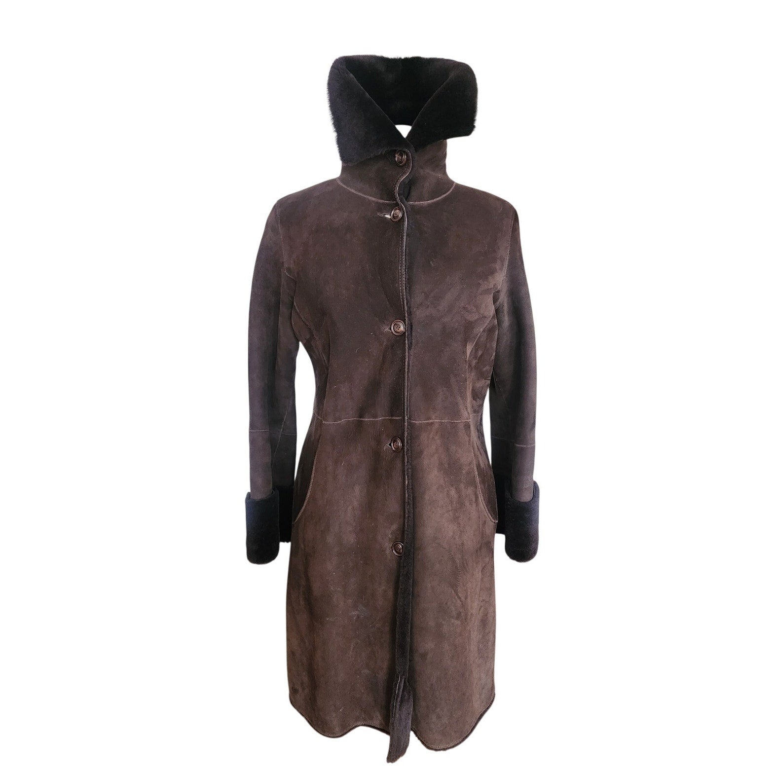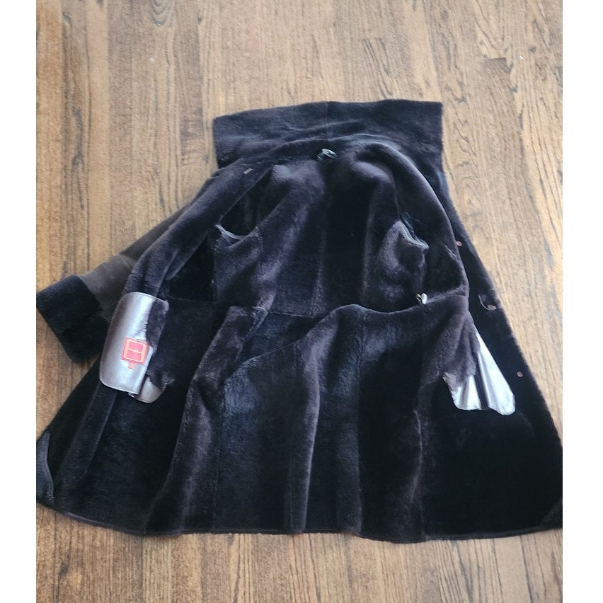 Hip length with a button down front this overcoat has a dark brown exterior and a chocolate brown shearling liner. Turn down the collars and turn up the sleeve cuffs to reveal the darker shearling underneath. Pockets at the hip fronts. Classic and extra warm!