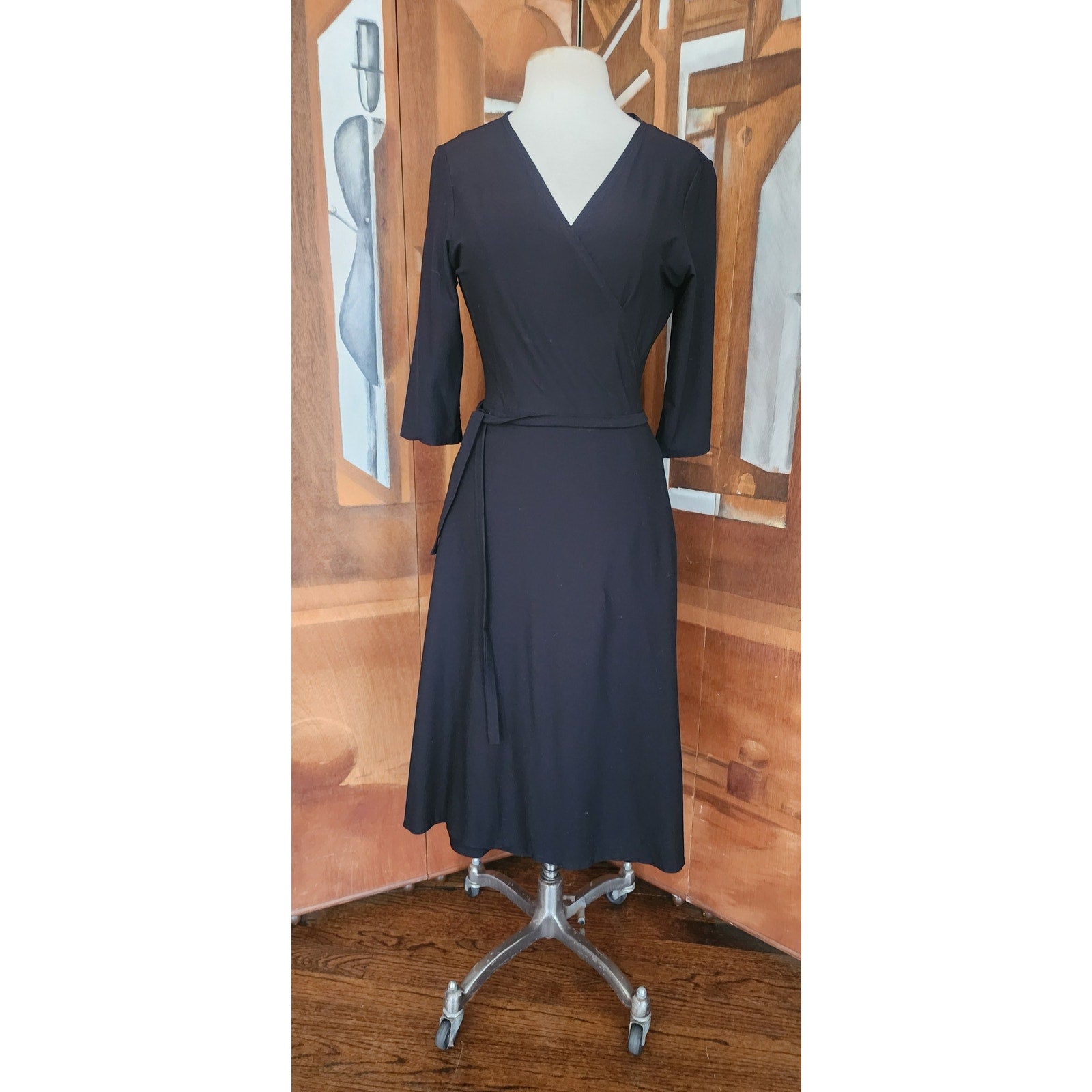 Vintage Eileen Fisher Y2K Black Rayon Stretch Knit Wrap Dress Midi