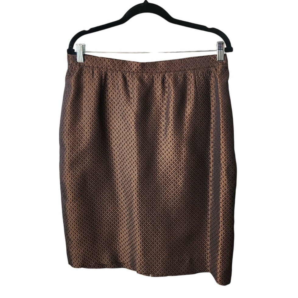 Classic knee skirt n a textured brown metallic fabric with a crisscross pattern that is subtle and shimmery. Slit at rear center. Closure is a zipper at the back. Fully lned.