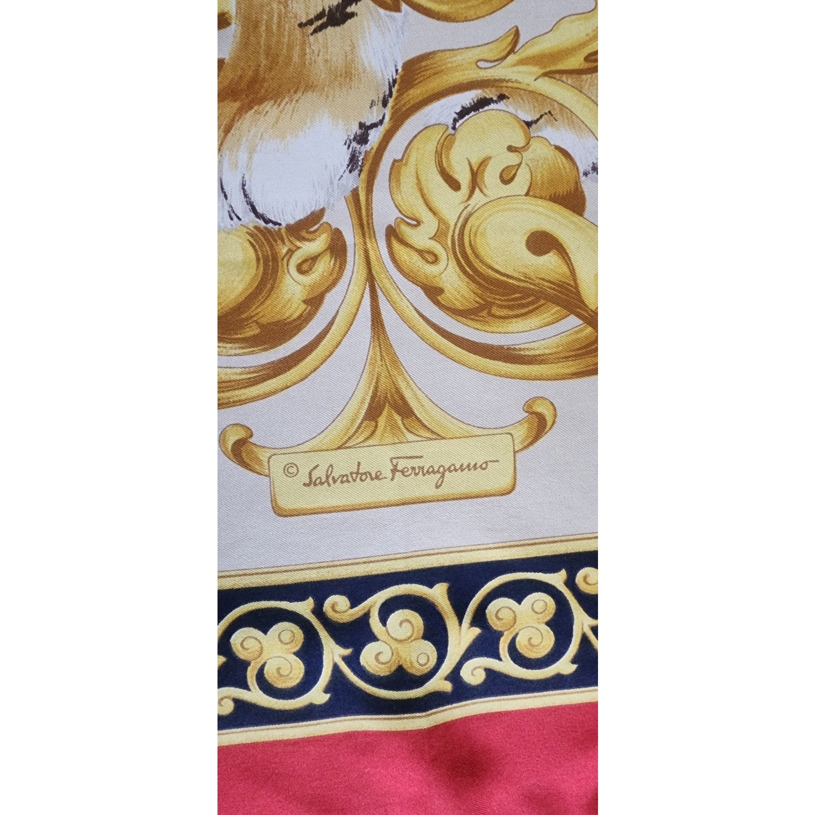 Square shaped with a large red border. Image in a tiger surrounded with golden scroll work in a baroque style. Ferragamo log is in a yellow cartouche at center bottom.