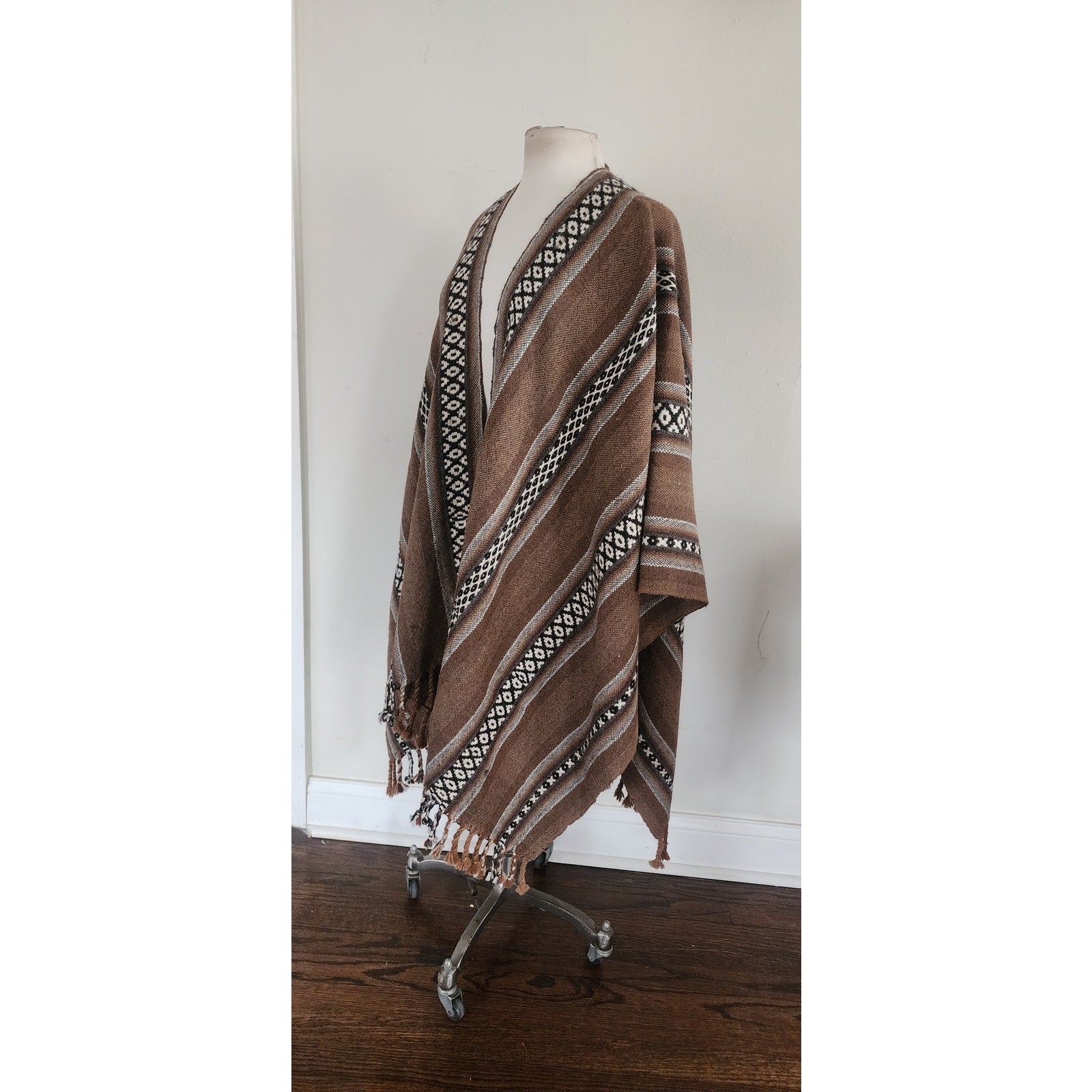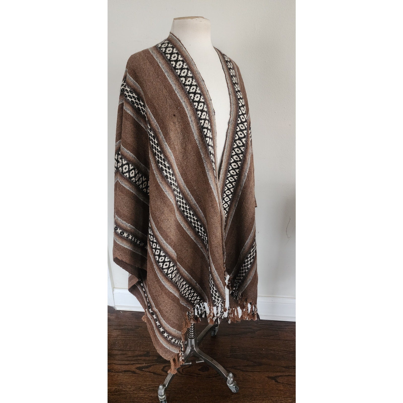 Soft and warm, this fringed, open-front wrap or cape style often referred to as a "ruana" or "poncho sweater". Unlined, hits at mid-calf. Shades of brown, gray, black, tan and white create various striped patterns from traditional Bolivian designs.