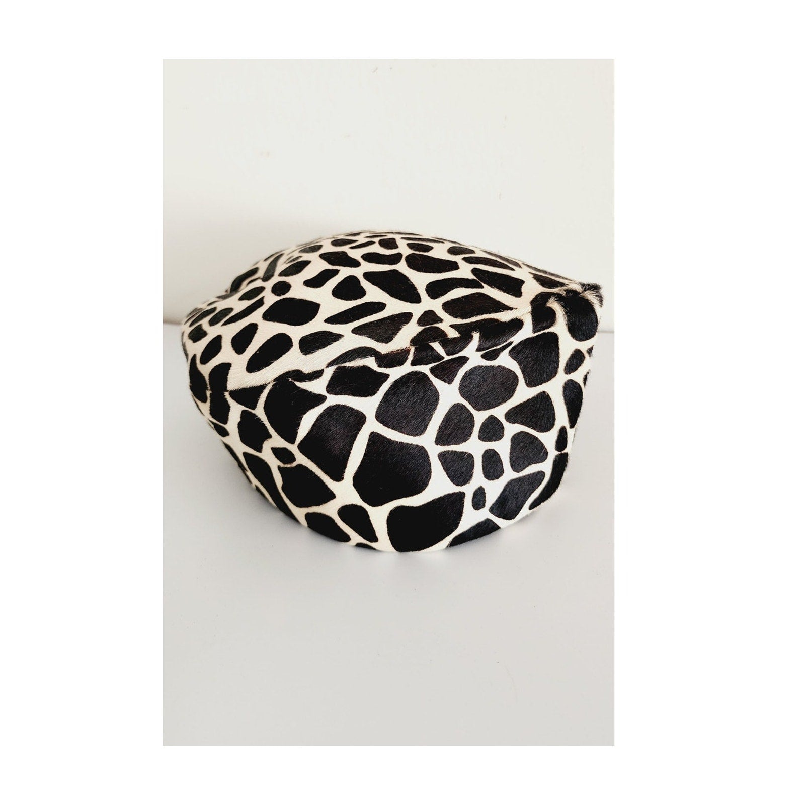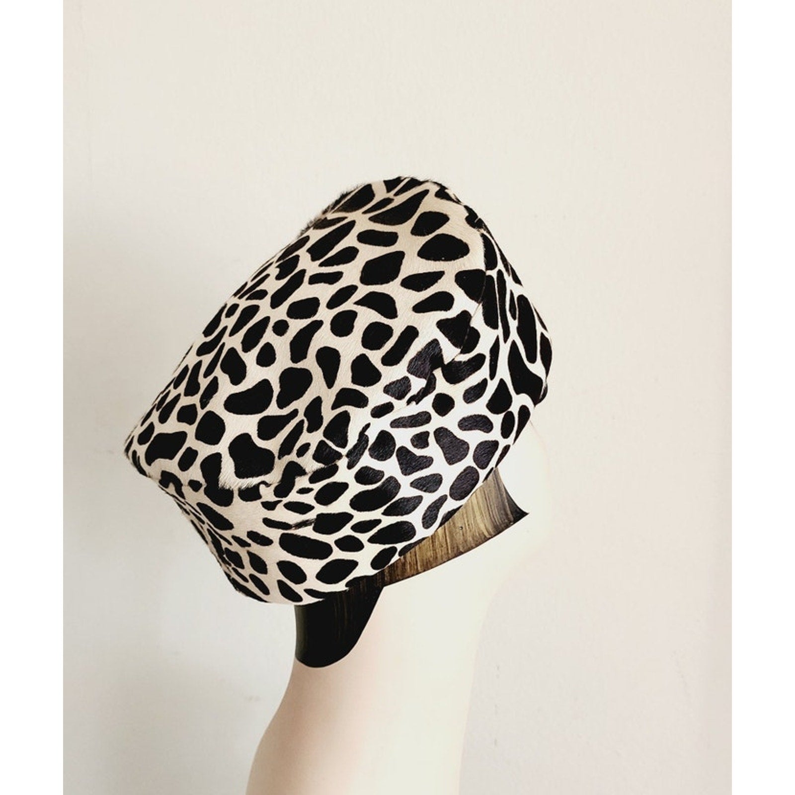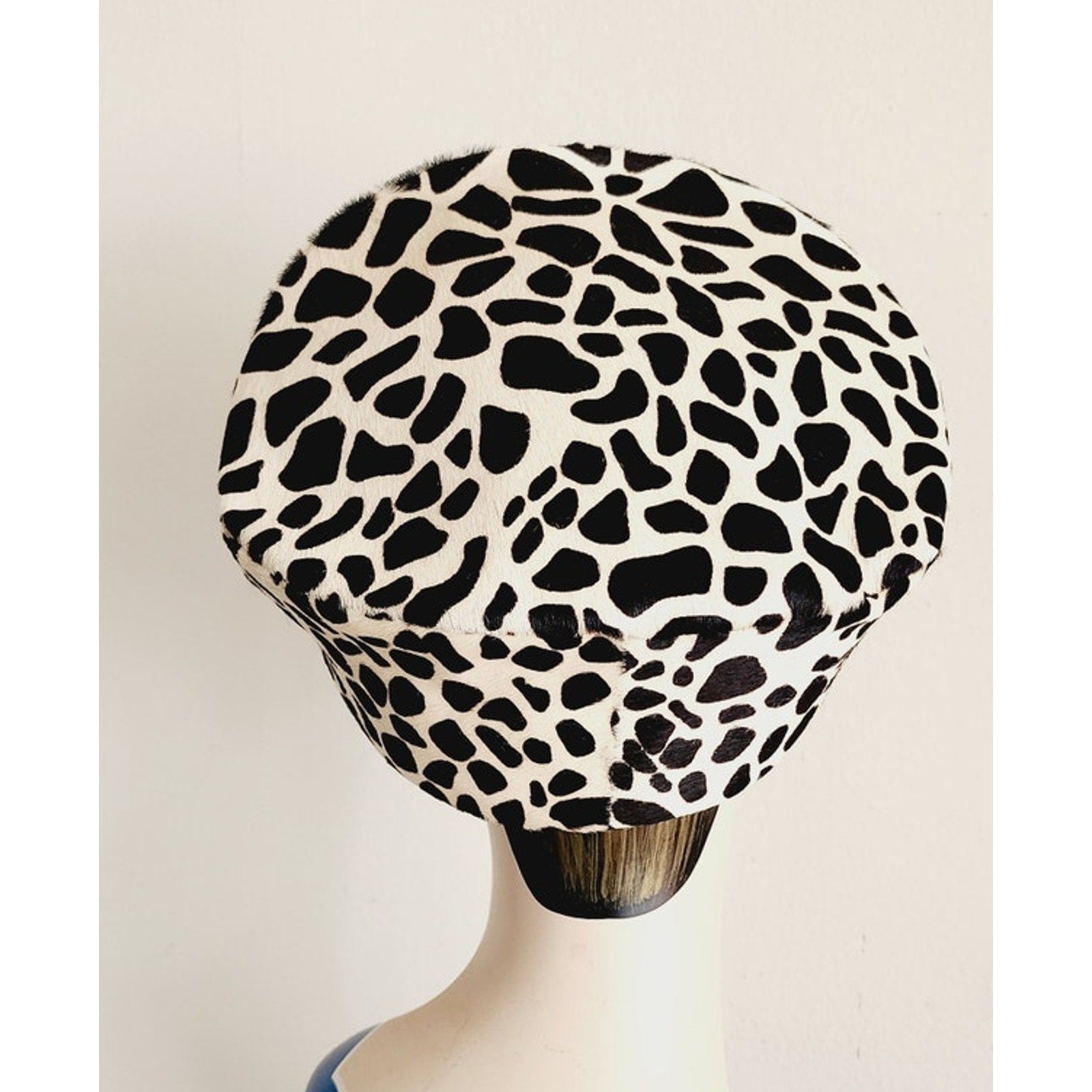 Toque shaped hat, out of dyed pony hide made to look like black and white leopard print! Round, soft body with an interior lining.