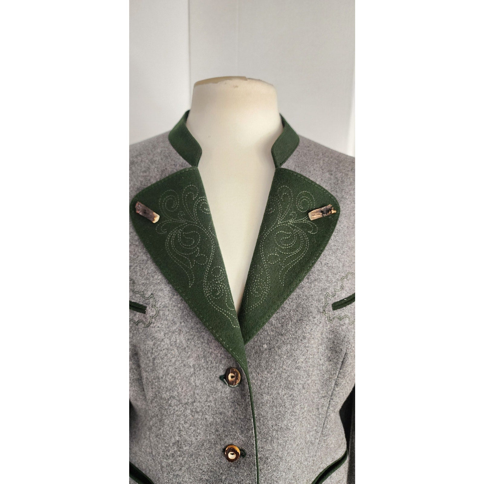 Classic, Austrian, equestrian jacket for a lady featuring embroidered green velvet lapels at the collar and real horn buttons. More embroidery appears around the slit pockets at the hip fronts. Darts at the chest and princess seams along the torso and rear create a fitted and flattering look. Note the decorative green wool fkaos and button area at center rear.