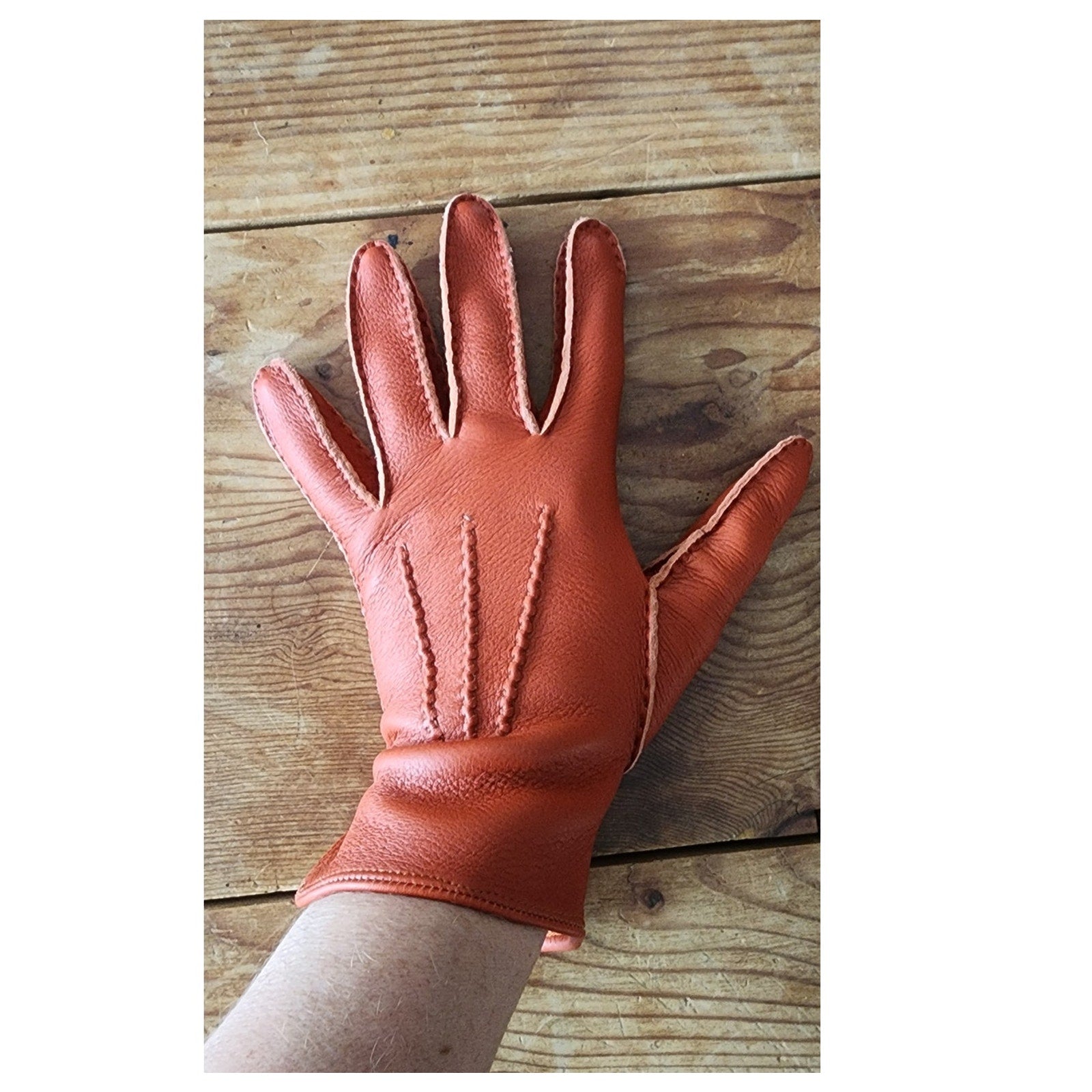 Classic, exquisitely made ladies gloves. Wrist length with orange leather exterior and soft suede interior. Accent stitching around the fingers and across the top in three row.