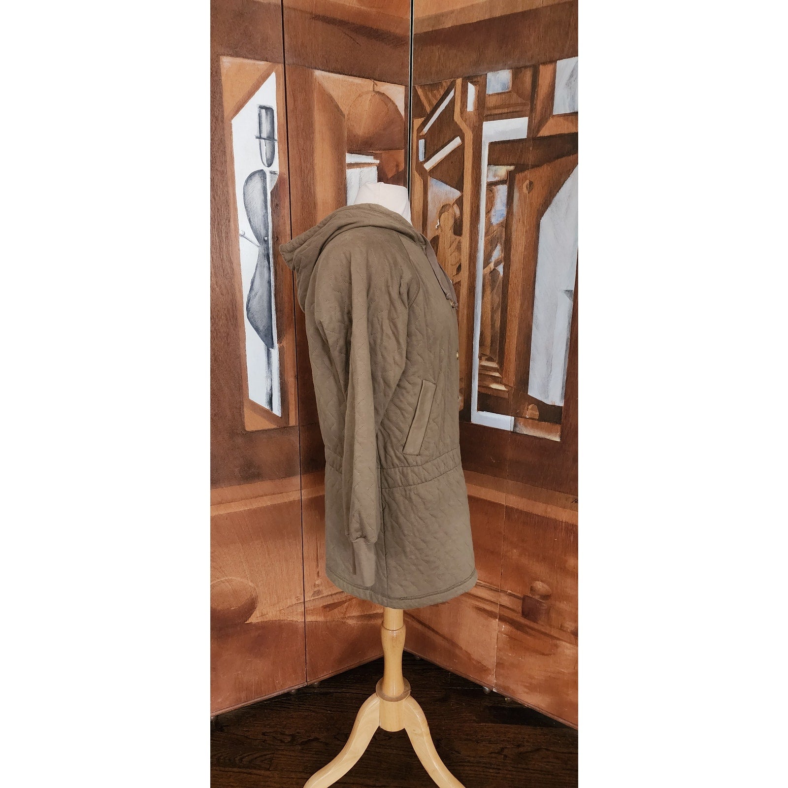 This mid-length jacket features a quilted brown fabric with a diamond pattern and a relaxed fit. It includes a built-in hood with adjustable drawstrings and a full button-down front with gold-toned logo buttons. The waist is defined by a horizontal seam and internal drawstring for an adjustable silhouette. Long sleeves are finished with ribbed elastic cuffs, and it is fully lined. Soft and comfy. Cool olive green color.
