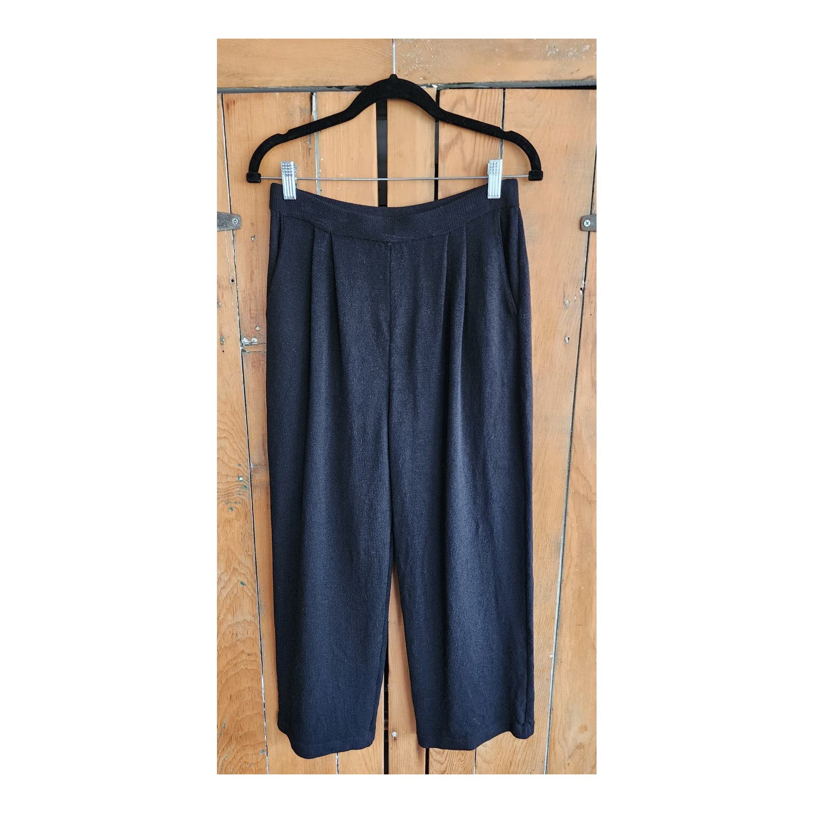 Classic, black knit slacks on an elastic waist, with slit pockets at the front hips and gentle pleating at the front. Leg is cut straight down the leg. Unlined, soft, comfy, and extremely well made as are all the knits by St. John!
