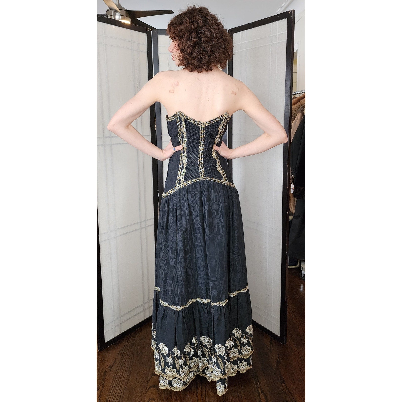 Attention dark princess! This is your dress! Strapless, with a sweetheart neckline, it has a fitted bodice and a dropped waist, followed by a voluminous, ankle length skirt. Black, waterfall taffeta serves as base while silver and gold embroidered trim cuts vertically down the torso, and then horizontally across the waist as well as at the bottom of the skirt where it transforms into an ornate floral frieze. Closes with a zipper down the side, the interior is fully lined and the torso has boning for structure. No tags.