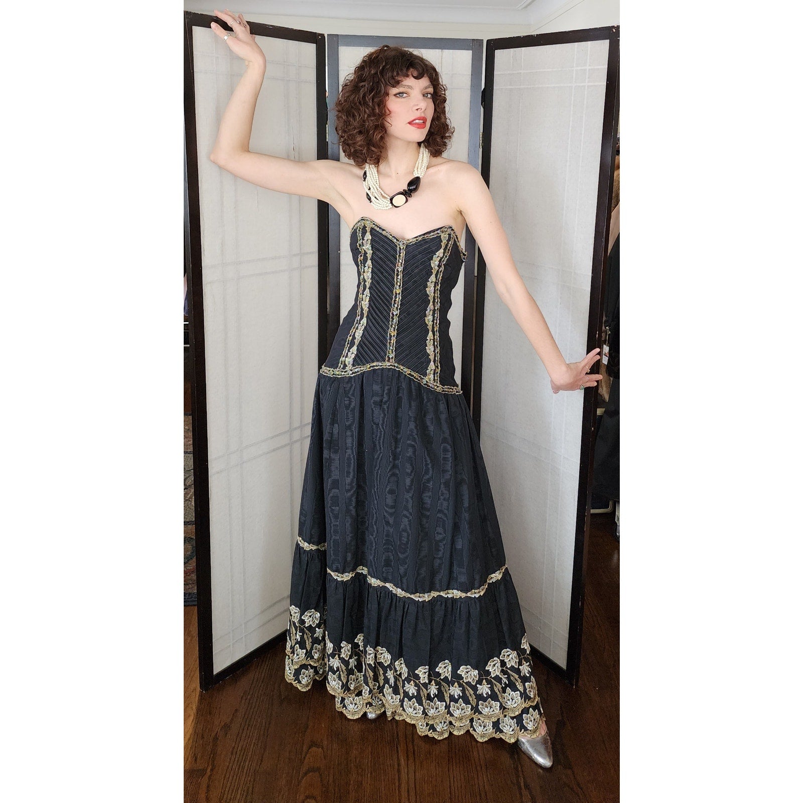 Vintage Strapless Evening Dress Black Gold Brocade Lace Trim