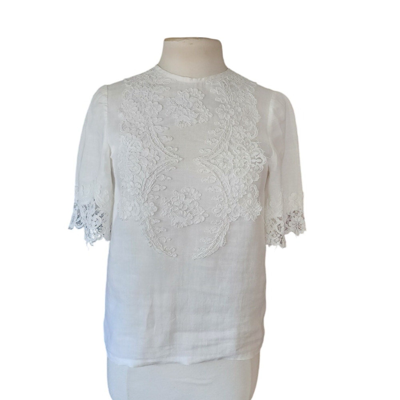 Vintage White Linen Blouse w/Lace Applique Short Sleeves / S-M