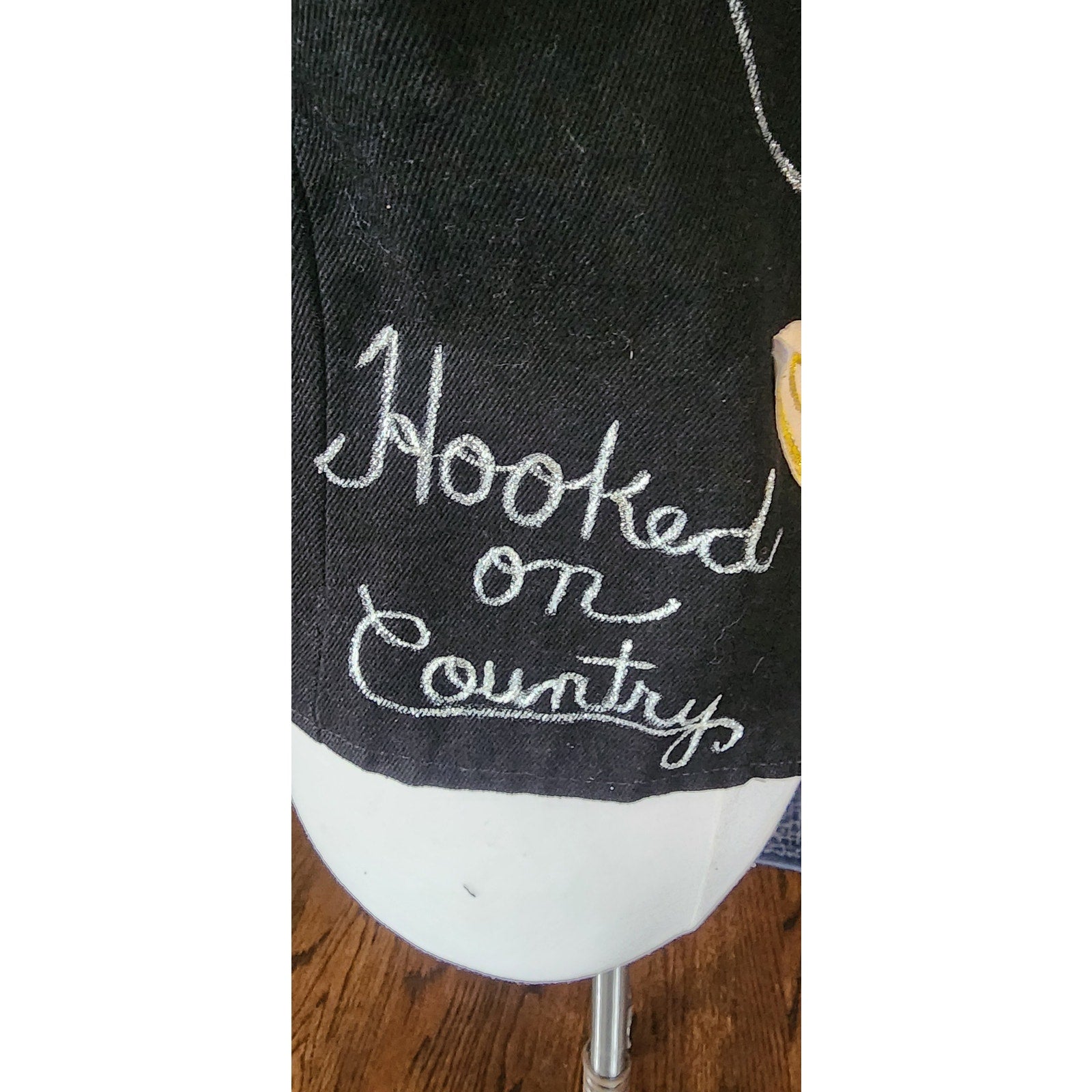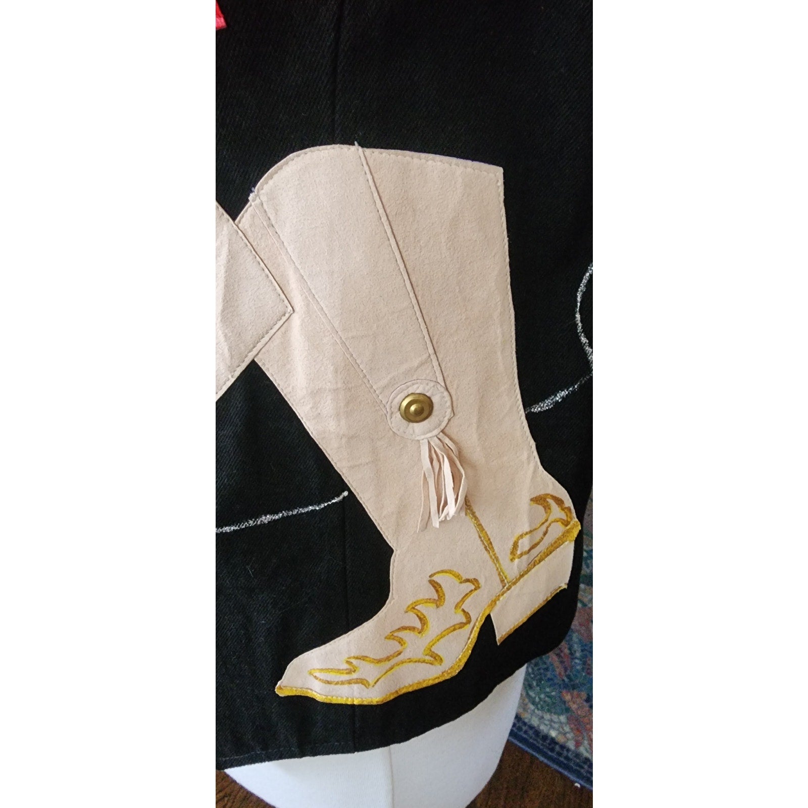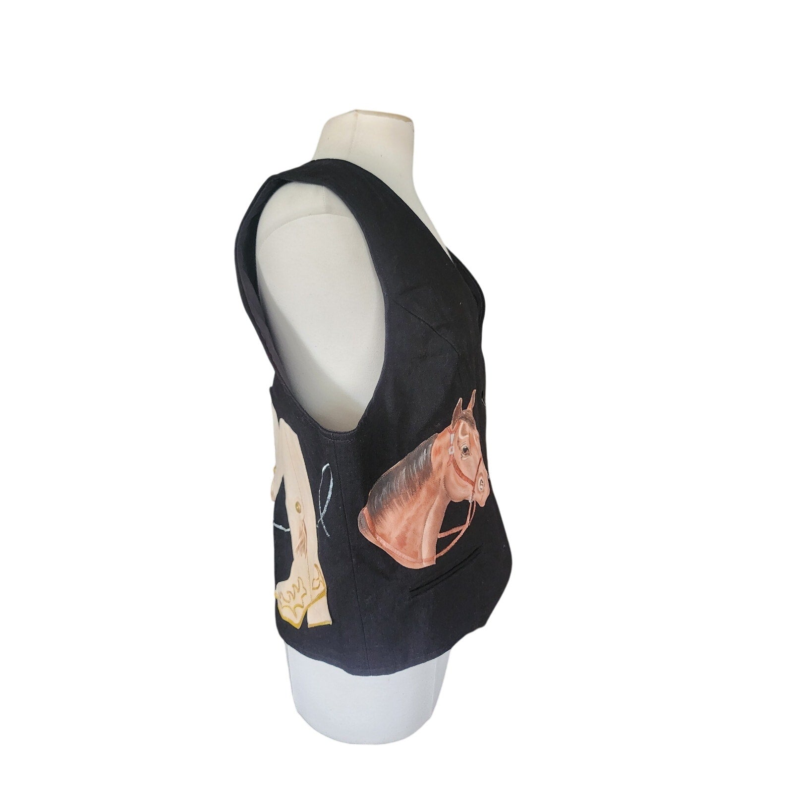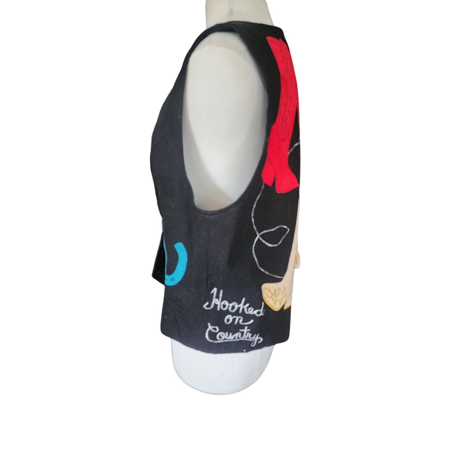 Handmade! Solid black denim vest with button down front, has handstitched applique at front of a horse's head and blue, interlocking horse shoes. Rear is a pair of white and red cowboy boots, with the white in calfiskin and featuring fringed tassels! Lower left side of back has the words "Hooked on Country" in cursive. Interior is lined.