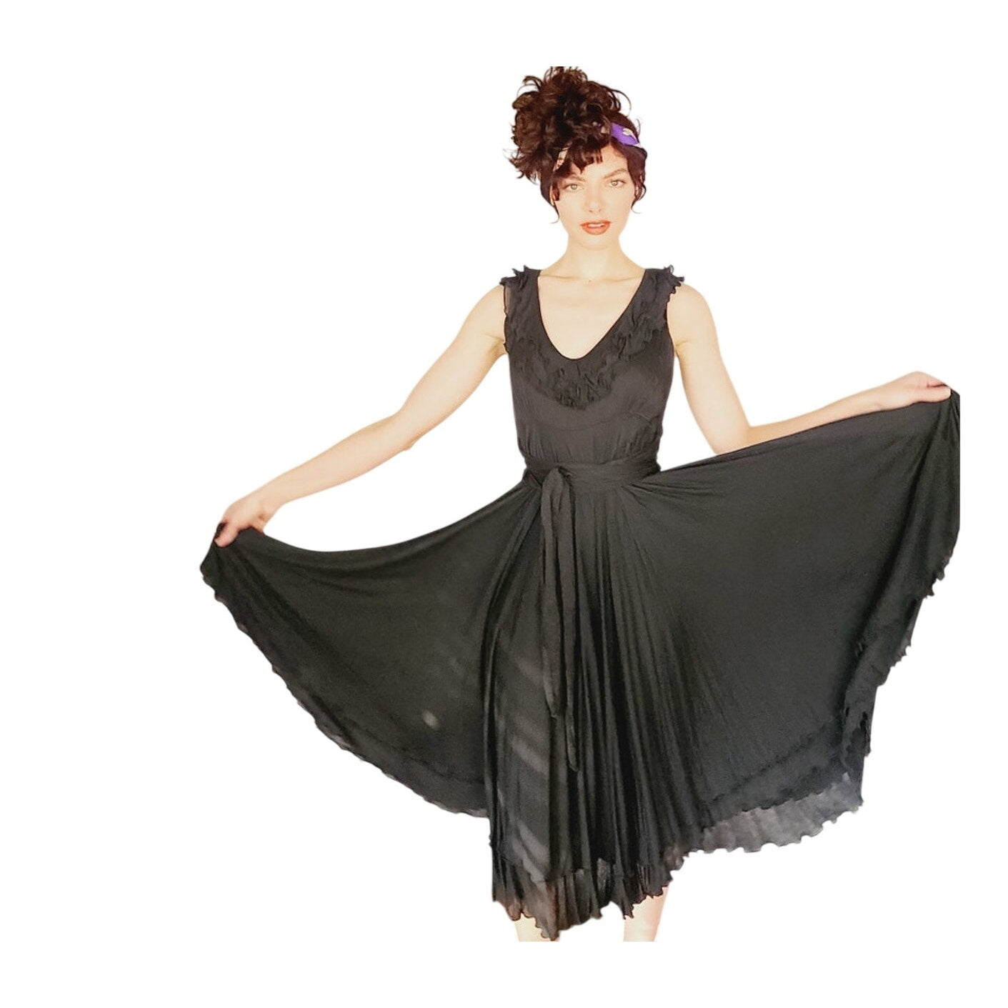 Sleeveless, scoop neck dress in a black, stretchy cotton-silk blend, it has a fitted chest, a nipped waist thanks to the voluminous, sash tie belt in silk, and two layers of a circle skirt with ruffled edges, falling asymmetrically shorter on the sides. Pulls on overhead.