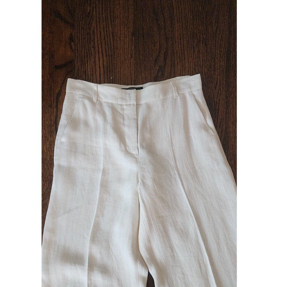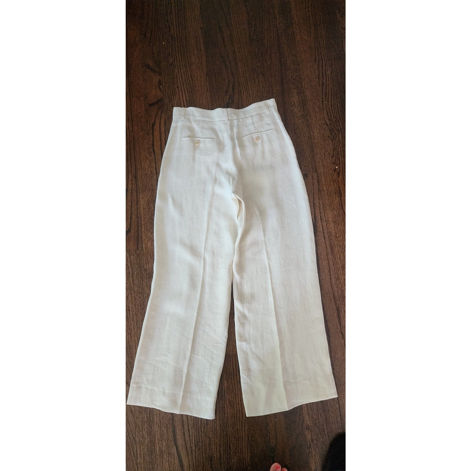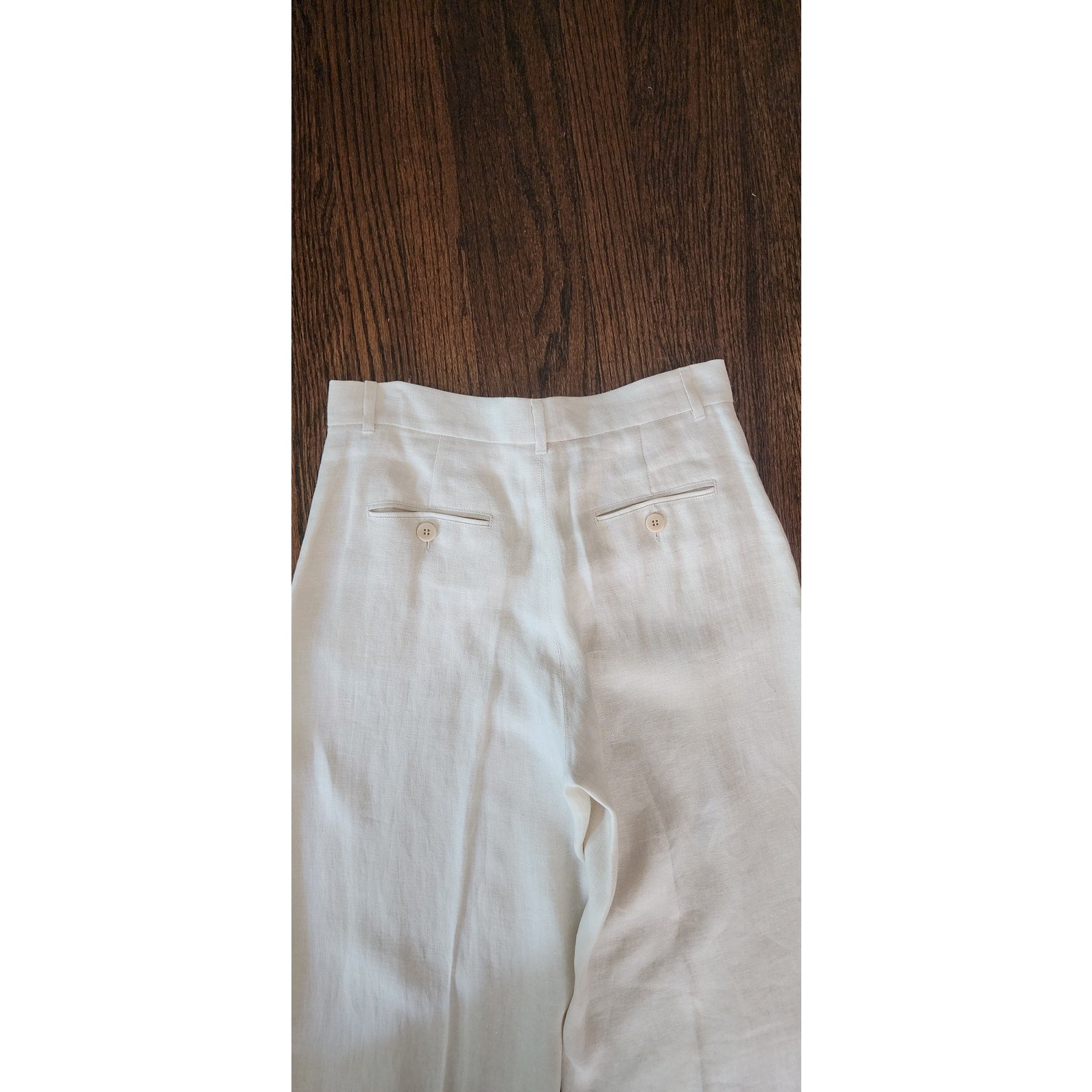 Classic, high waisted pants with belt loops and a flat front with hip front slit pockets and buttoned pockets at the rear. Crisp linen has front and rear pleat going down the leg. Unlined. Closes with a central front button-fly.