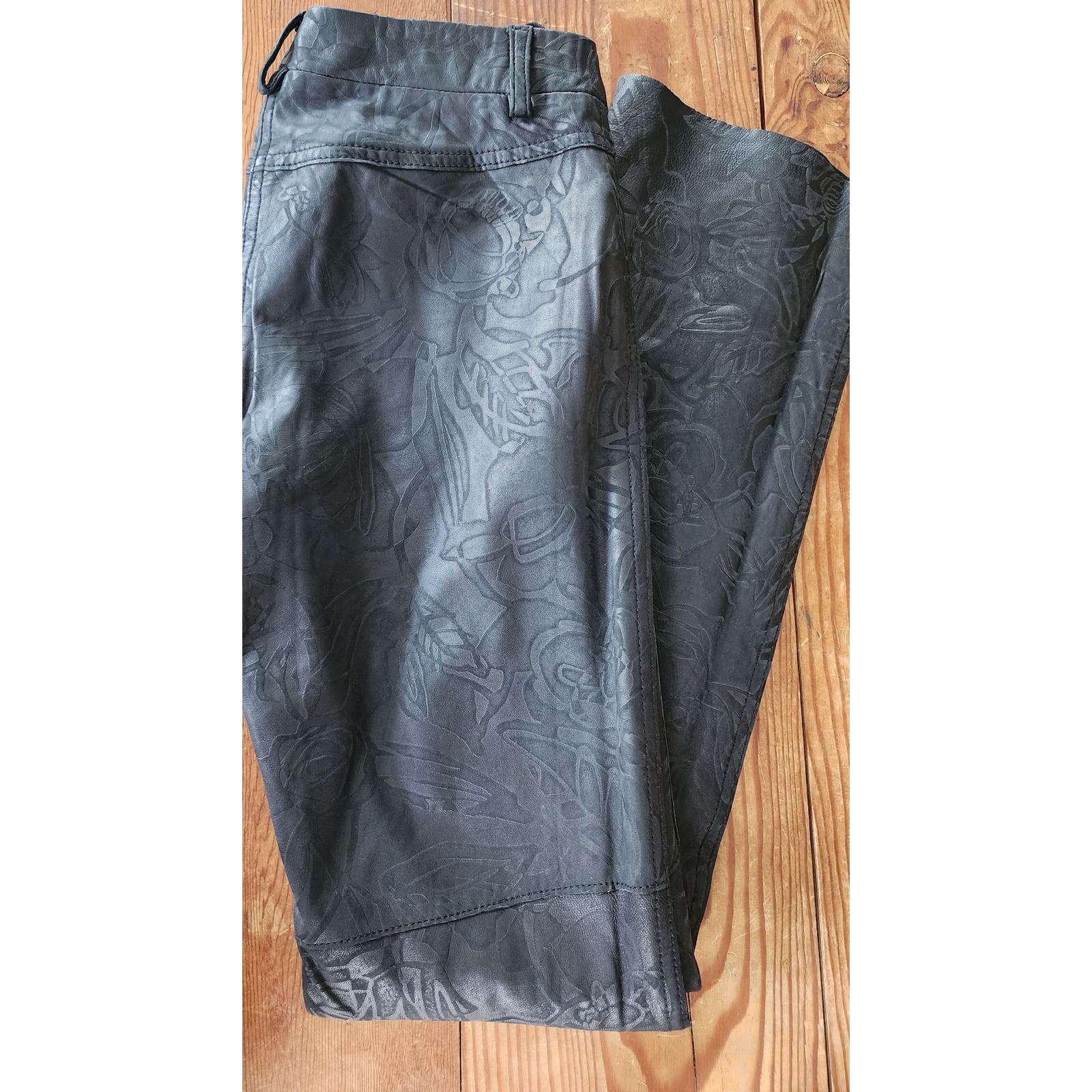Slinky, boot cut, low rise pants in black leather embossed throughout with a flower pattern. Feature pockets at the hip fronts and belt loops at the waist. Closes with a zipper-fly. Unlined.