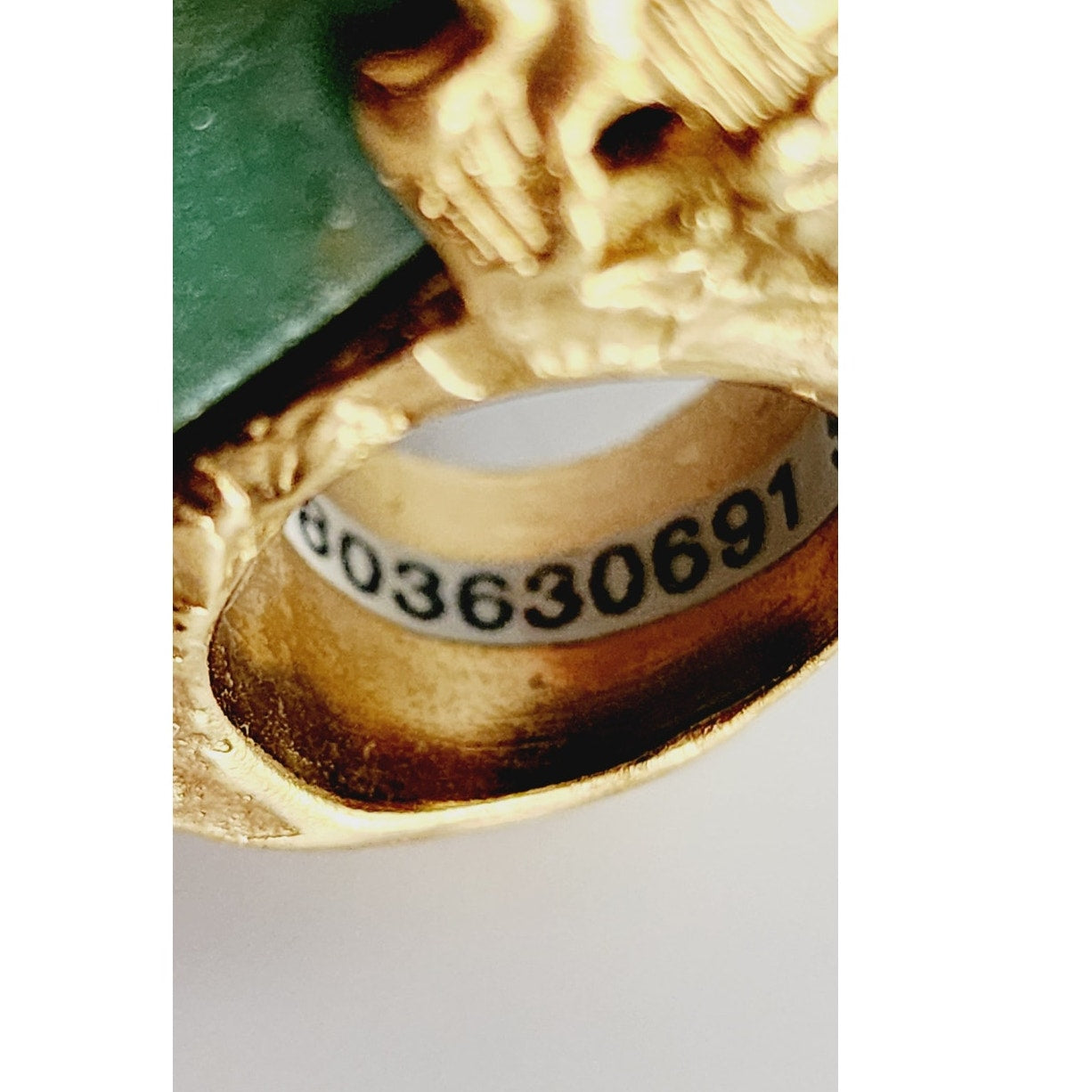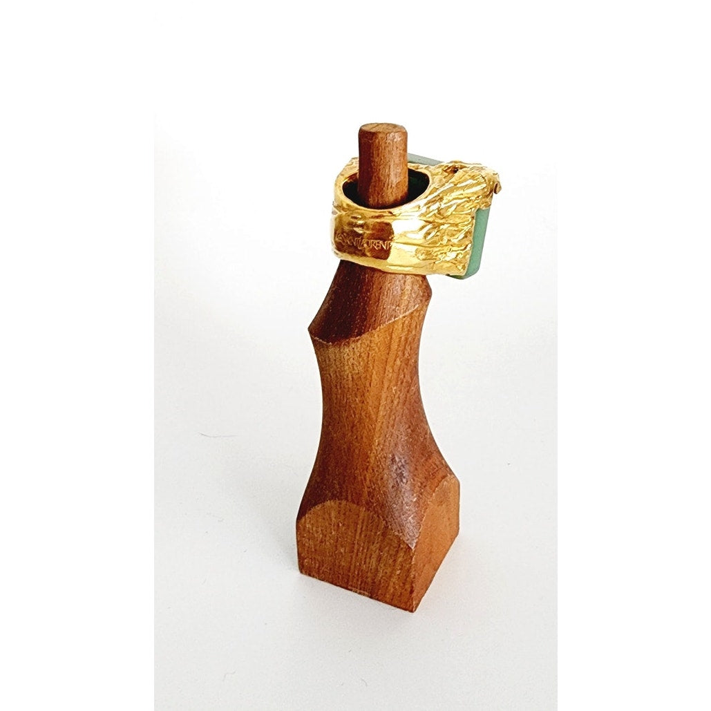 This unusual ring is dominated by a large, rectangular sea foam green/blue aventurine stone set into a chunky, gold tone base of hammered metal with thick sides that thin out toward the band. You can see the bottom of the stone from the interior under-base. Back of ring bears the prominent "Yves Saint Laurent" logo engraved. Interior has a price tag sticker of $425 plus a serial #. Easily removed.