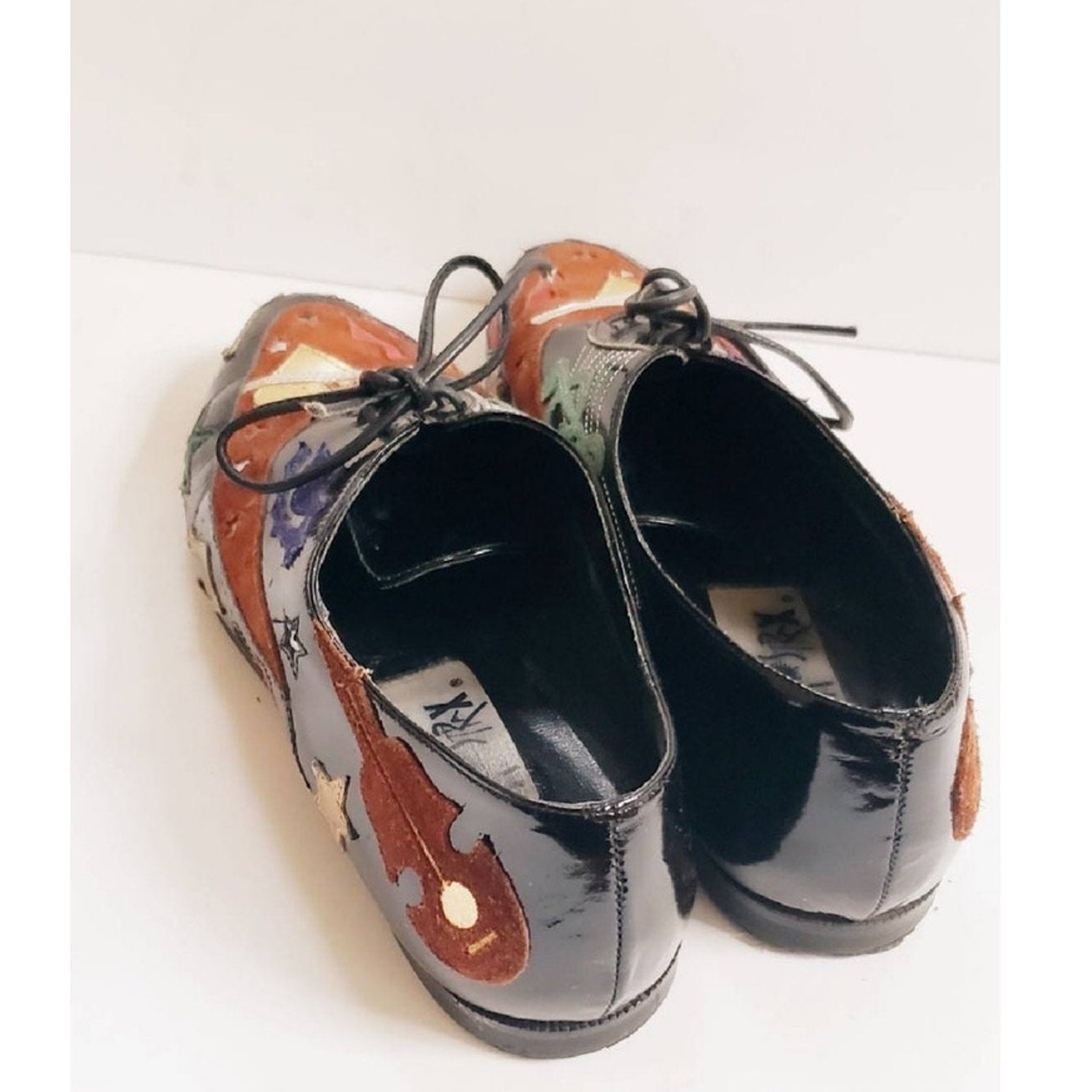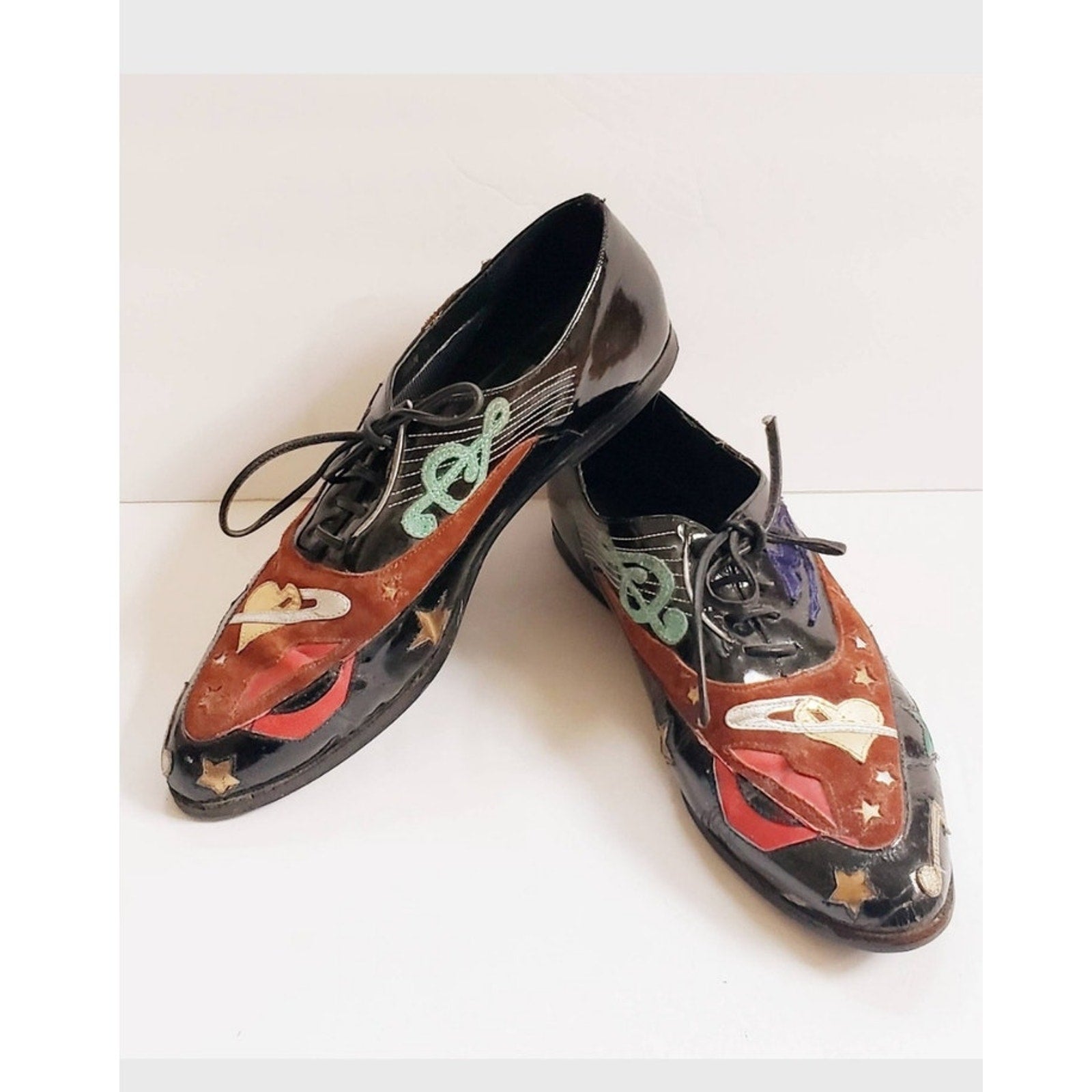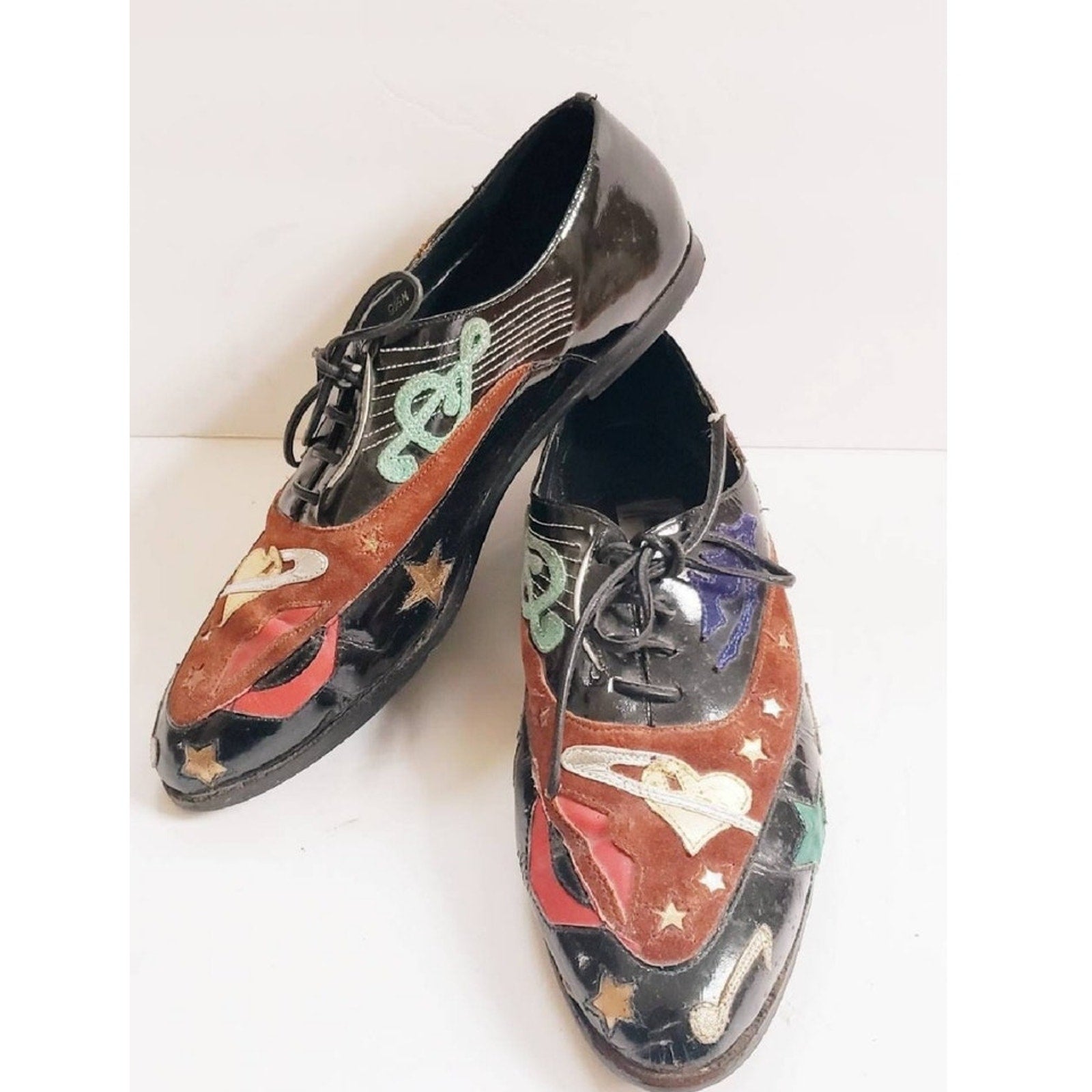 Rare, eye-catching black patent vinyl loafers with lacing at vamp, they feature embroidered applique in metallic fabric as well as suede. Motifs include treble cleff, lips, hearts, moon, stars, guitar and notes in brown, green, red, gold, brown, blue. Flat heel. Pointy toe.