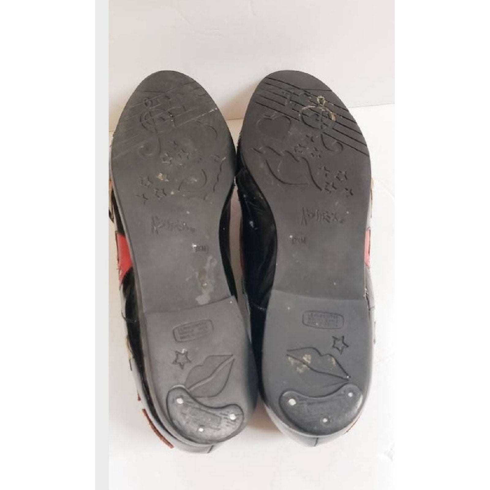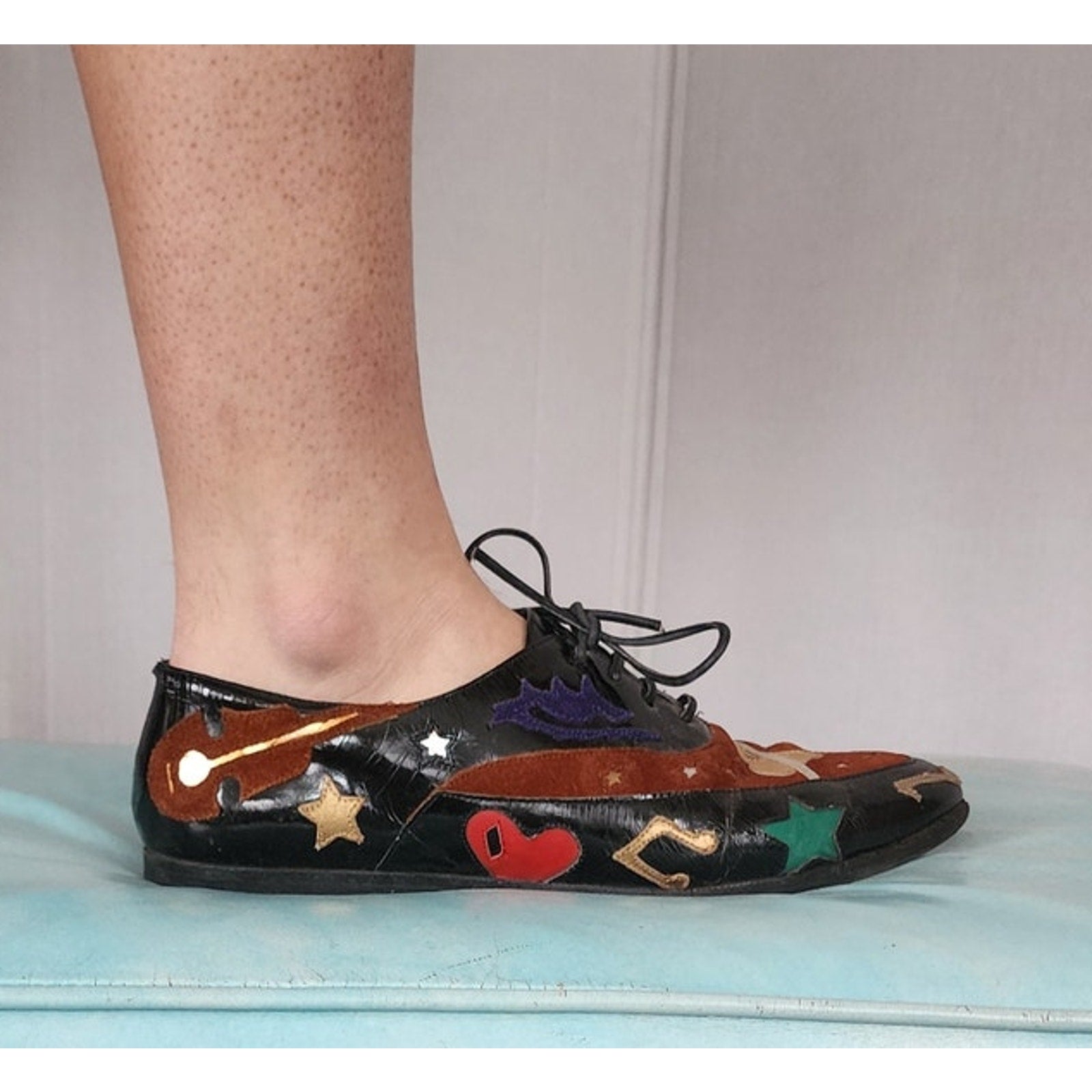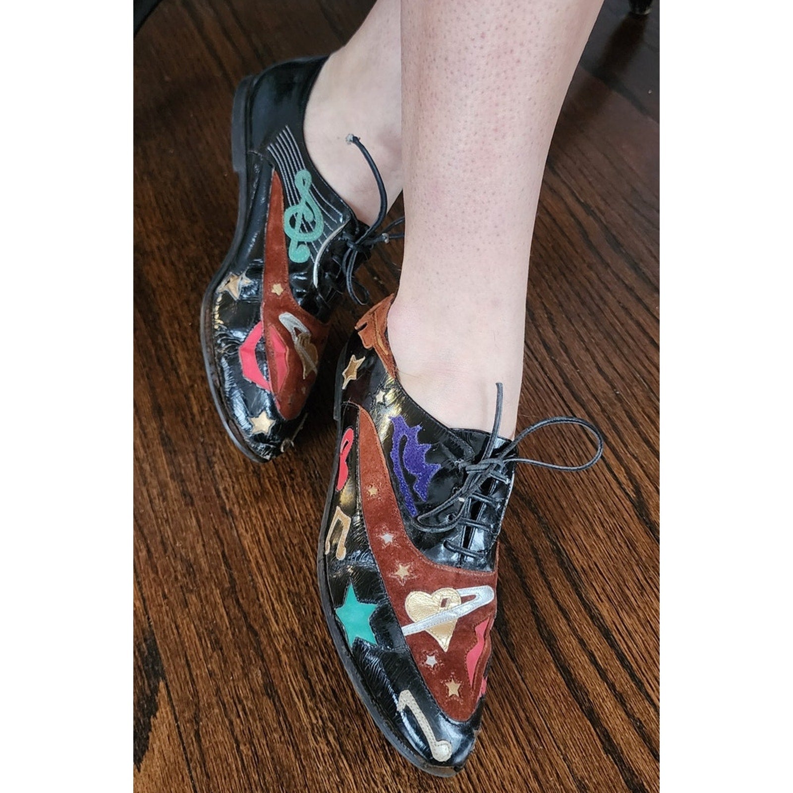 Rare, eye-catching black patent vinyl loafers with lacing at vamp, they feature embroidered applique in metallic fabric as well as suede. Motifs include treble cleff, lips, hearts, moon, stars, guitar and notes in brown, green, red, gold, brown, blue. Flat heel. Pointy toe.