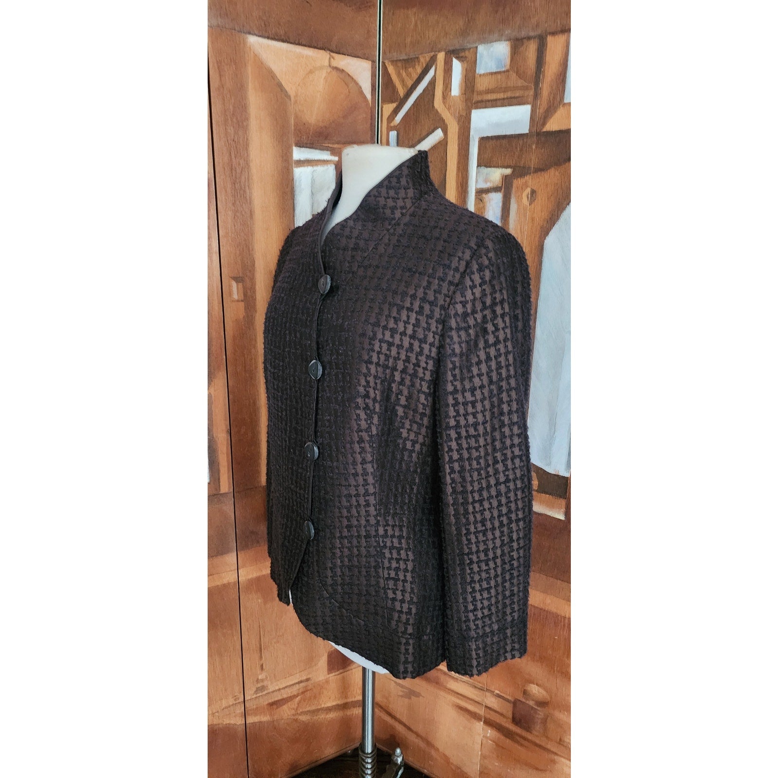 From 2006 (serial number on label gives it away), it features a rich brown and black houndstooth pattern with a subtle textured finish. The design includes a structured mandarin-style stand collar and a four-button front closure with dark, decorative buttons. Slit pockets at the hip fronts. Crafted from a premium wool and silk blend, the jacket has long sleeves and a tailored fit that provides a polished, professional silhouette. The fabric's unique weave creates a slight sheen that looks metallic in the right light. Fully lined.